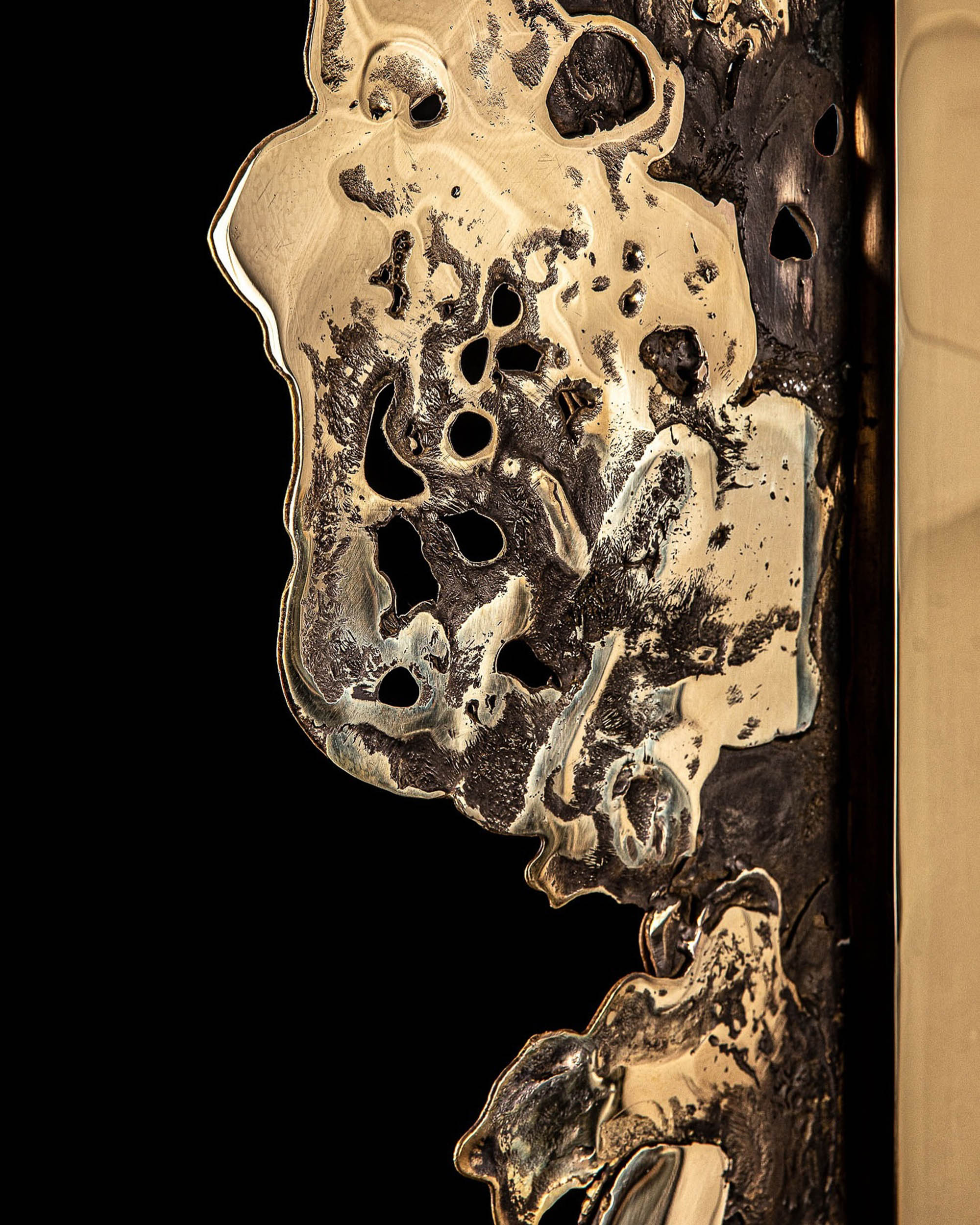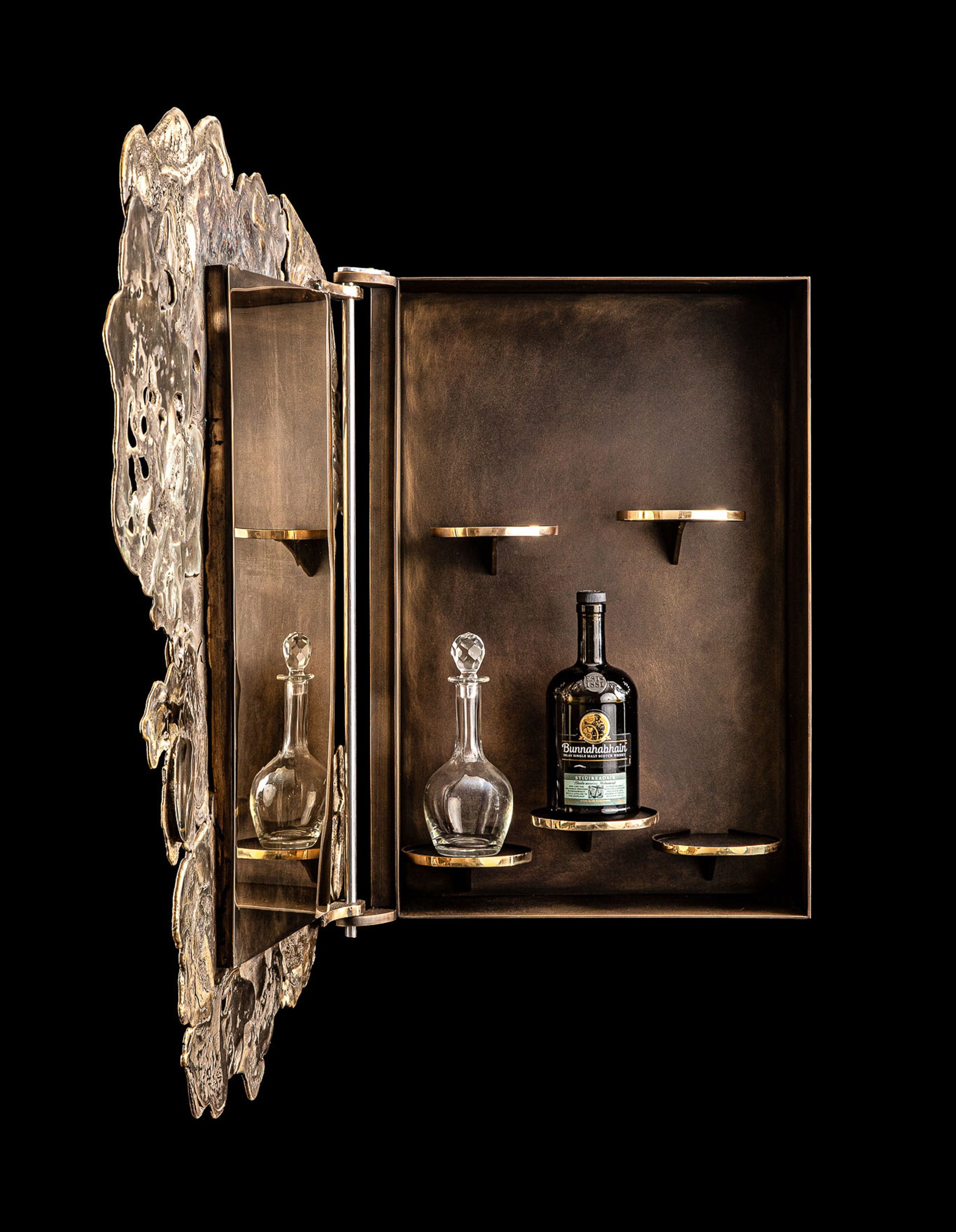 The Whiskey cabinet I masterfully intertwines elegance with the raw power of nature, inviting us to reflect on the beauty and sublimity that can emerge from chaos. The hand-cast brass exterior of the cabinet captures the chaotic and uncontrolled movement of lava post-eruption, lending it unique, organic texture that evokes the natural flow and form of molten rock solidifying into a rugged yet refined surface. Upon opening the cabinet, we encounter a thoughtfully designed and sophisticated interior with five shelves for bottles or decanters. a sharp contrast to the wild exterior, the refined interior creates a dialogue between chaos and order, nature and human craftsmanship. Handcrafted by tourain in Belgium, the whiskey cabinet is in limited edition