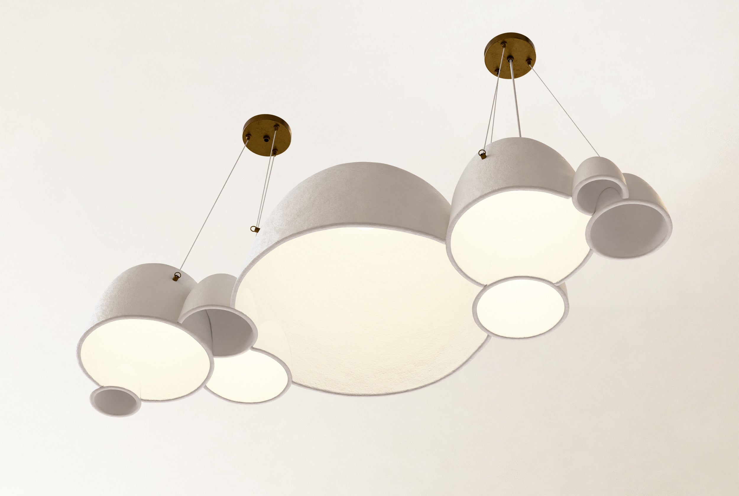 MADE BY HAND in the United States, each pendant is SCULPTED WITH A COMPLEX MIXTURE OF PLASTER, PULP, METAL, AND RESIN, with natural brass hardware. THESE MATERIALS ENSURE LASTING DURABILITY WITH A TACTILE FINISH. MADE TO ORDER, EACH work IS A NUMBERED EDITION, UNIQUE, and CUSTOMIZABLe