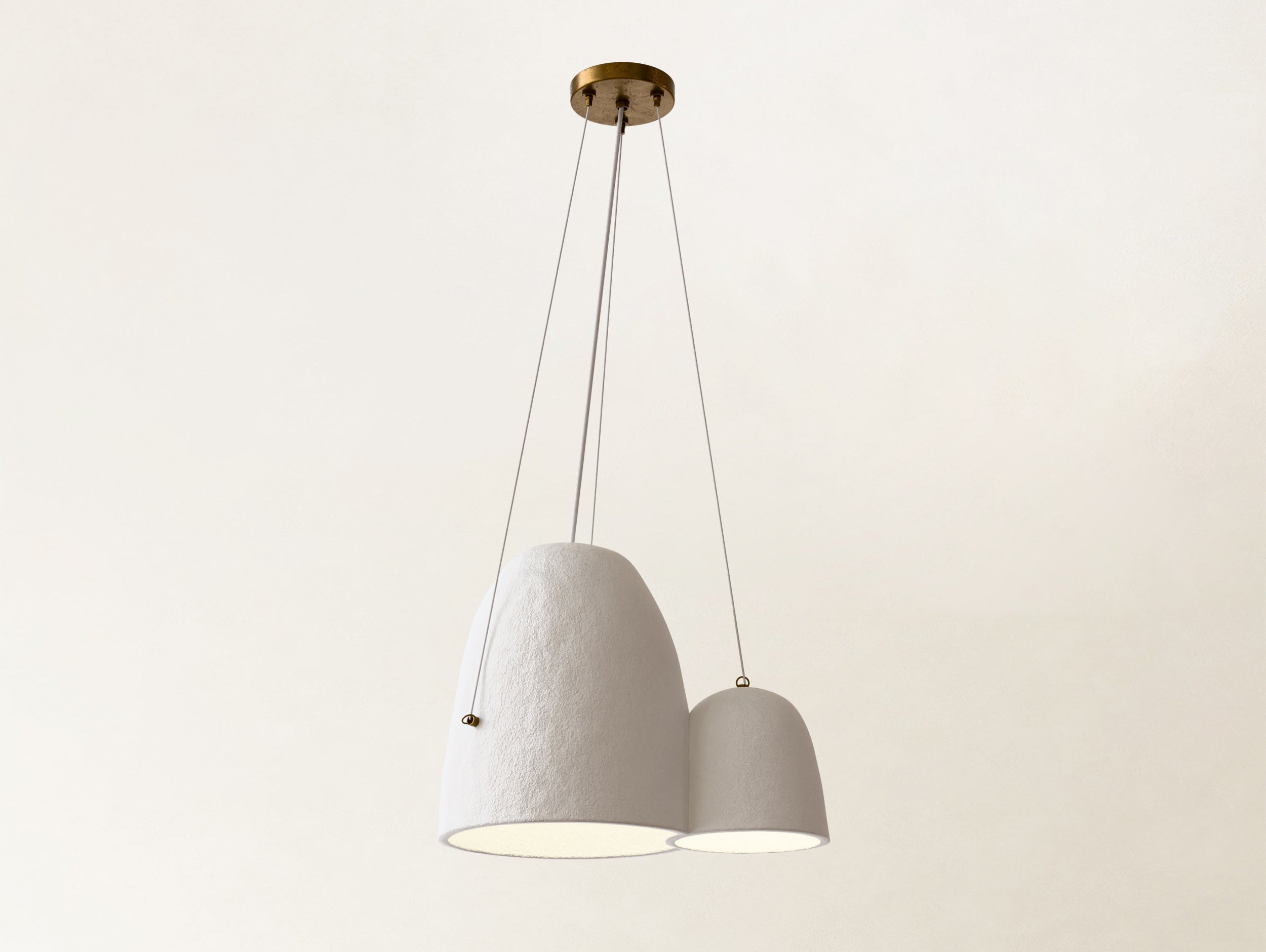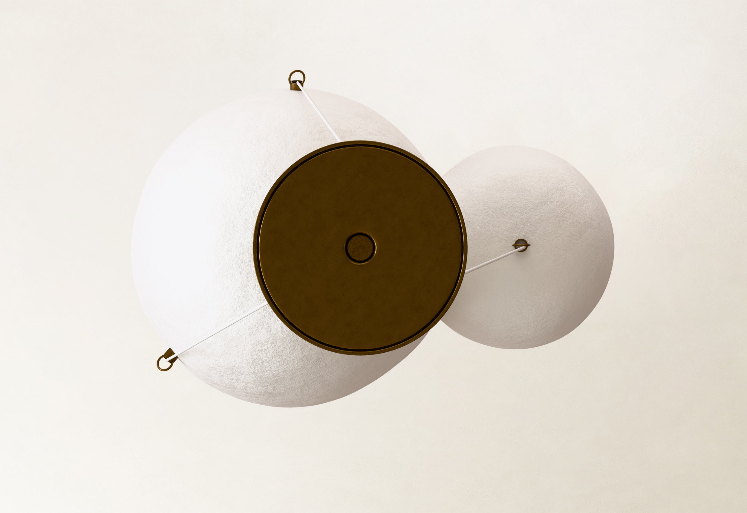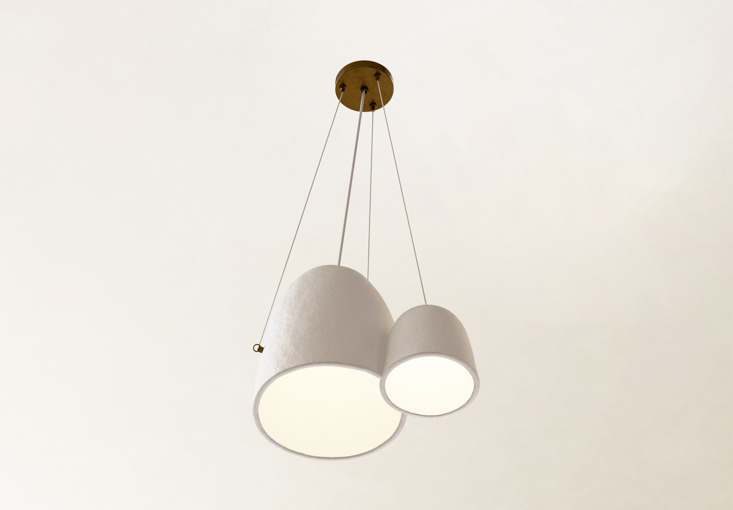 MADE BY HAND in the United States, each pendant is SCULPTED WITH A COMPLEX MIXTURE OF PLASTER, PULP, METAL, AND RESIN, with natural brass hardware. THESE MATERIALS ENSURE LASTING DURABILITY WITH A TACTILE FINISH. MADE TO ORDER, EACH work IS A NUMBERED EDITION, UNIQUE, and CUSTOMIZABLe