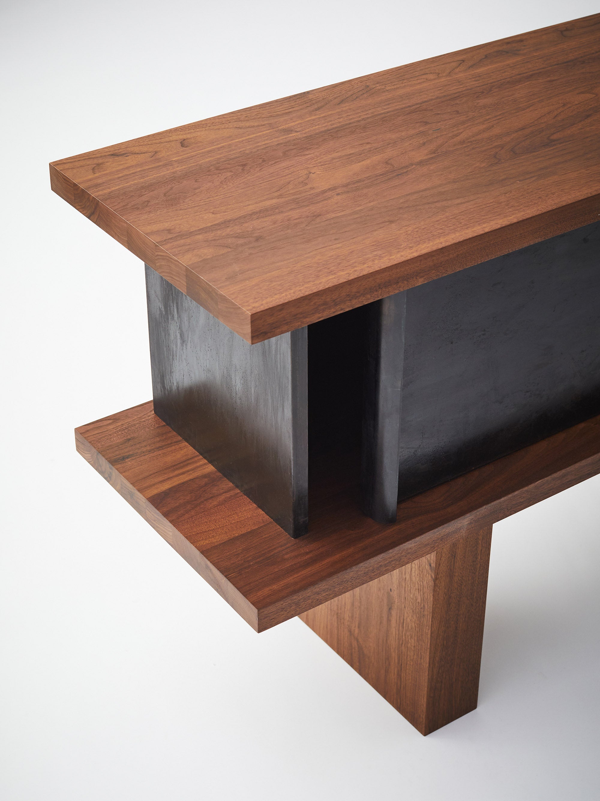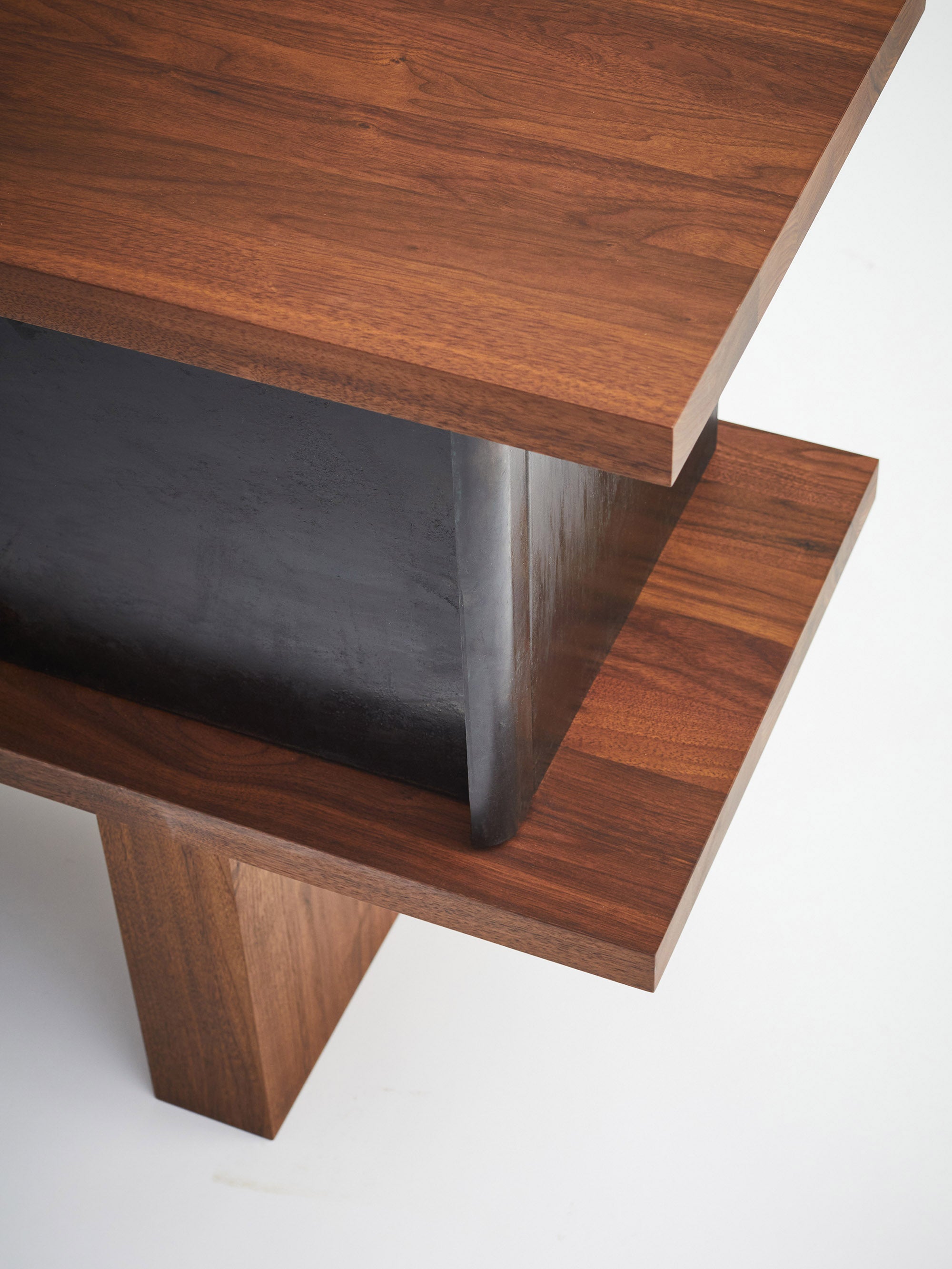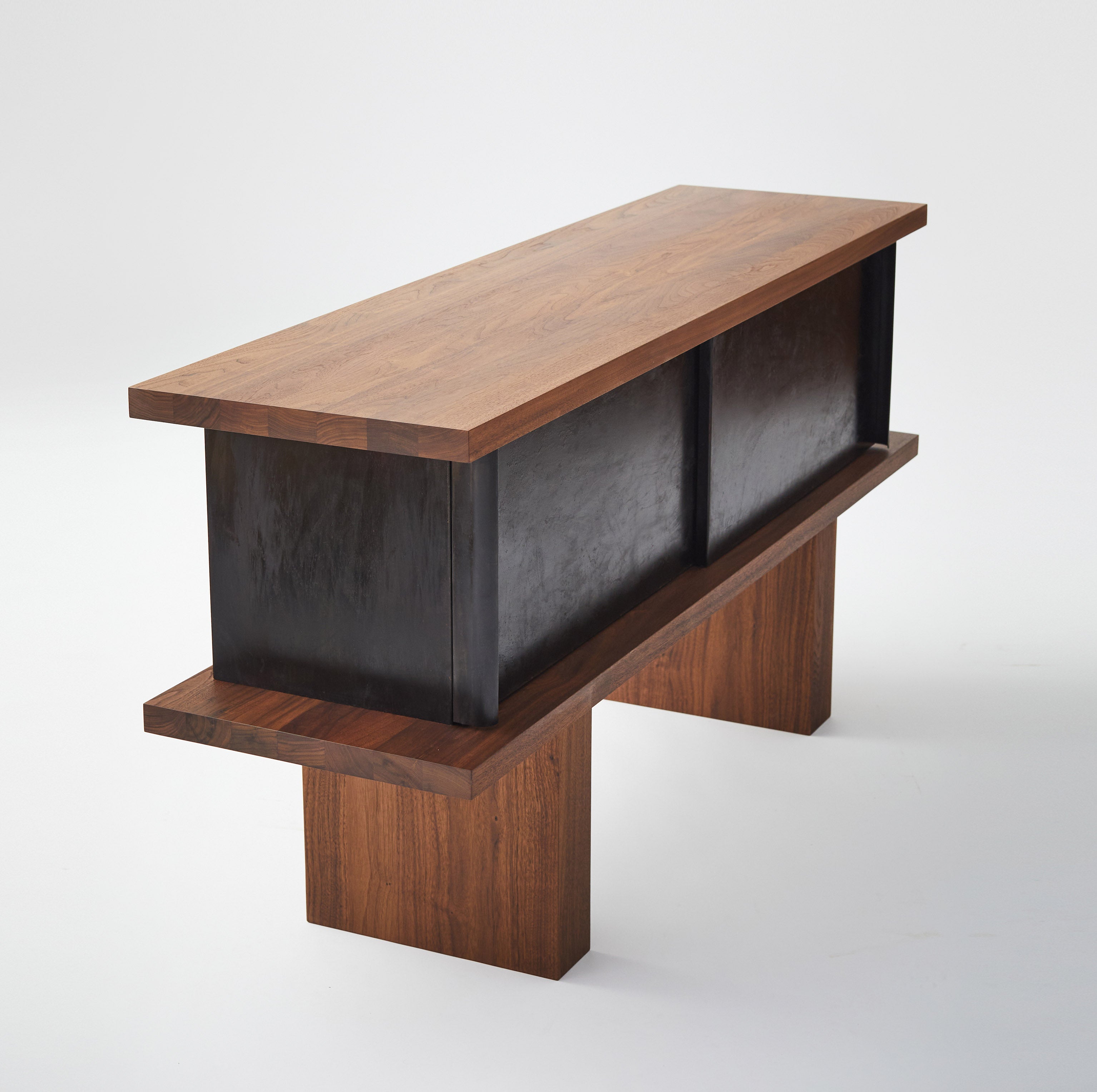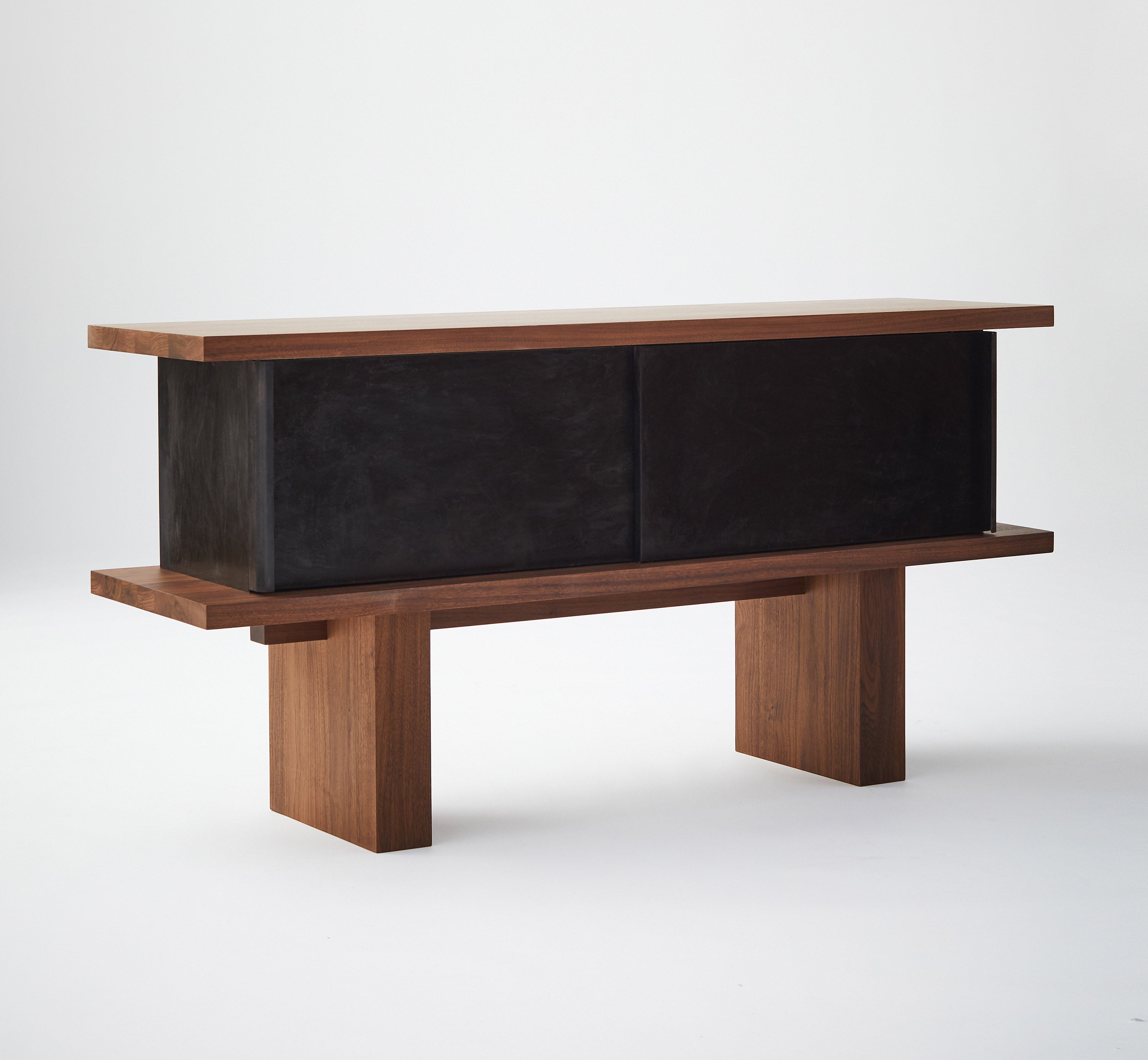 Walnut and mahogany are both superior timber, beloved by generations of furniture makers for their durability, stunning grain, and rich color. The simple, cubist structure simultaneously highlights the wood’s unmediated strength and beauty, along with its midcentury architectural heritage. This sumptuous wood sandwiches a steel case, which has been preserved and darkened to an entrancing sheen with a natural linseed oil finishing technique that dates back centuries. The steel volume opens with sliding doors to reveal capacious open shelving inside, a surprisingly delicate counterpoint to the robust exterior