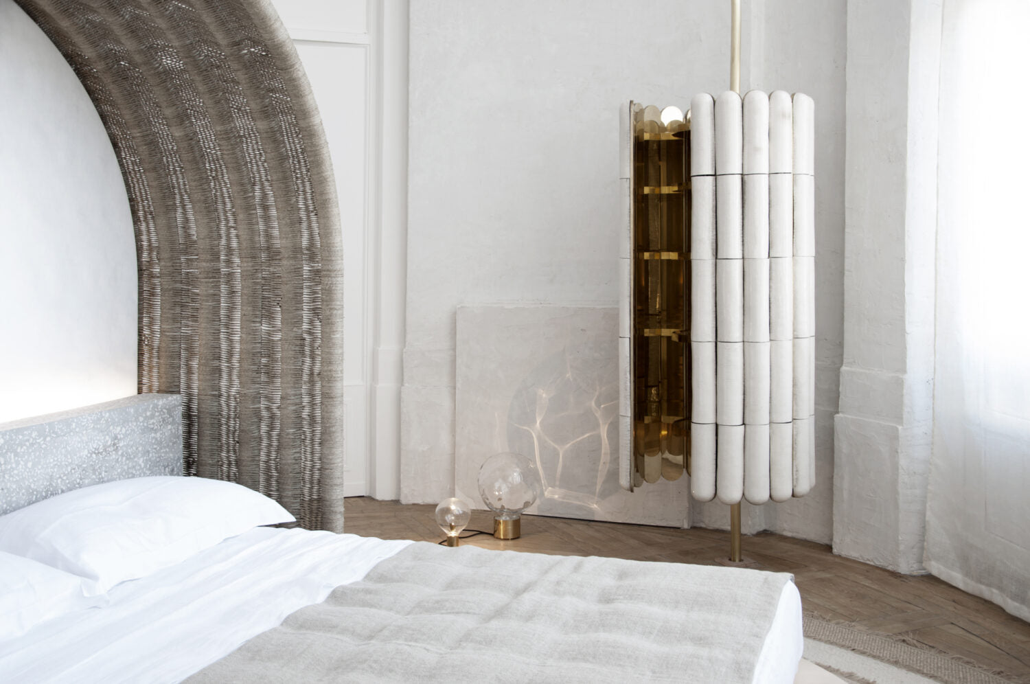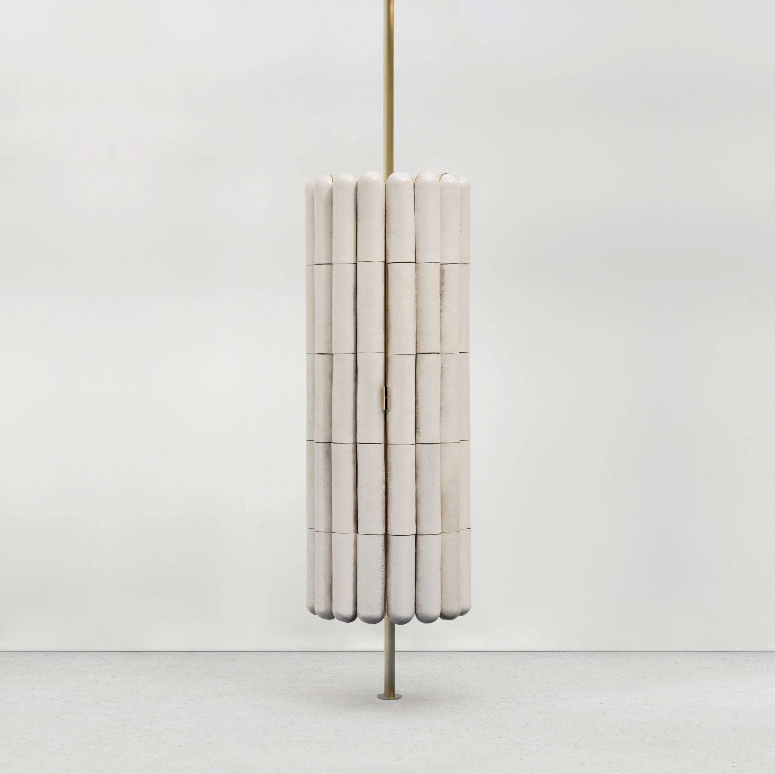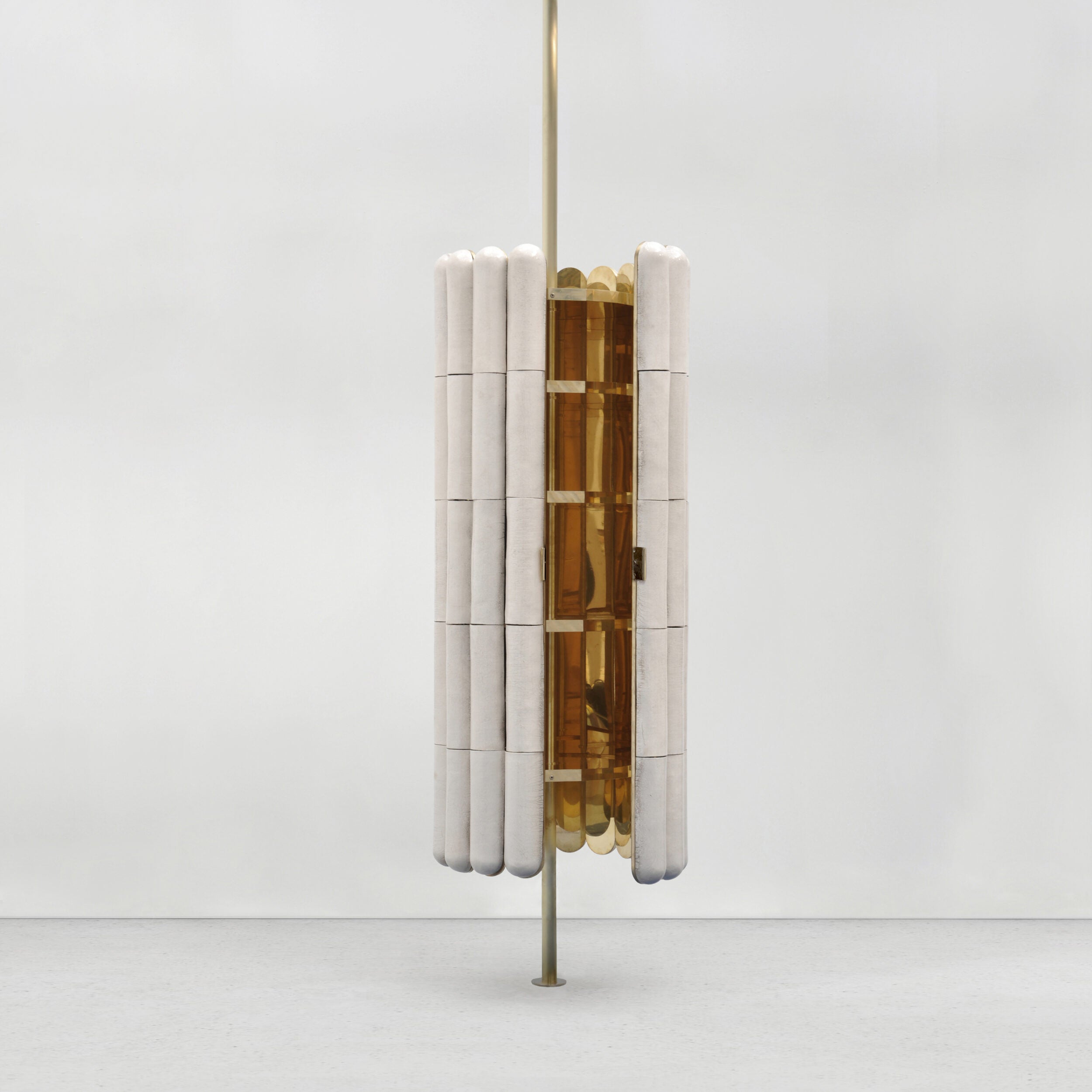 A delicate brass pole runs through the center of this sculptural ceiling-and-floor mounted piece, creating a stunning floating effect that invites reflection on the interplay between fragility and solidity. Subtle polished mirror brass handles only hint at the marvels hidden inside this ethereal ceramic carapace. Its double doors swing open to reveal a spectacular and festive interior of glimmering polished mirror brass panels and five rounded geometric shelves, also in mirror brass. This sumptuous celebration secreted away in its spartan shell makes for an extraordinary bar cabinet—a meditative monolith by day and a trove of sensual delight by night