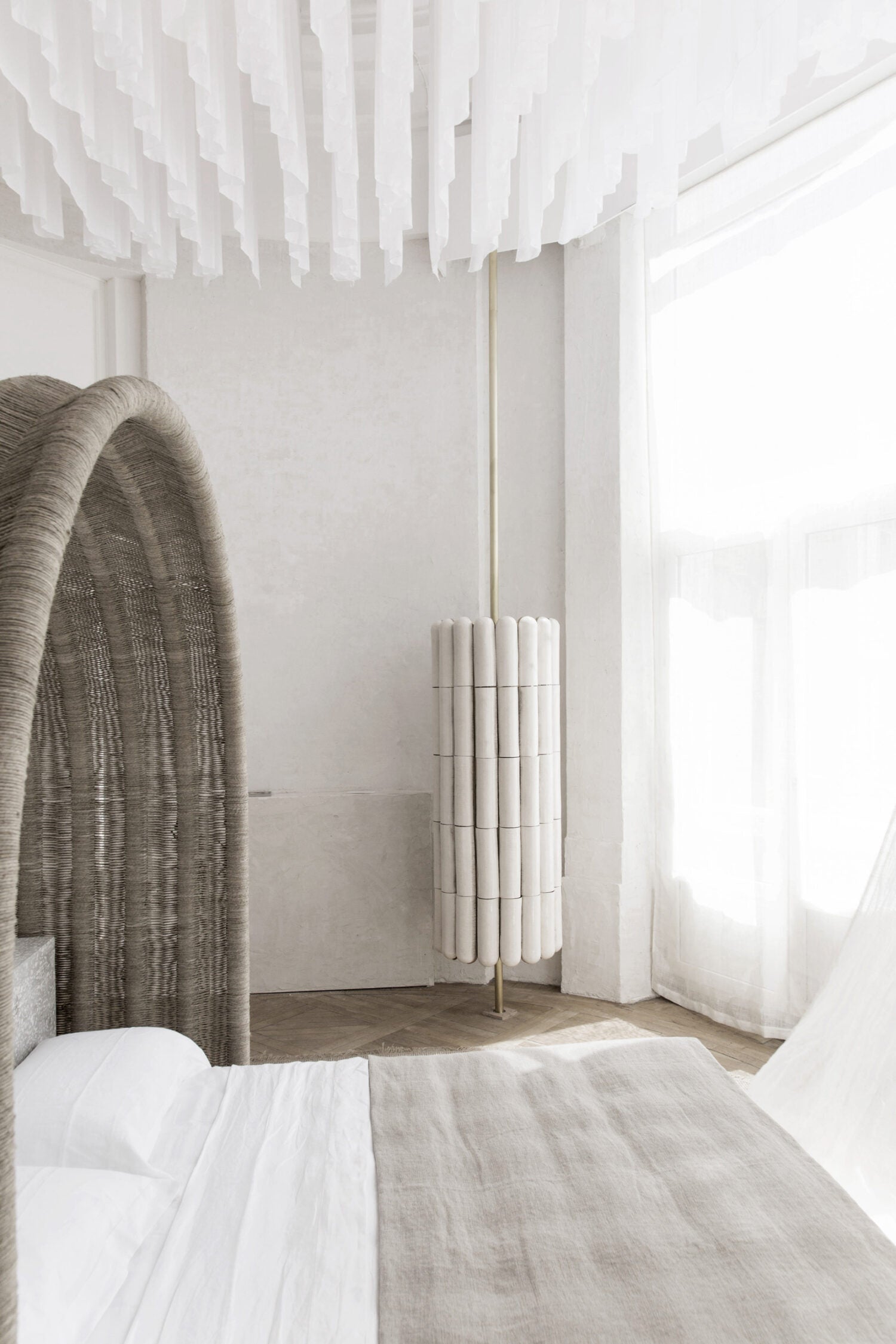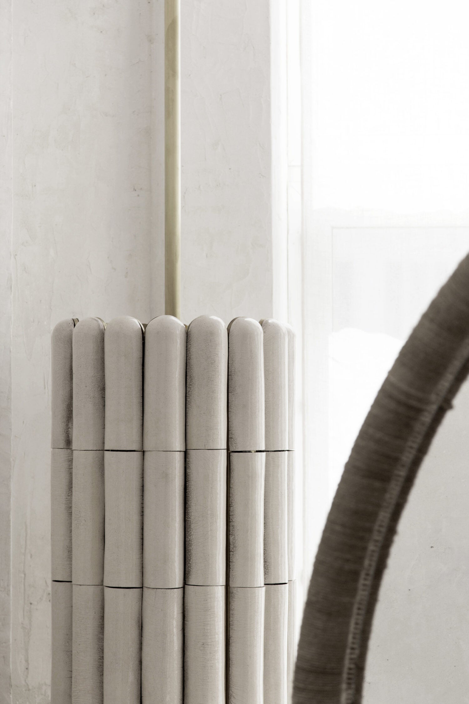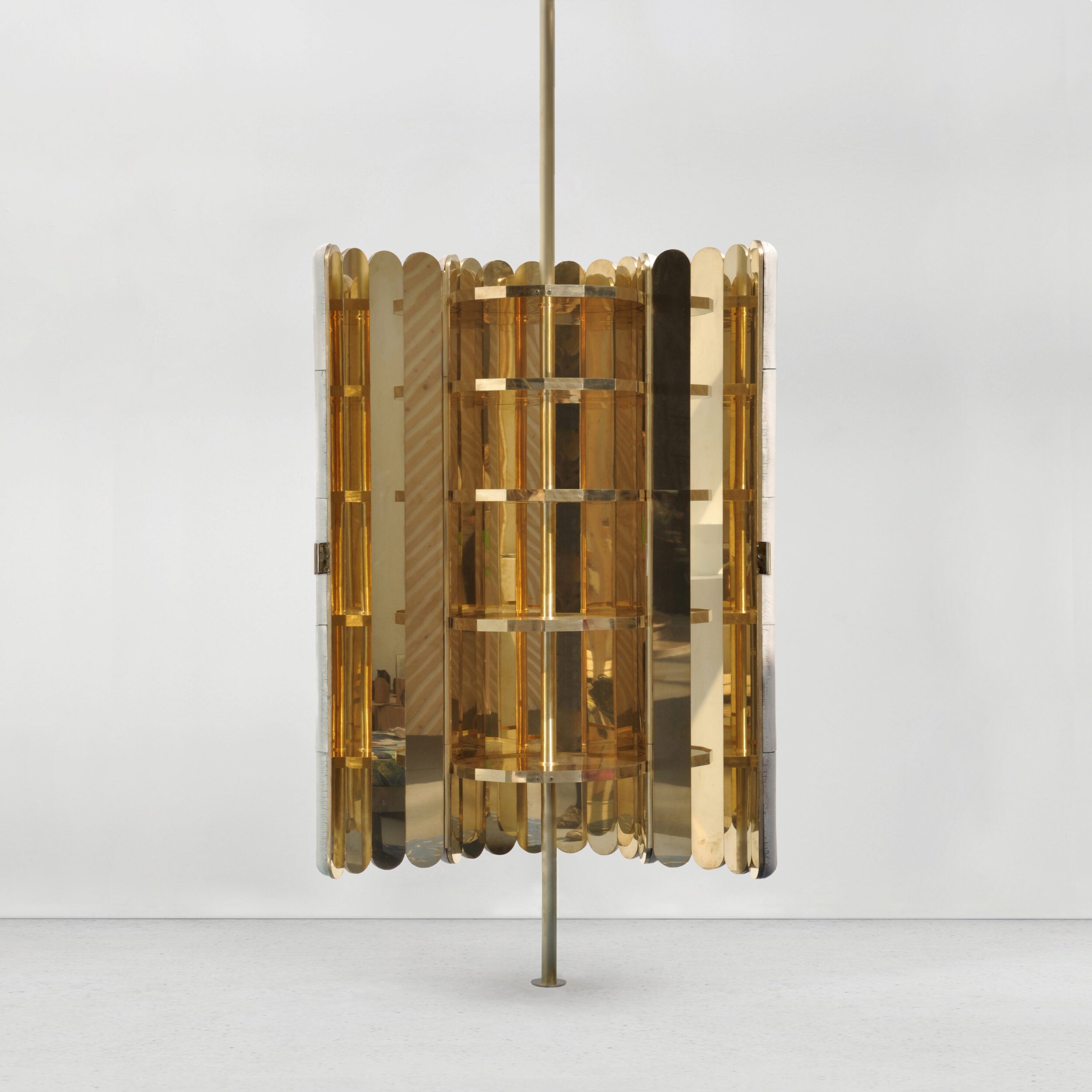 A delicate brass pole runs through the center of this sculptural ceiling-and-floor mounted piece, creating a stunning floating effect that invites reflection on the interplay between fragility and solidity. Subtle polished mirror brass handles only hint at the marvels hidden inside this ethereal ceramic carapace. Its double doors swing open to reveal a spectacular and festive interior of glimmering polished mirror brass panels and five rounded geometric shelves, also in mirror brass. This sumptuous celebration secreted away in its spartan shell makes for an extraordinary bar cabinet—a meditative monolith by day and a trove of sensual delight by night