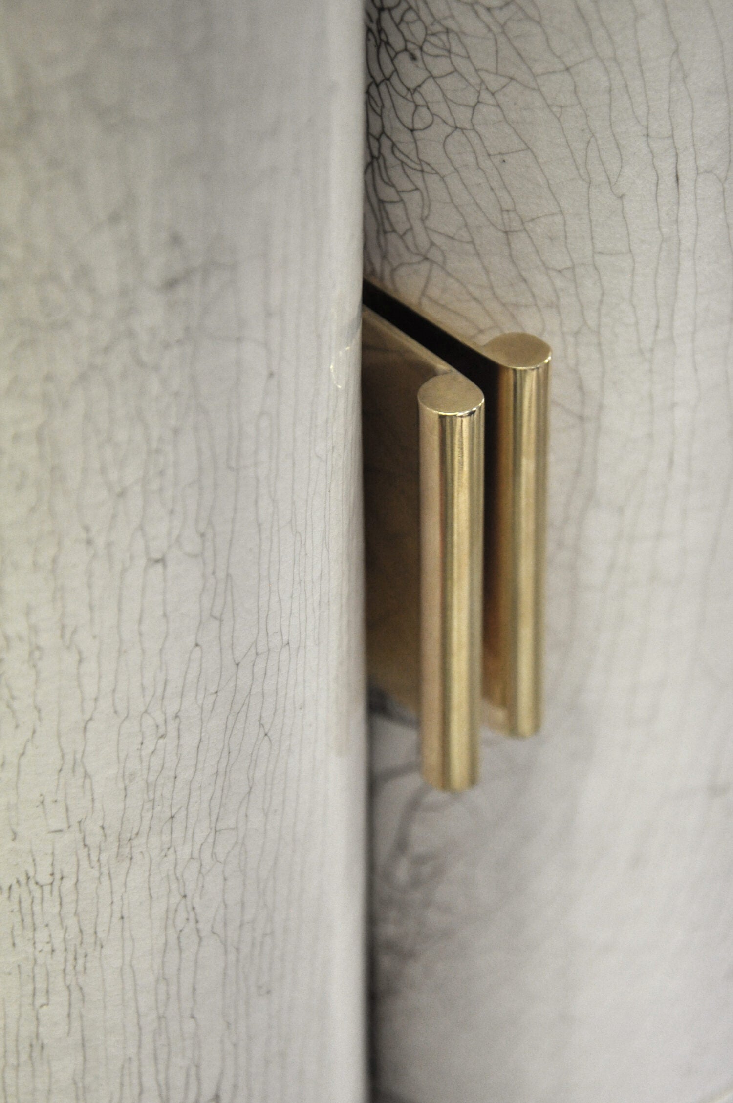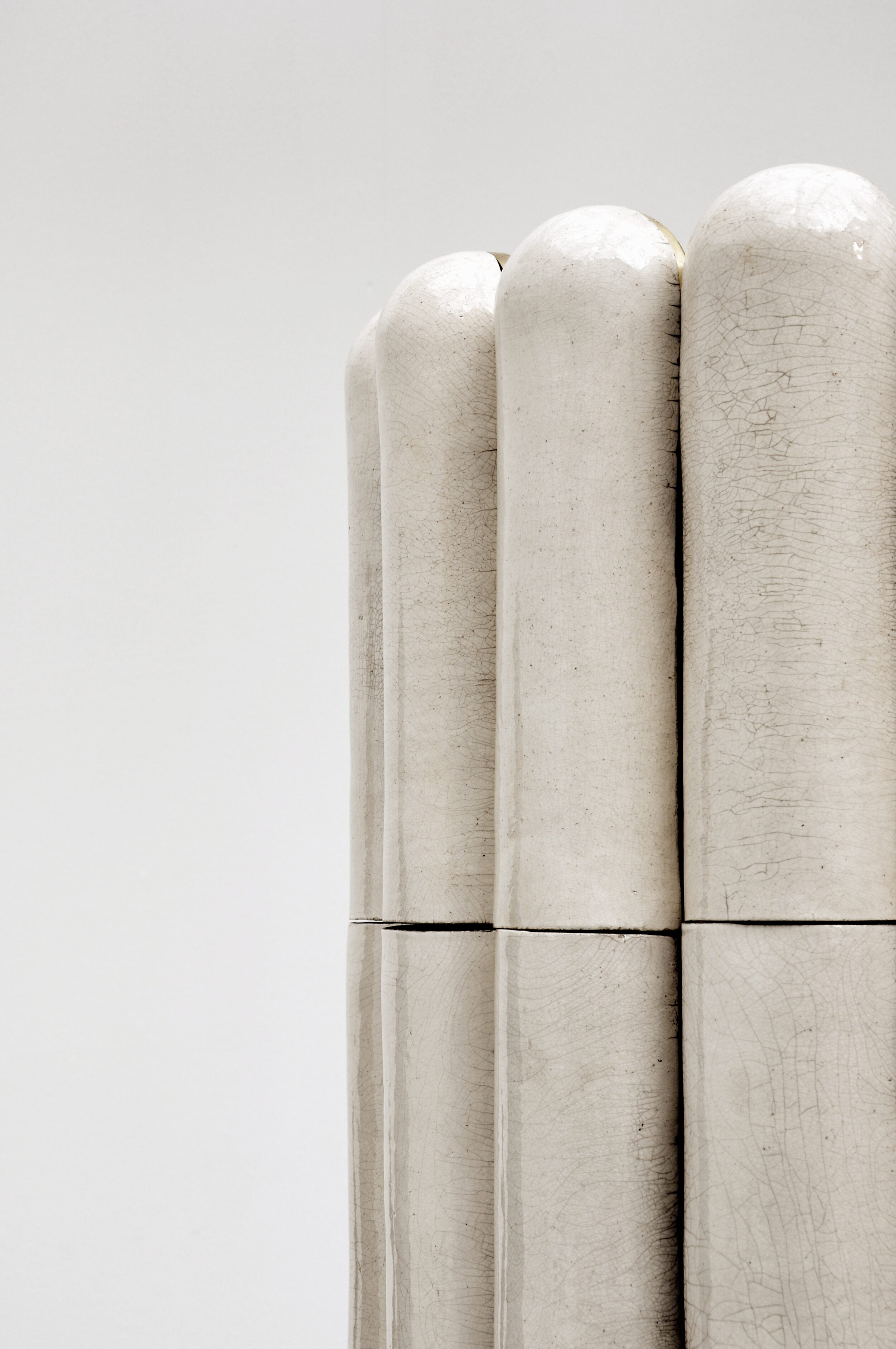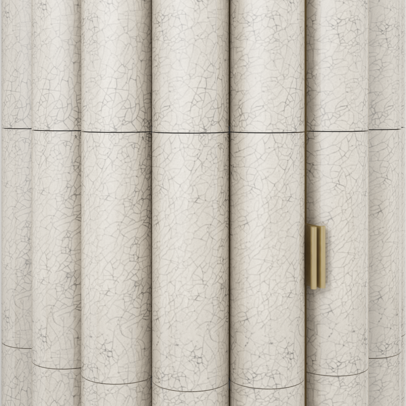 Dating back over four hundred years, the unusual Raku process subjects ceramic to extreme stress with high heat and rapid cooling to create dramatic and singular surface variations of the glaze. This crackled finish serves as a stunning counterpoint to the voluptuous Art-Deco inspired form of the cabinet’s exterior