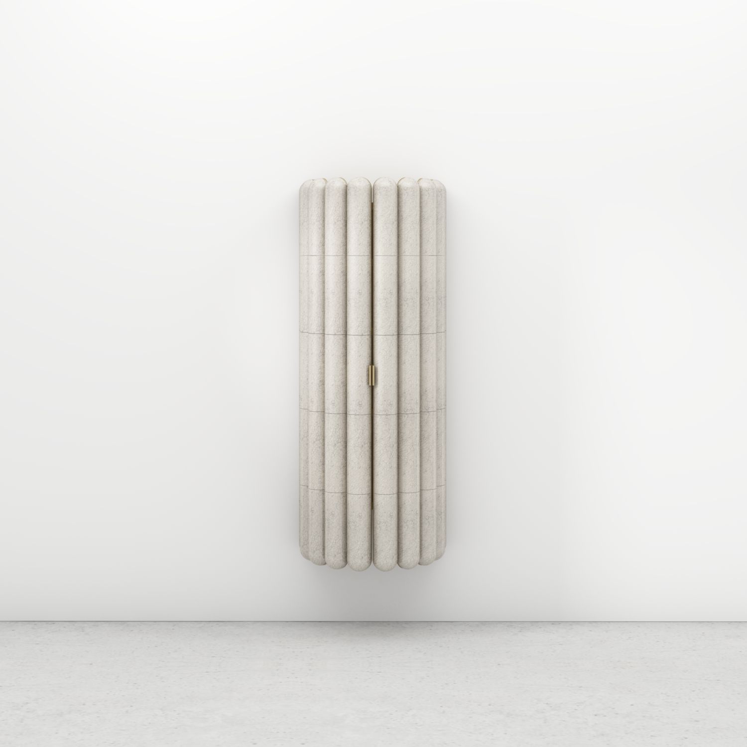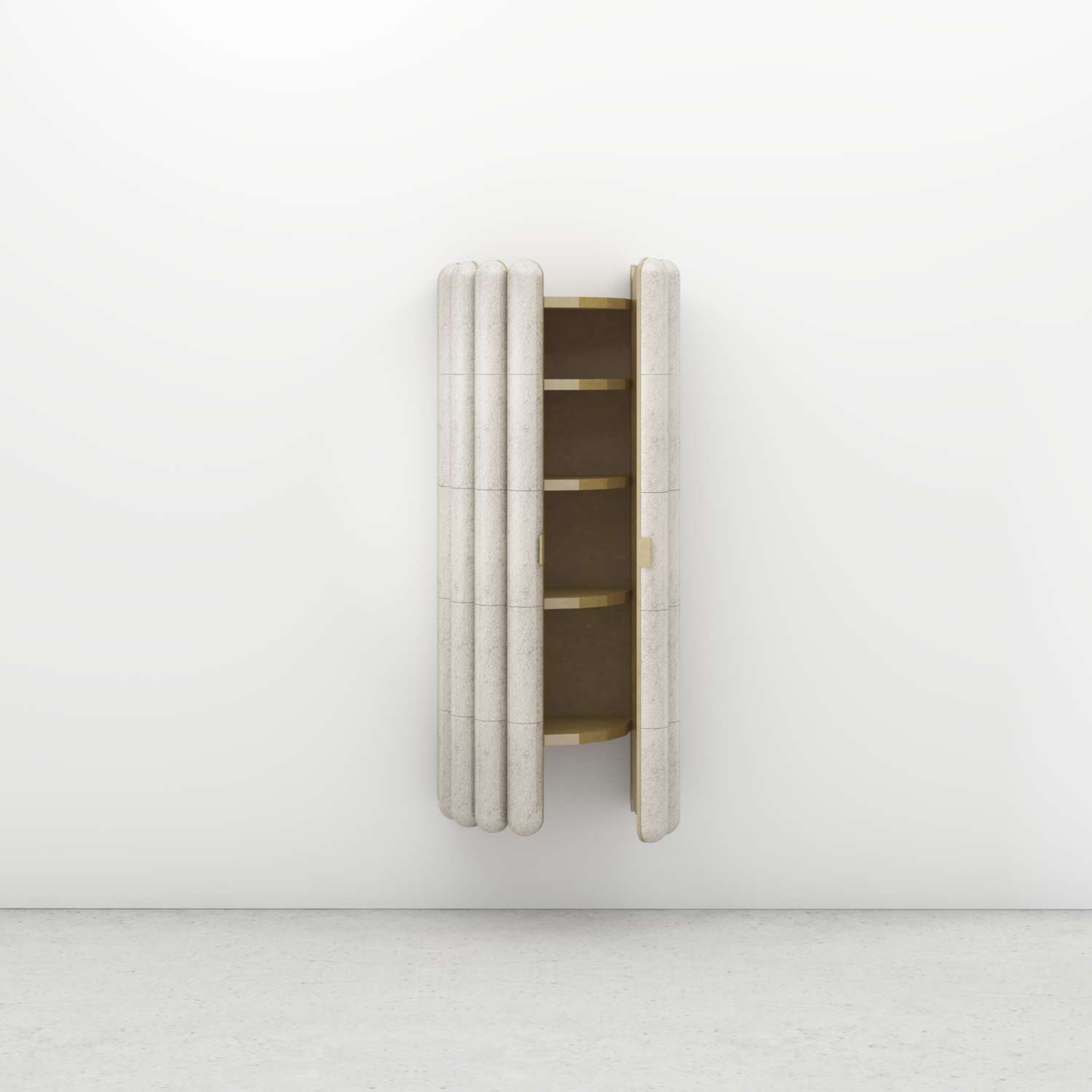 Polished mirror brass handles open the double doors to reveal a capacious interior with four rounded geometric shelves, also in glimmering mirror brass. Perfect as a floating bar cabinet or for small storage, this remarkable piece feels at once contemporary yet rich with history, sensual yet sacred, spartan yet utterly luxurious