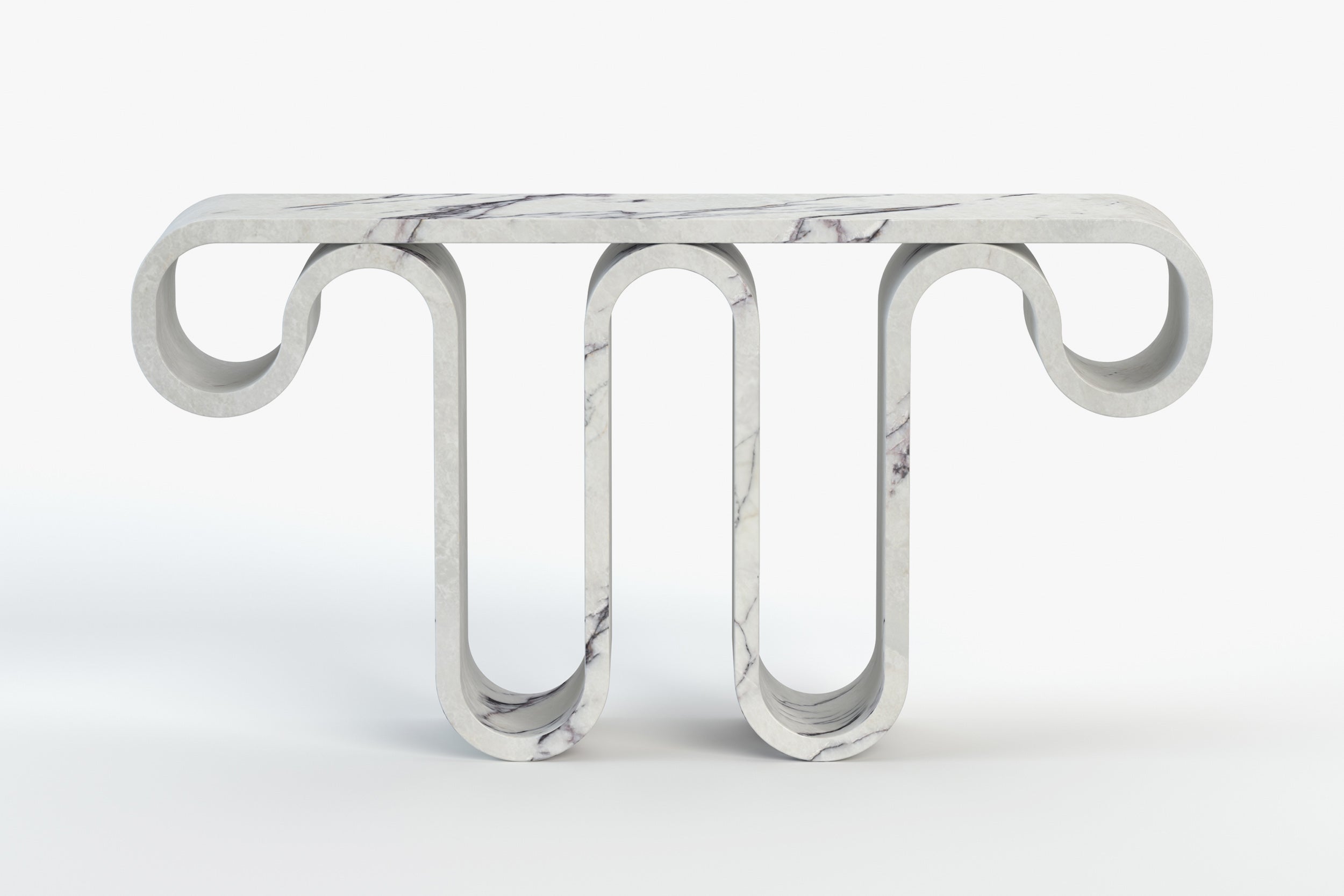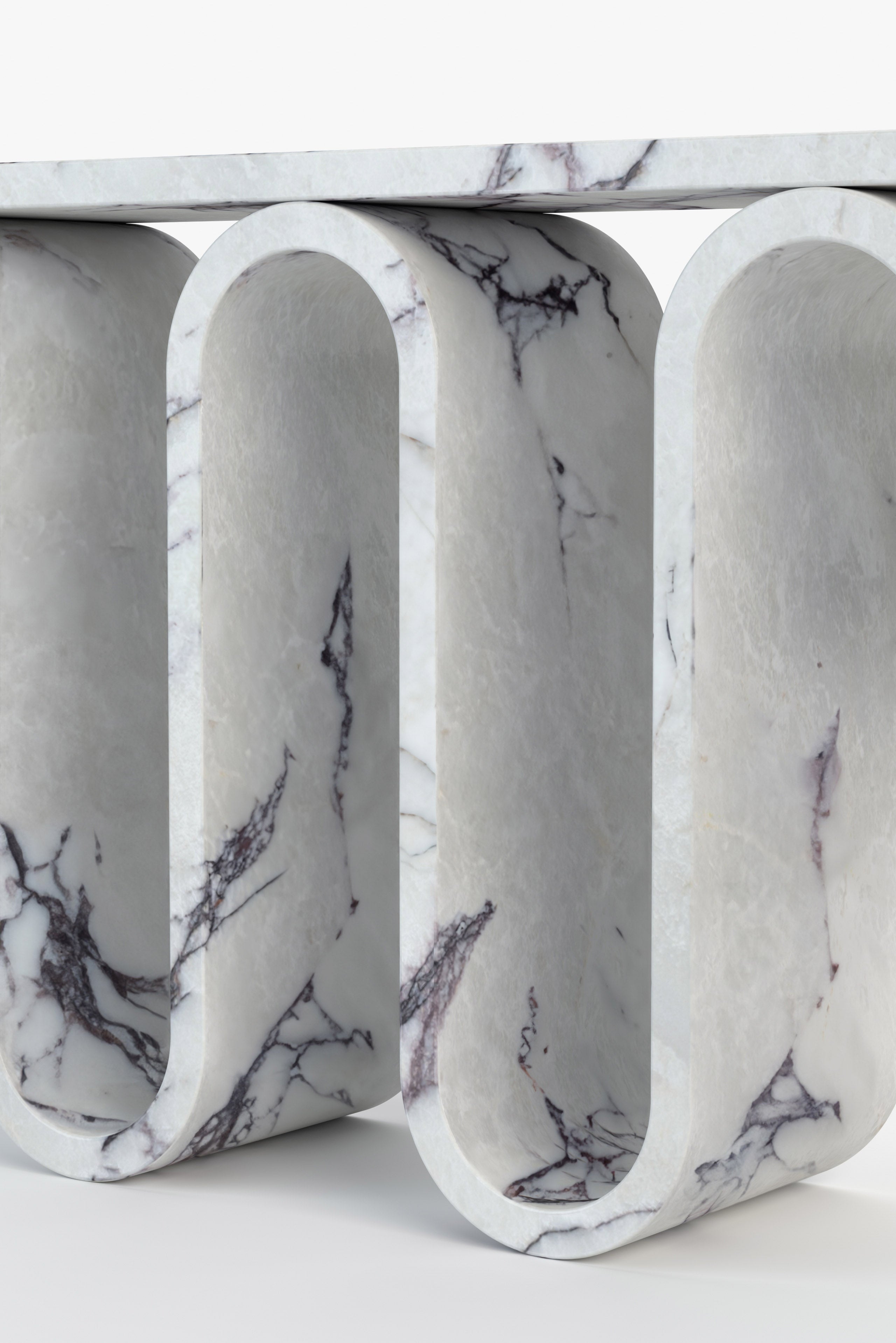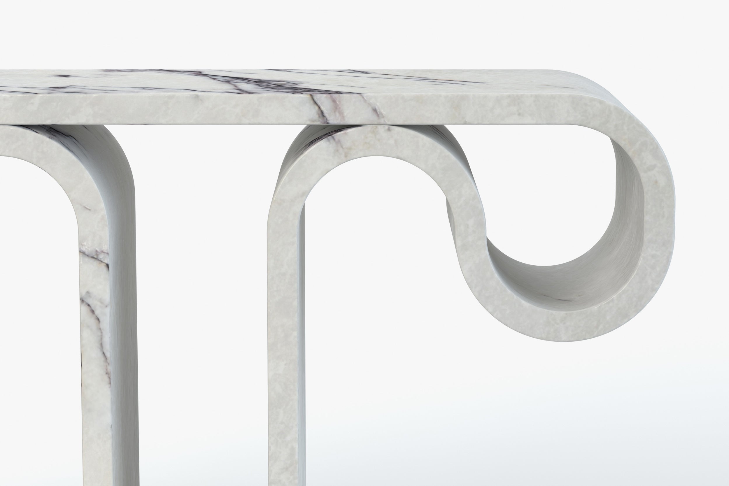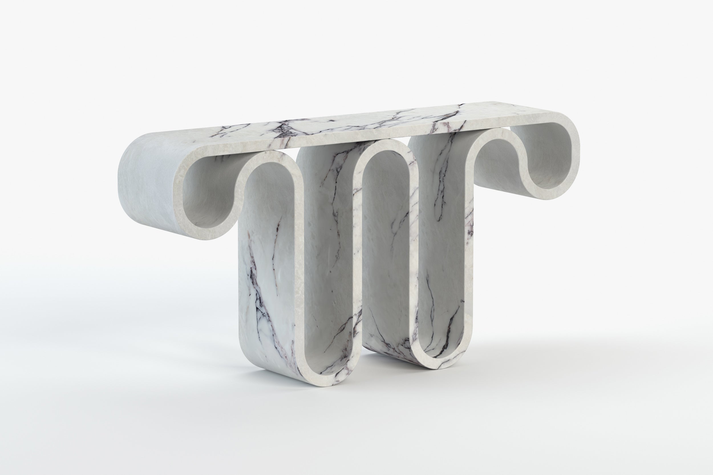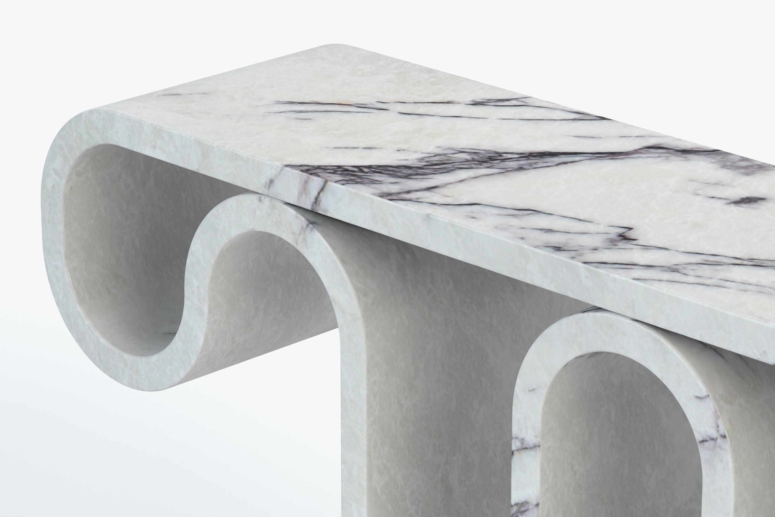 This journey highlights the remarkable materials yeniay has chosen for their elegance and endurance. The console and the bench are each available in three finishes: Lilac Marble, travertine, and stainless steel. Handcrafted in Turkey by exceptional artisans, the marble and travertine works are carved from a single piece of stone