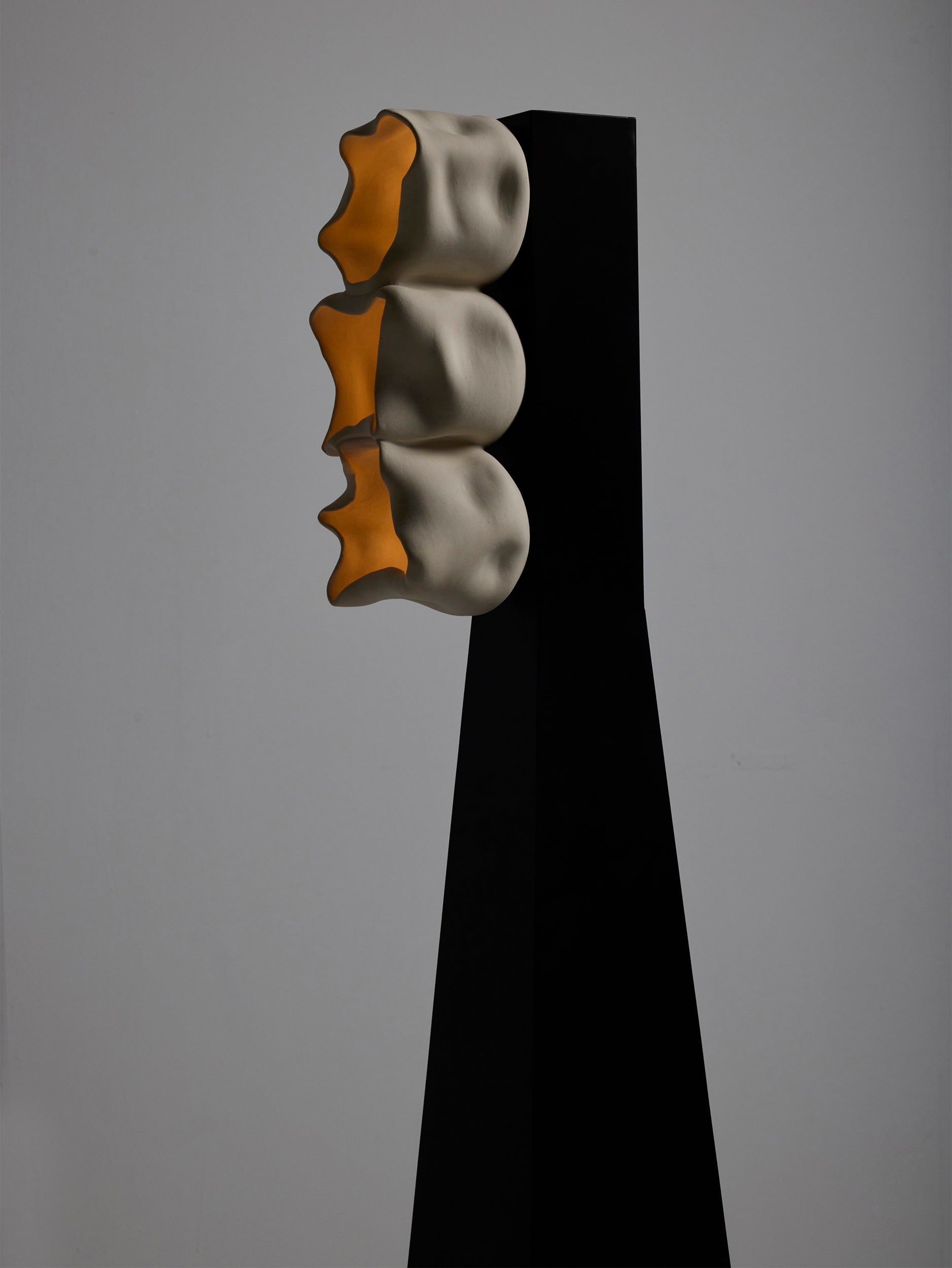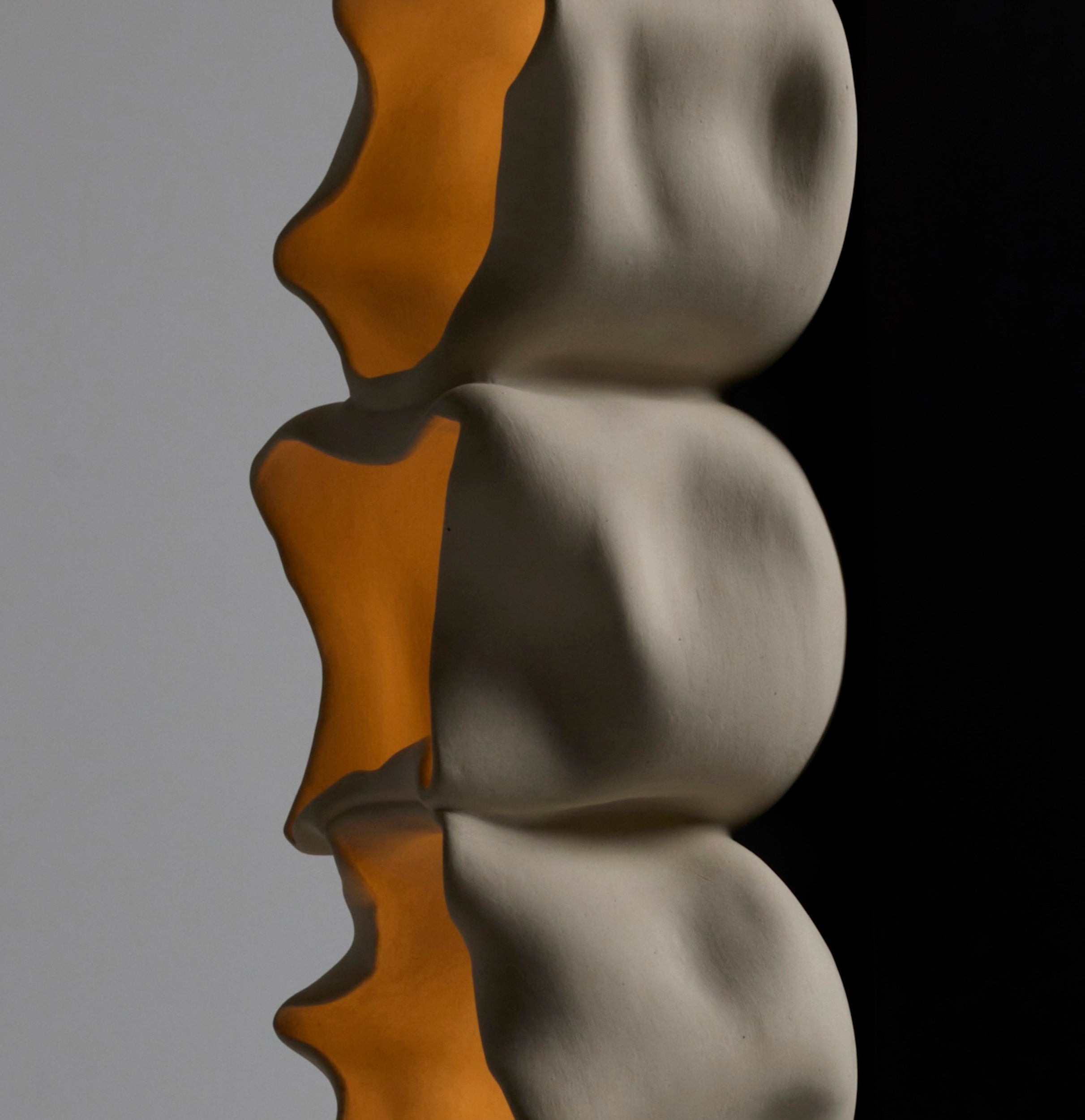 The biomorphic arrangements of the “cups” suggest movement and growth, echoing the natural world’s capacity for renewal even in death. The collection’s earthy materiality anchors each work in the organic, while its luminous quality imbues it with a sense of the ethereal. These dualities evoke a primordial connection to nature, while simultaneously gesturing toward something unfamiliar, even otherworldly