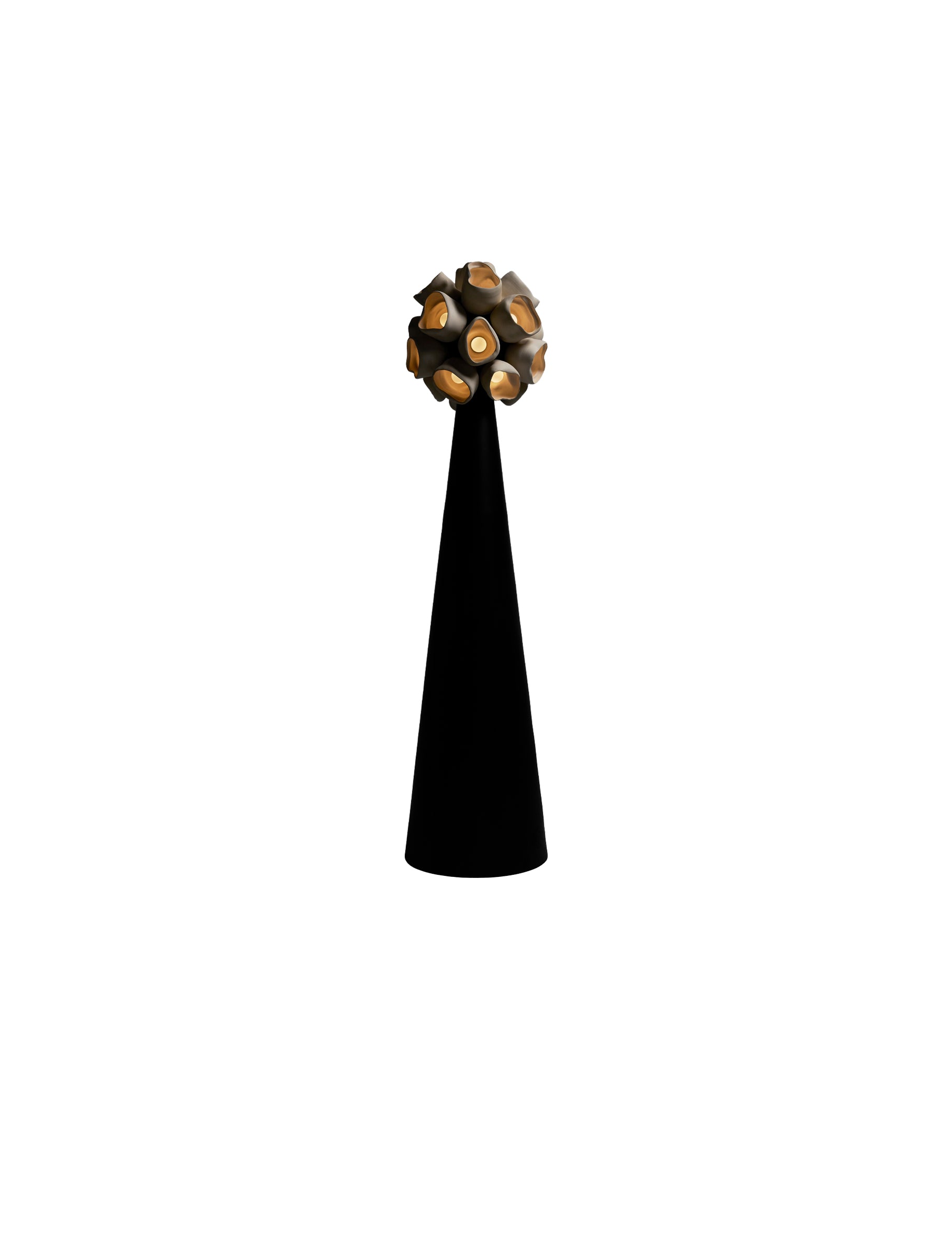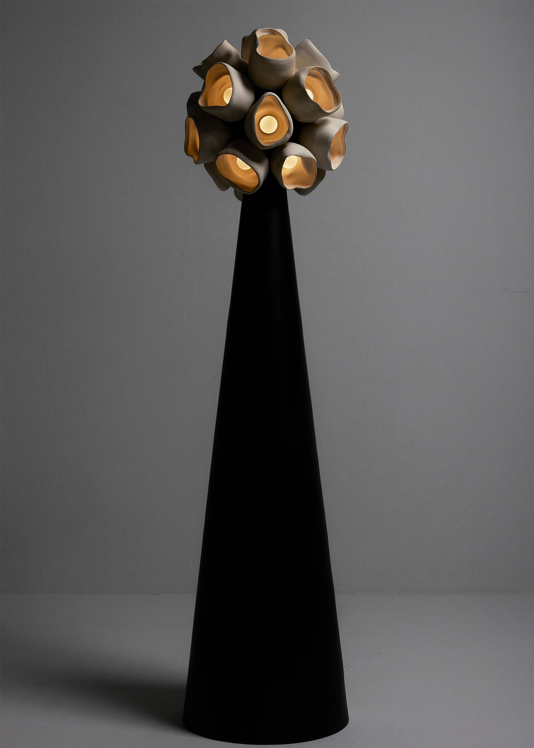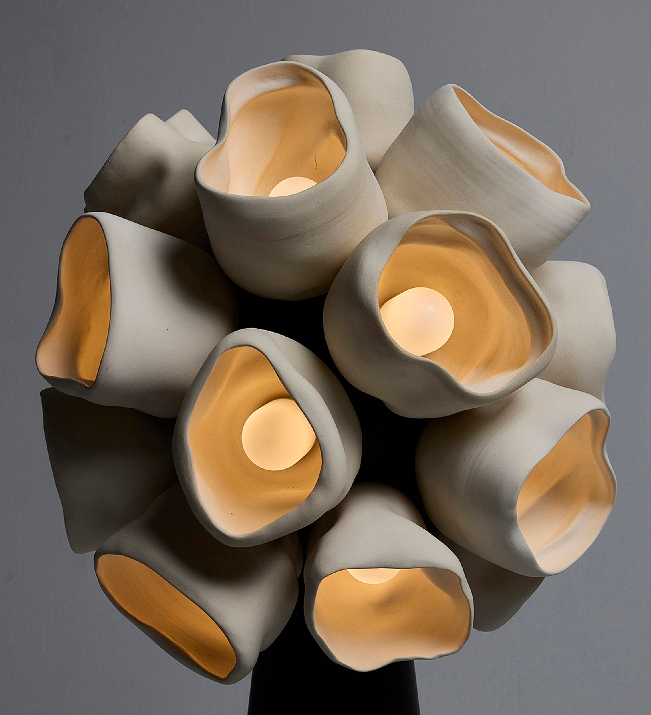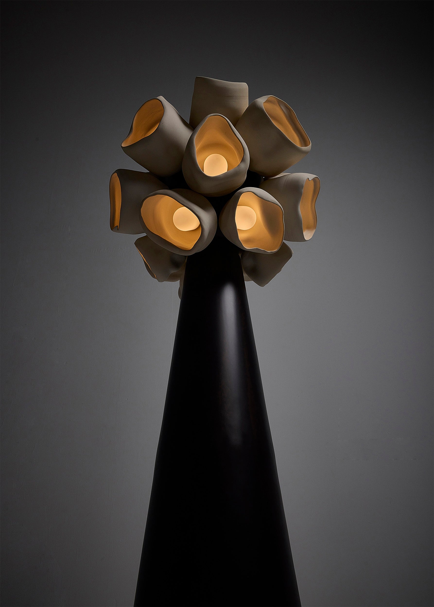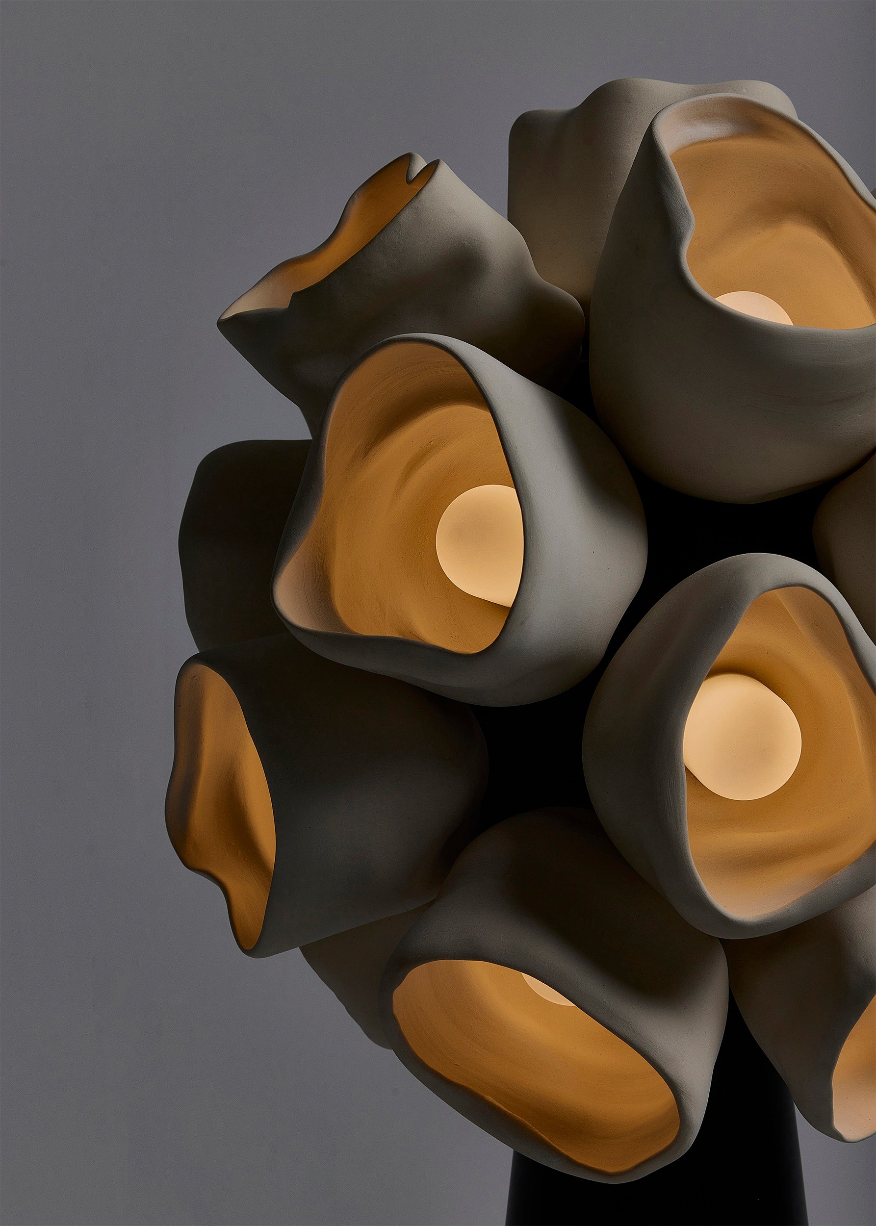 The apothecium, or “cup fungi,” serves as the central motif for the series. These forms, both delicate and robust, are reimagined as vessels for illumination, their contours inviting light to radiate outward in soft, glowing arcs. The interplay between natural ceramic surfaces and patinated brass evokes a tactile dialogue between earthiness and refinement. Each work juxtaposes organic irregularity with precise functionality, inviting contemplation on composition and decomposition, form and deformation, flourishing and decay