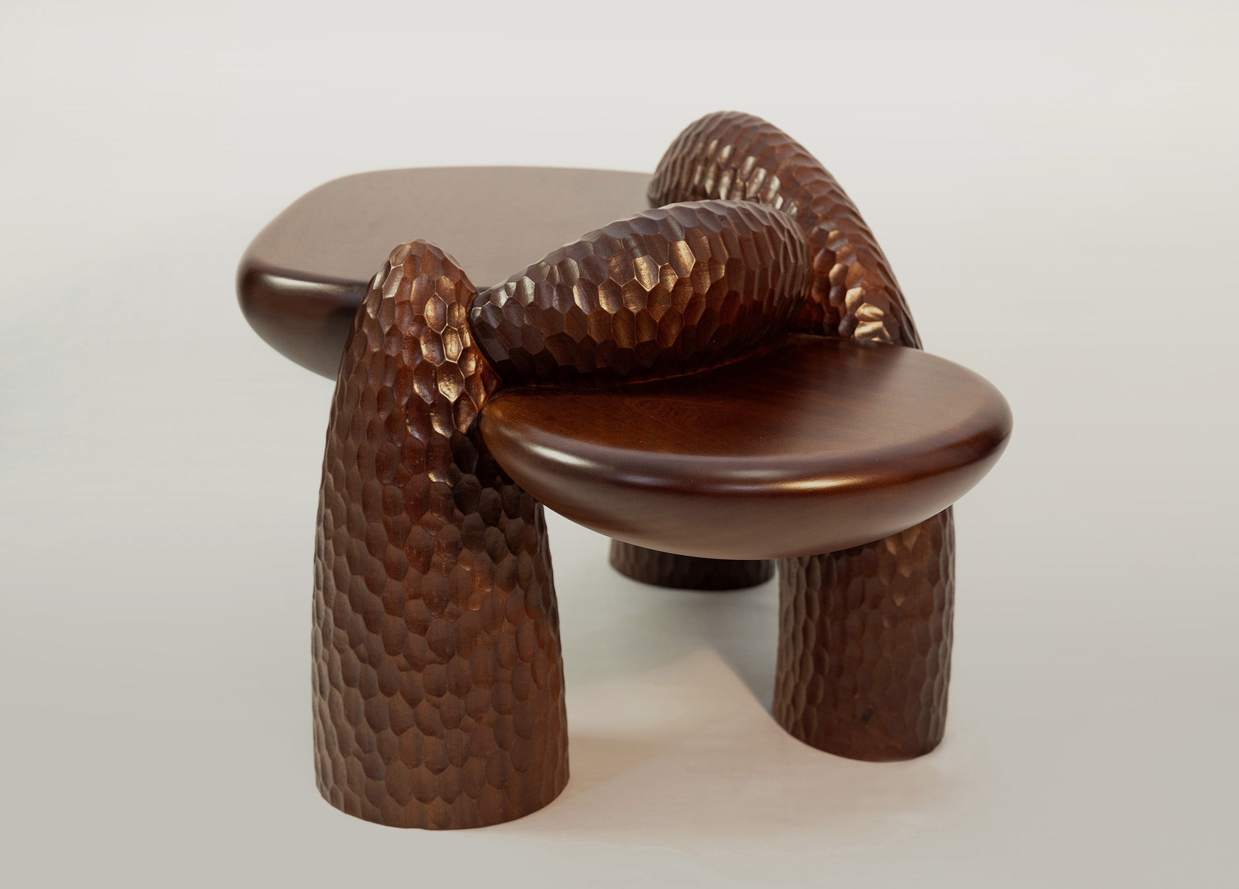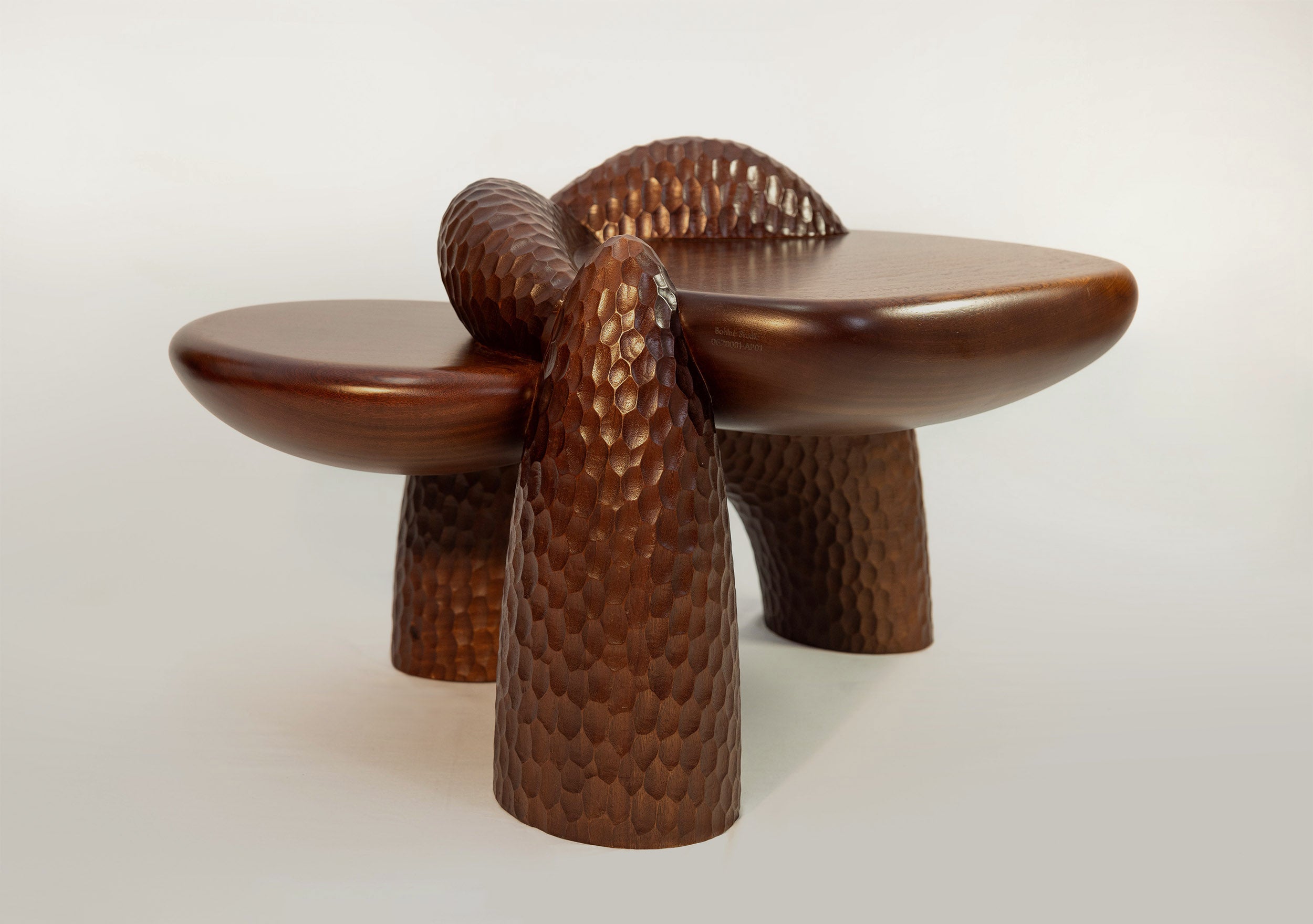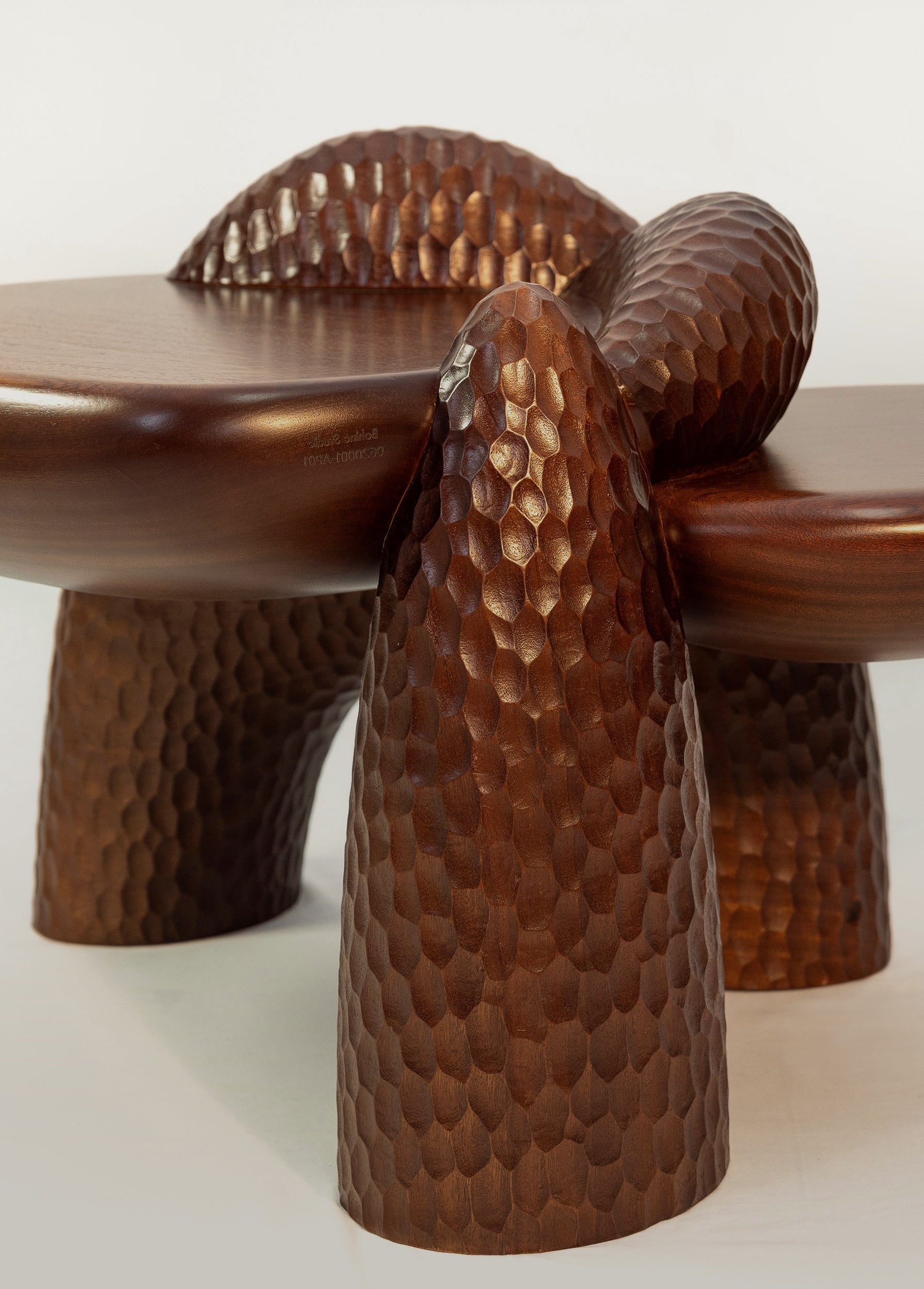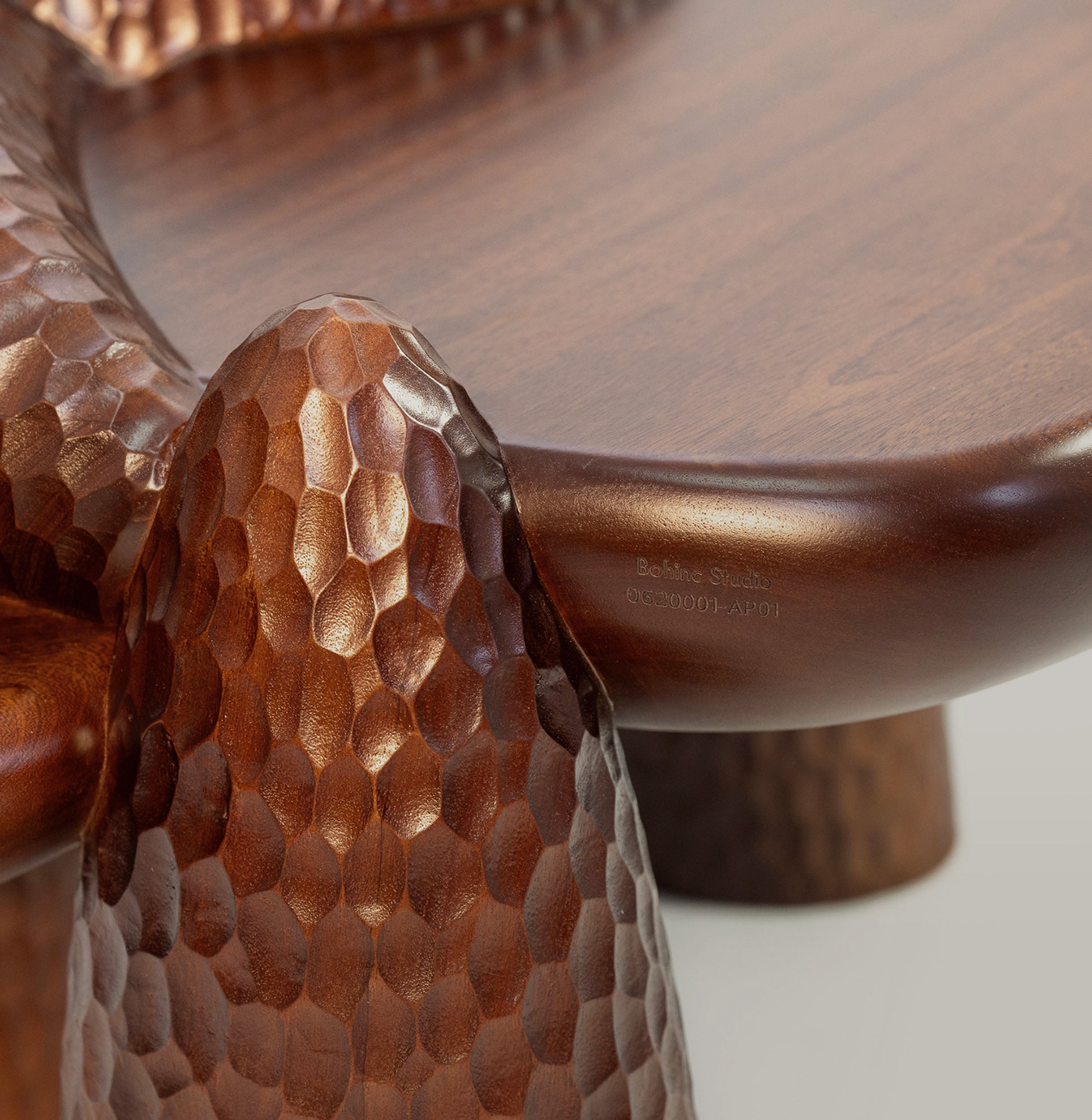 Complementing the seating is the Anima Coffee Table, crafted in Portugal from solid mahogany. Its floating, organic surfaces rest on muscular, rock-like formations, shaped through a fusion of 5D laser cutting and hand chiseling, creating a striking balance between refined craftsmanship and raw materiality