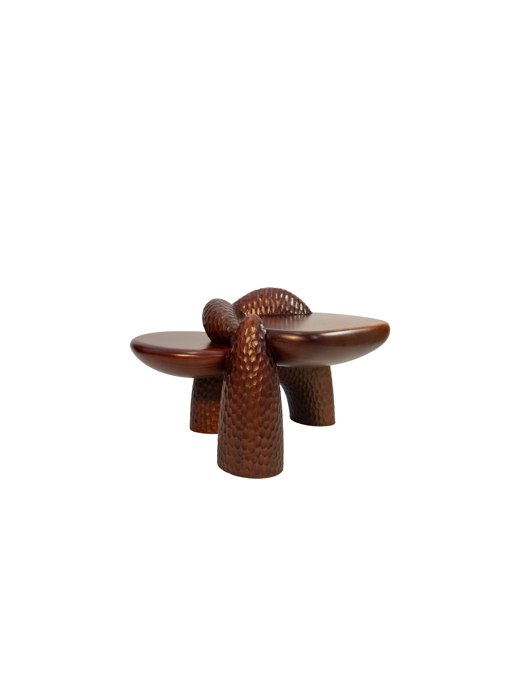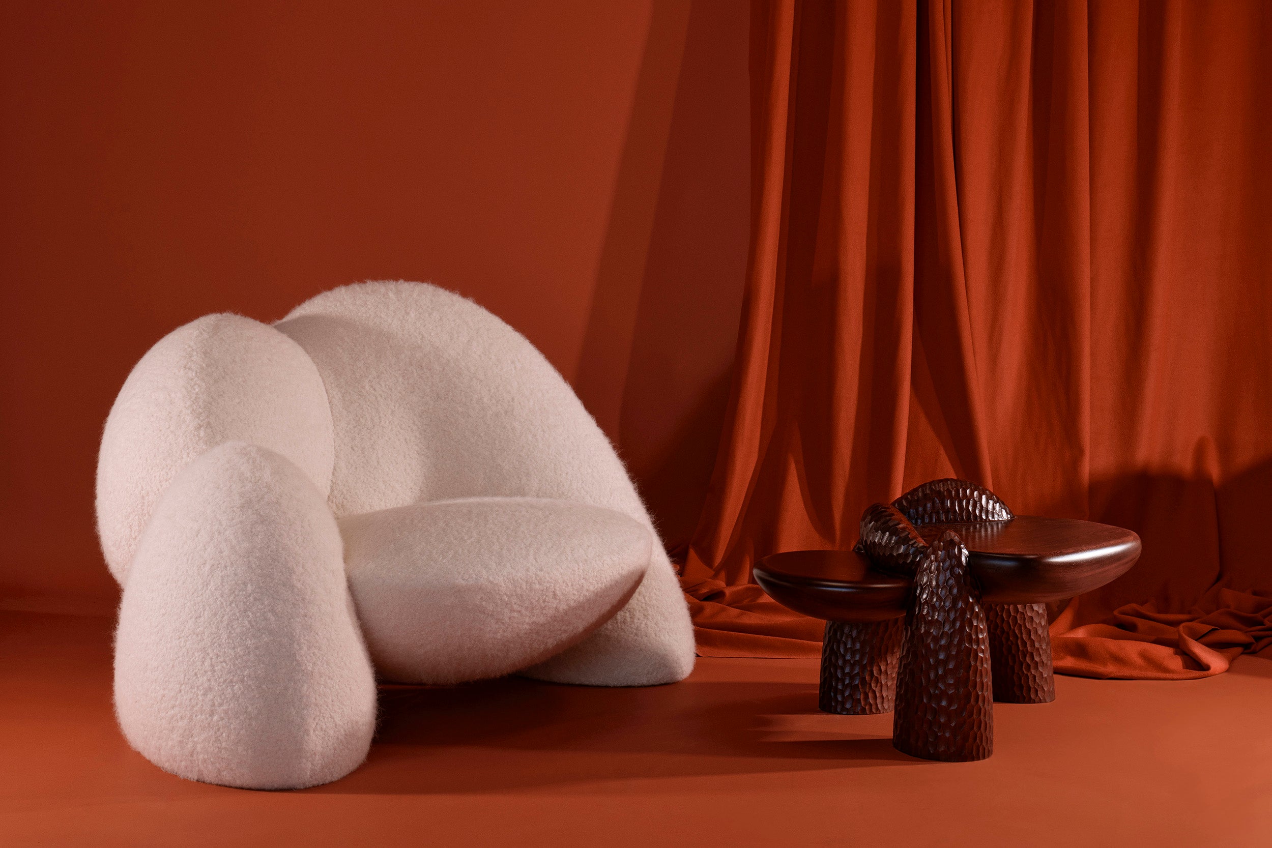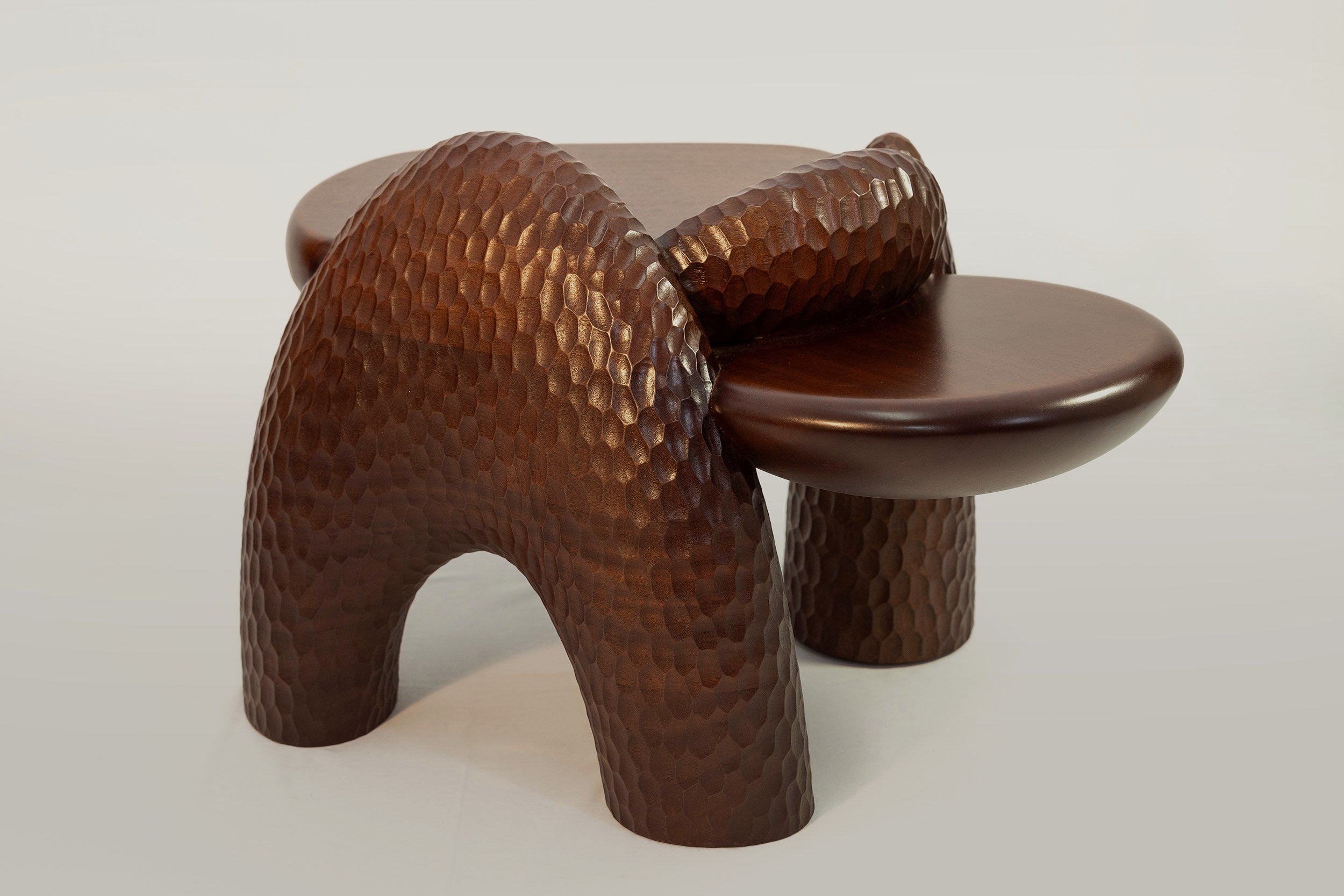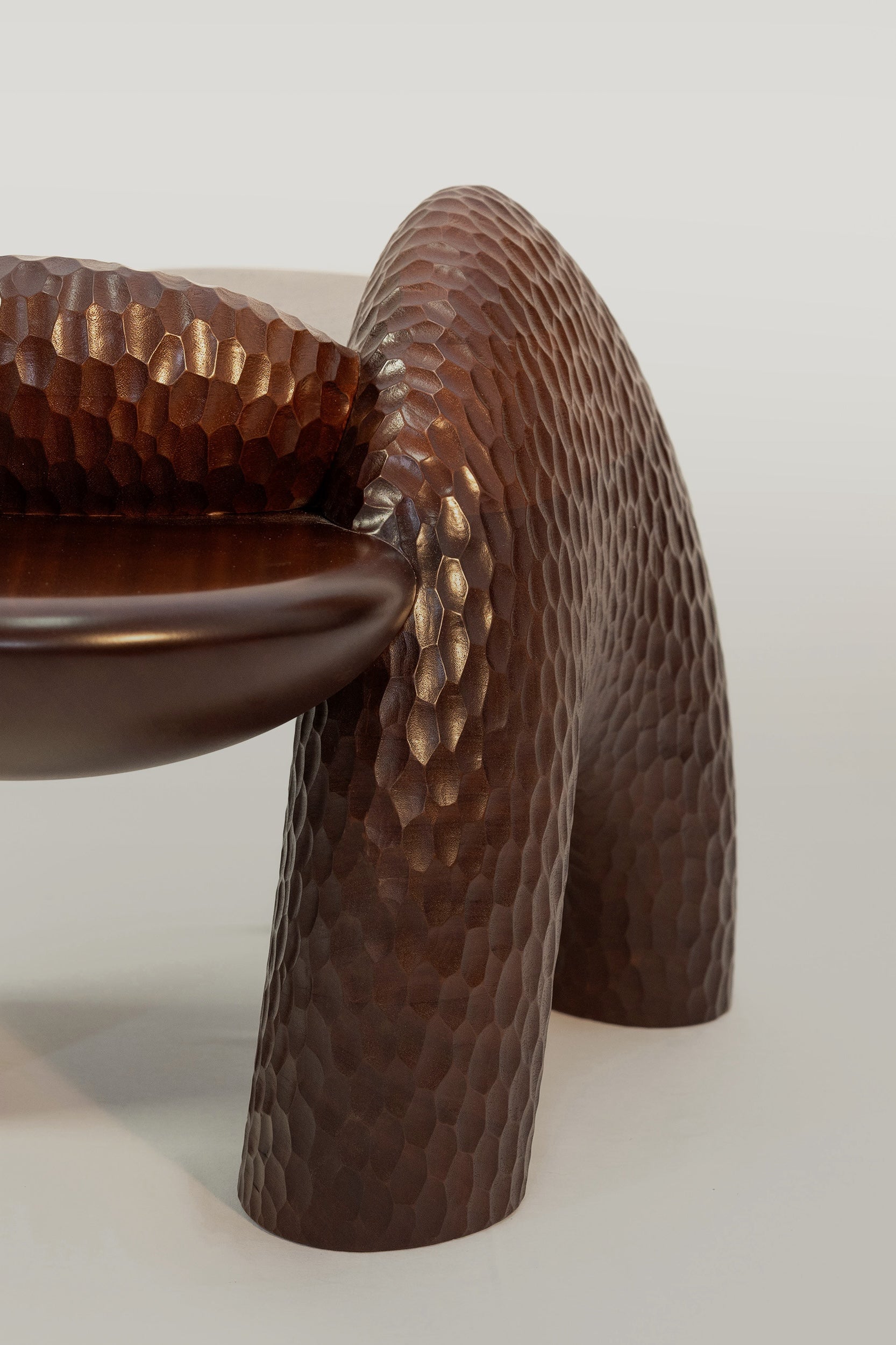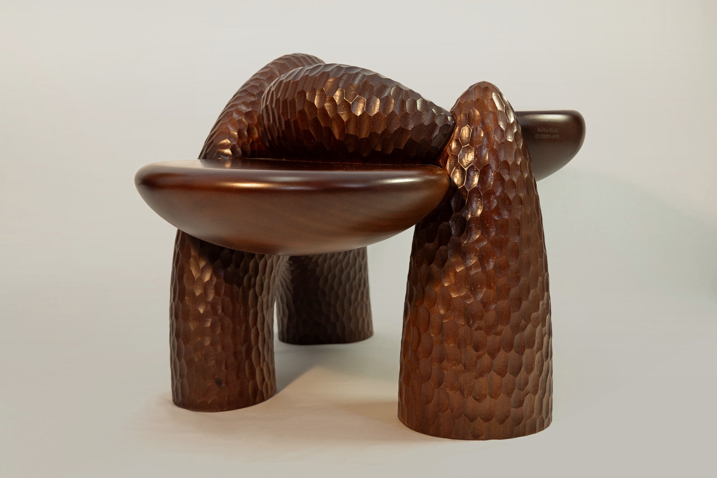 Complementing the seating is the Anima Coffee Table, crafted in Portugal from solid mahogany. Its floating, organic surfaces rest on muscular, rock-like formations, shaped through a fusion of 5D laser cutting and hand chiseling, creating a striking balance between refined craftsmanship and raw materiality