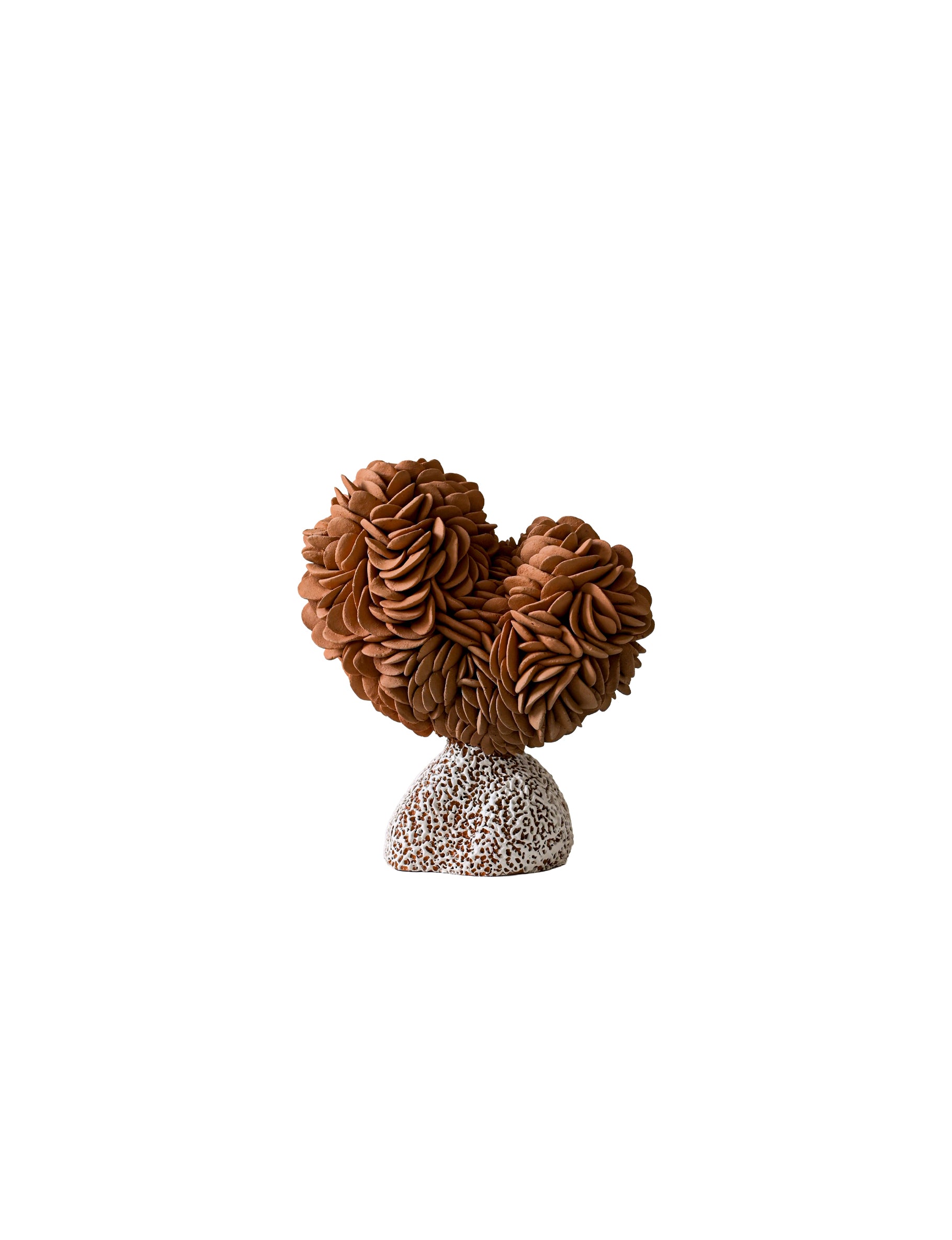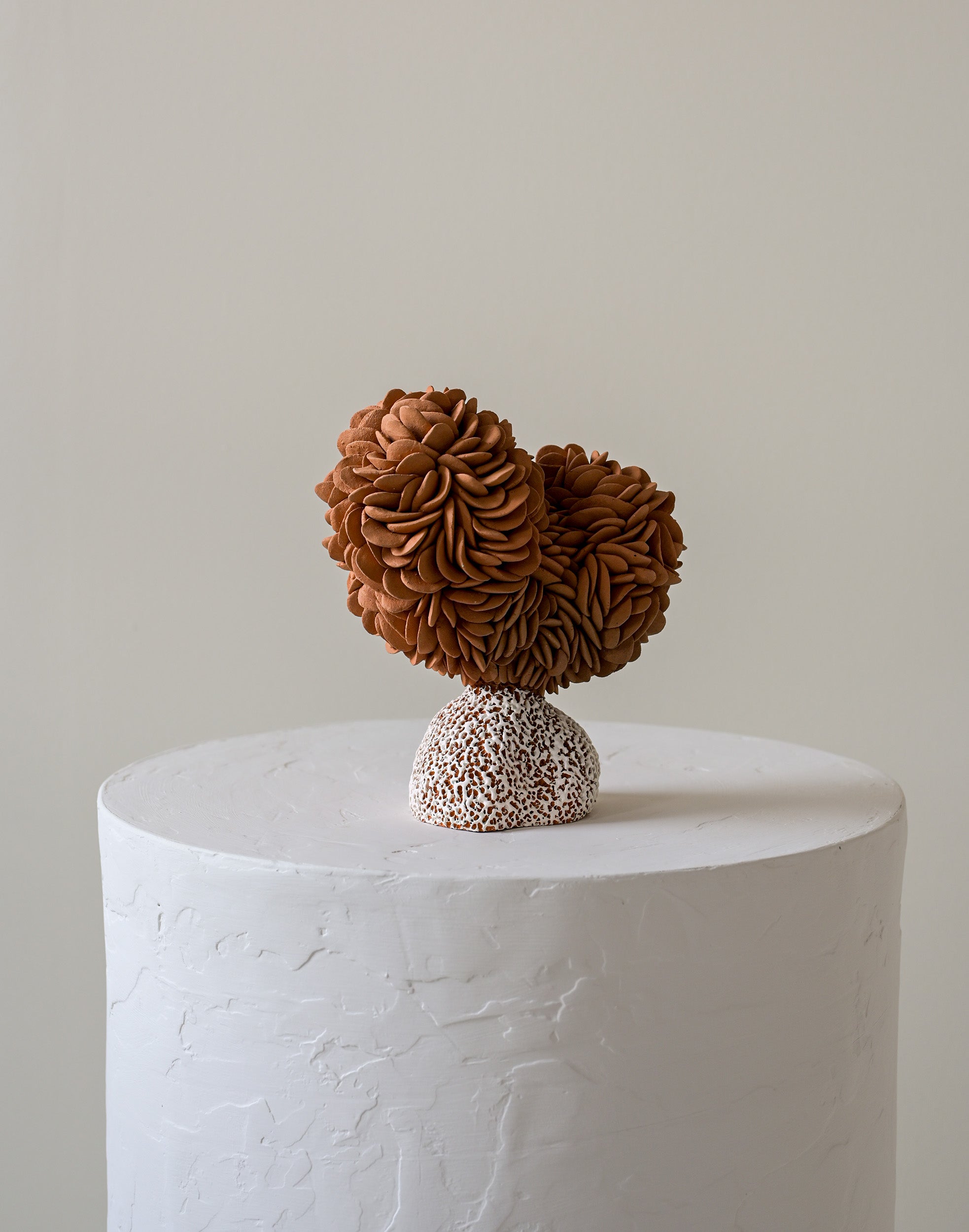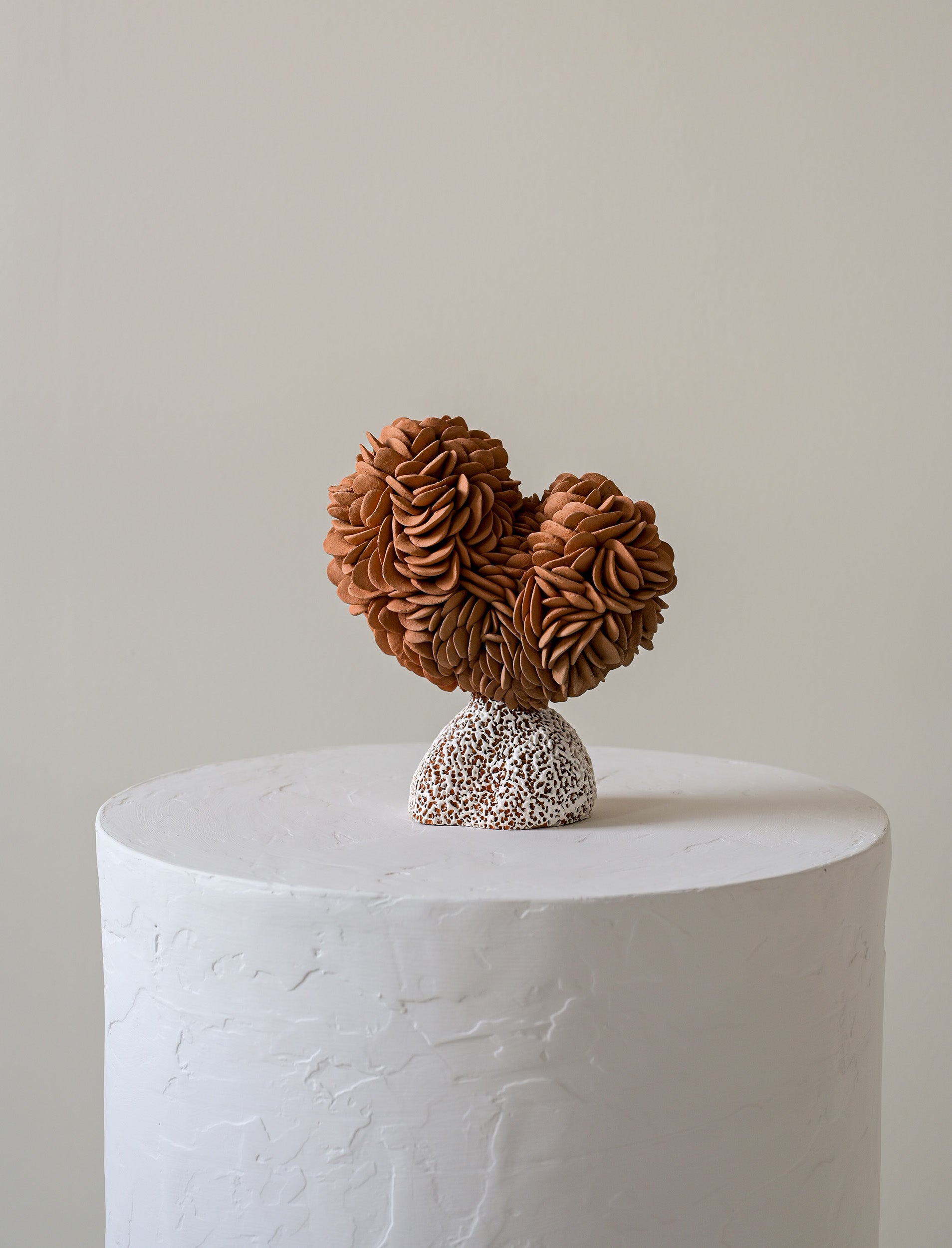 The forms themselves oscillate between the botanical and the marine — dense, petal-like accumulations that echo the crowded geometry of cacti in bloom; bulbous, rounded volumes that suggest sea-worn stones or coral heads; surfaces that cluster and gather, as if the landscape itself had condensed into sculptural mass. A luminous white element crowns one work, balanced with deliberate poise, evoking both shell and sky. Throughout the collection, the dialogue between earthy terracotta and pale, speckled surfaces mirrors the meeting of land and ocean that defined Heino's days at Casa Wabi