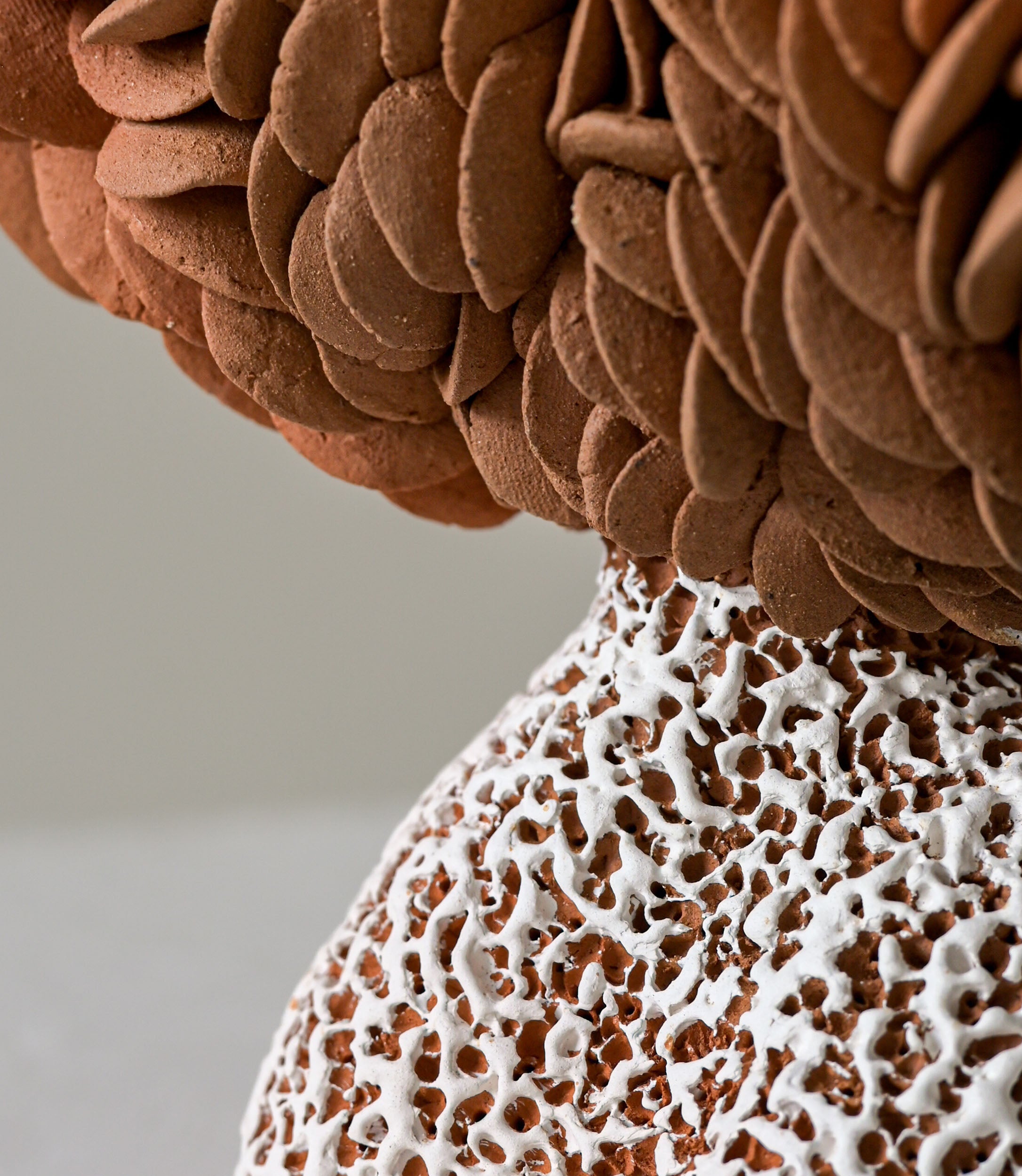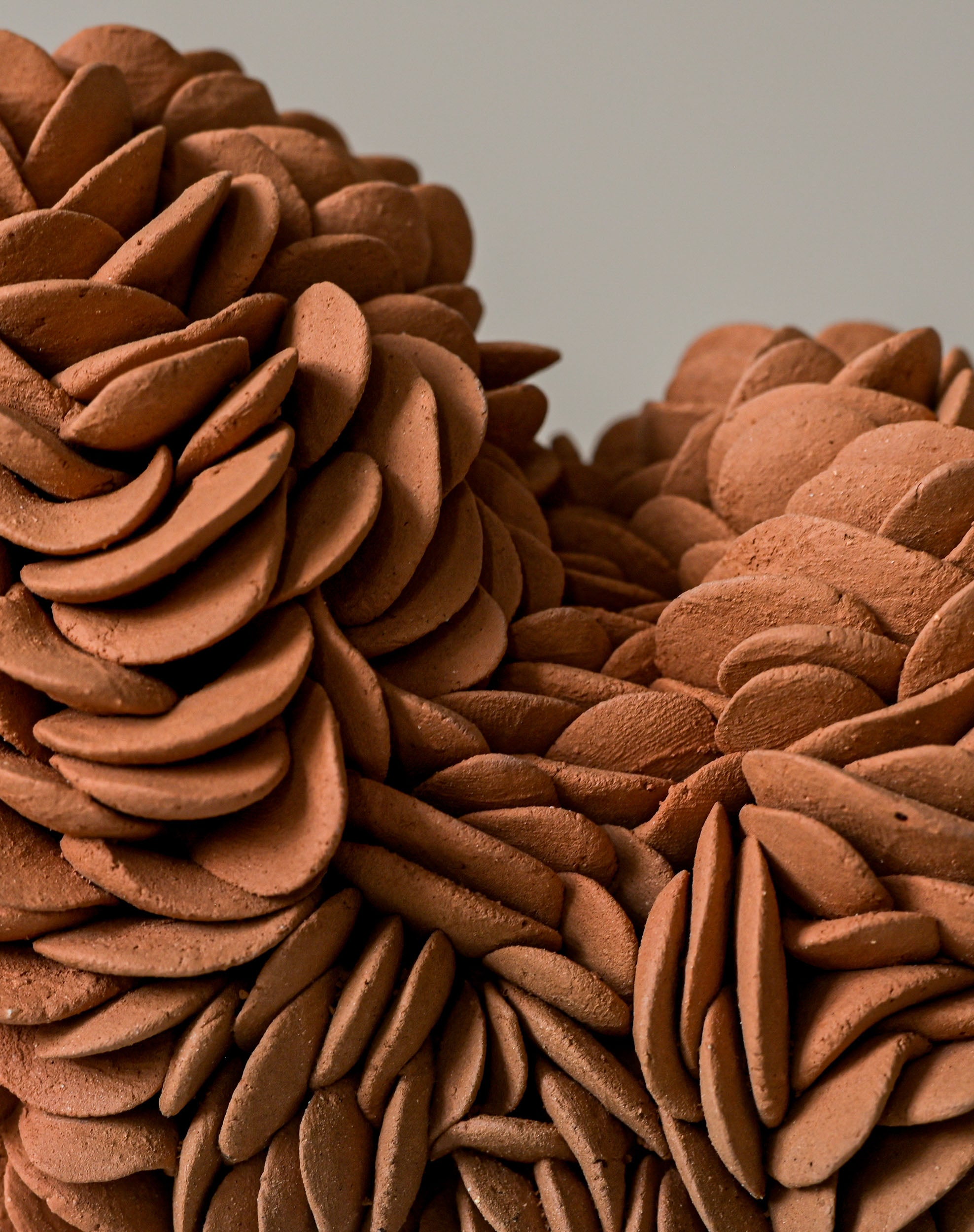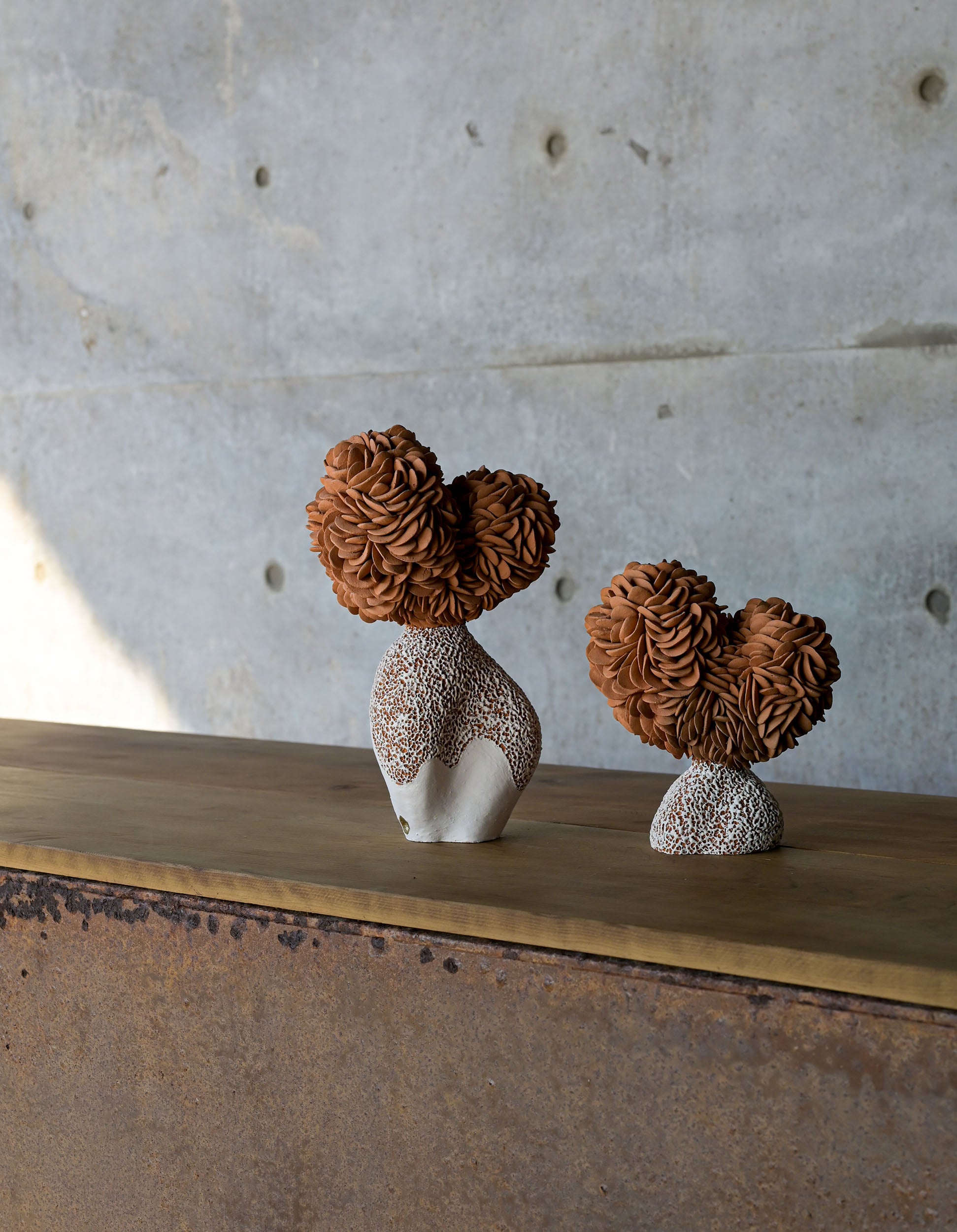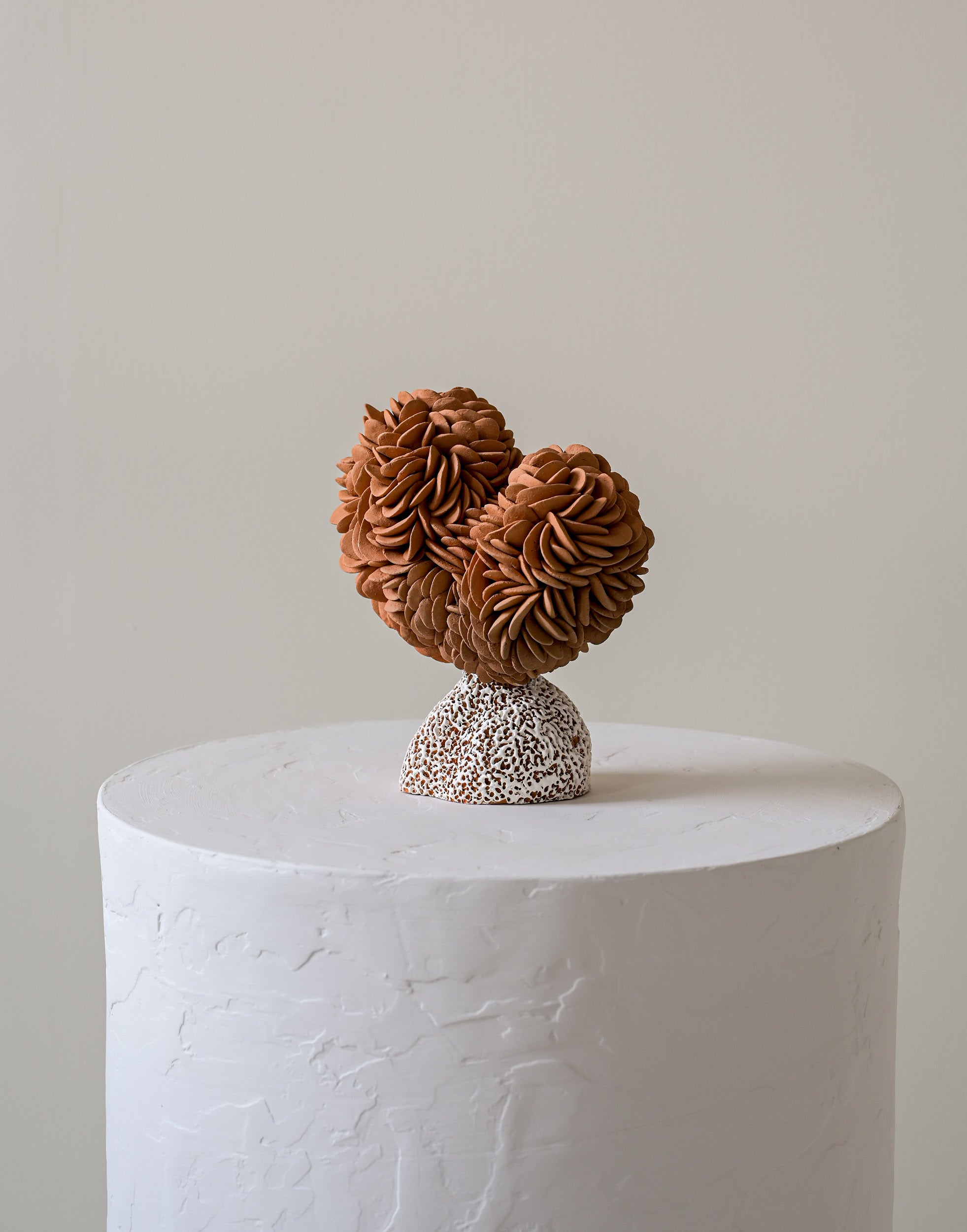 The forms themselves oscillate between the botanical and the marine — dense, petal-like accumulations that echo the crowded geometry of cacti in bloom; bulbous, rounded volumes that suggest sea-worn stones or coral heads; surfaces that cluster and gather, as if the landscape itself had condensed into sculptural mass. A luminous white element crowns one work, balanced with deliberate poise, evoking both shell and sky. Throughout the collection, the dialogue between earthy terracotta and pale, speckled surfaces mirrors the meeting of land and ocean that defined Heino's days at Casa Wabi