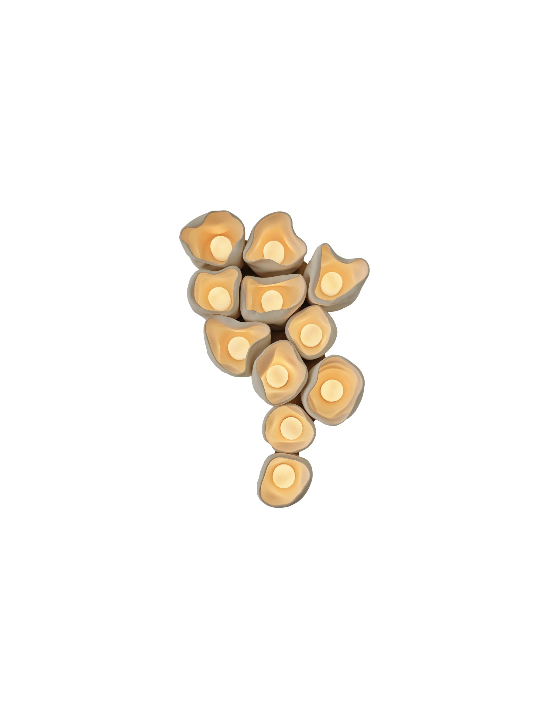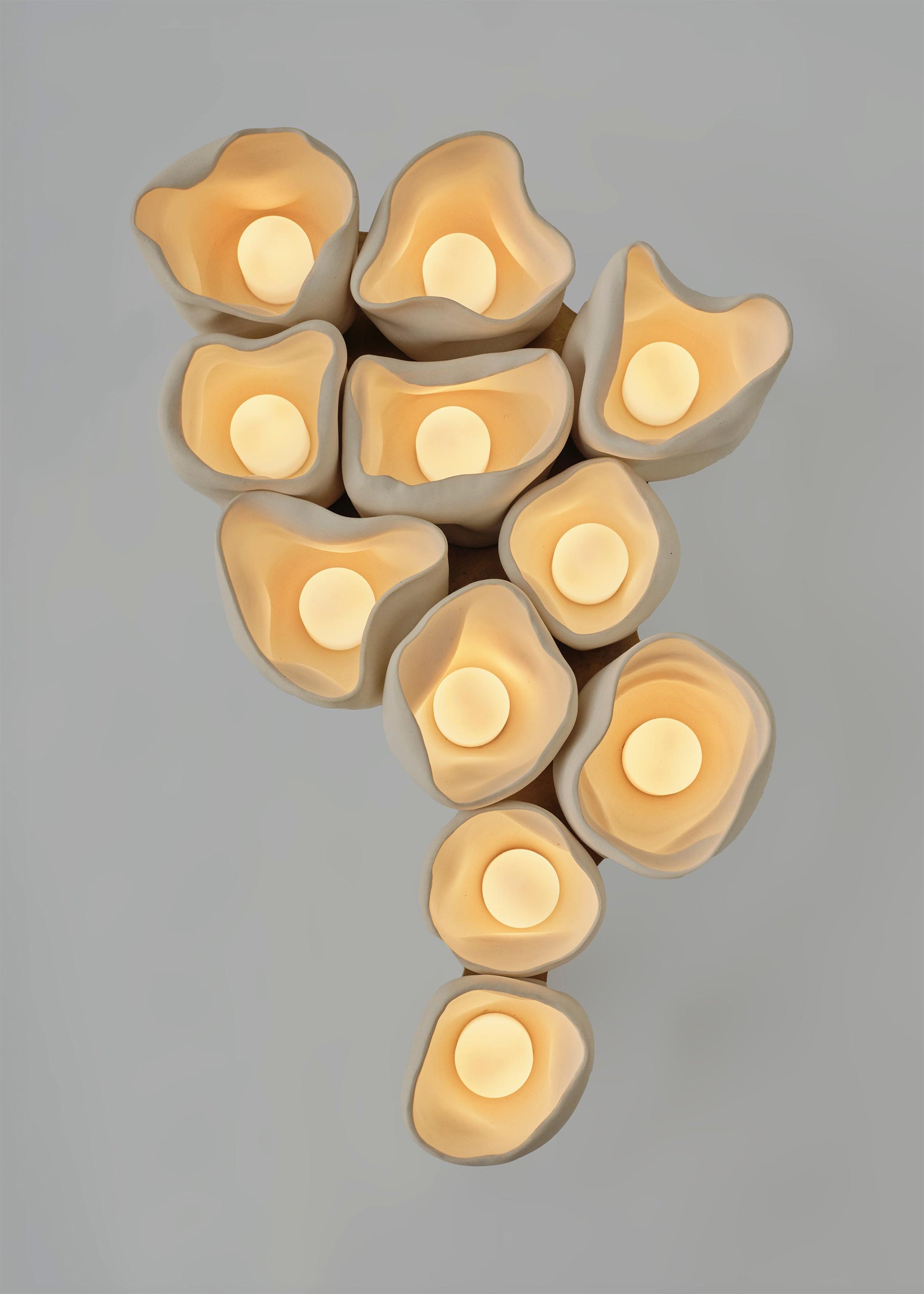 The apothecium, or “cup fungi,” serves as the central motif for the series. These forms, both delicate and robust, are reimagined as vessels for illumination, their contours inviting light to radiate outward in soft, glowing arcs. The interplay between natural ceramic surfaces and patinated brass evokes a tactile dialogue between earthiness and refinement. Each work juxtaposes organic irregularity with precise functionality, inviting contemplation on composition and decomposition, form and deformation, flourishing and decay