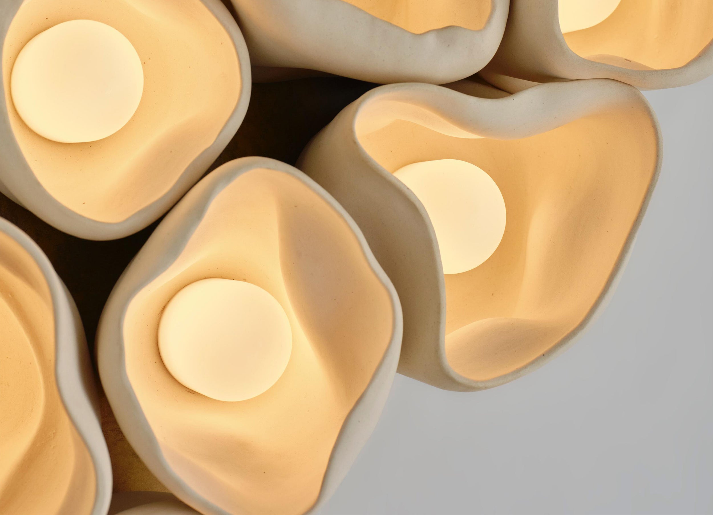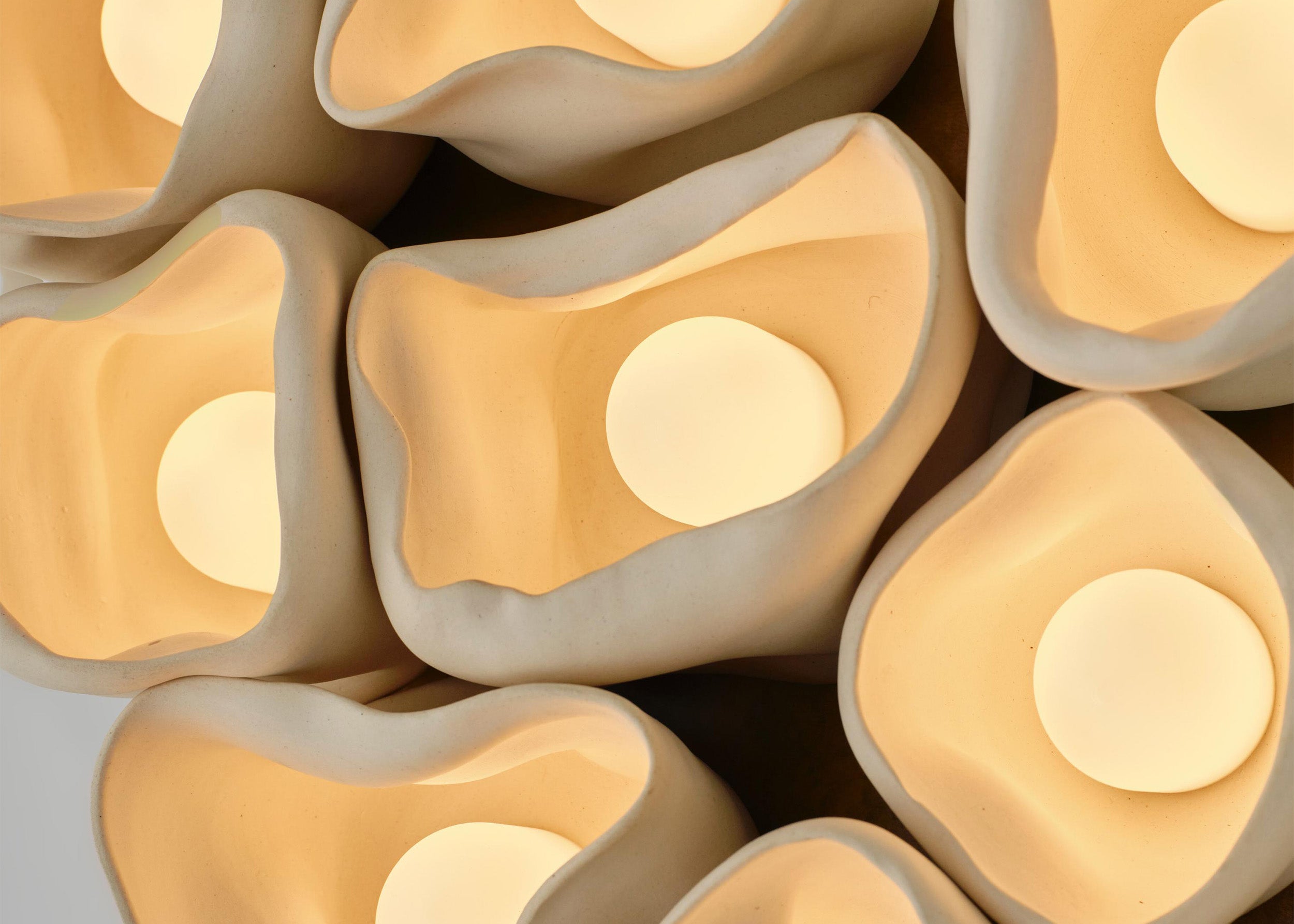 An evocative exploration of nature’s cycle of death and renewal, Vessels captures the transient beauty of natural decay while celebrating the enduring power of light as a source of life and inspiration. In this sculptural lighting series in handcrafted ceramic and brass, Nader Gammas challenges traditional notions of lighting design by embracing imperfection and individuality. Drawing inspiration from Gammas’ encounters with fallen trees in the Blue Hills Reserve of Massachusetts, the series translates the life that flourishes in decay—particularly fungi of the Sarcoscypha genus—into sculptural light objects