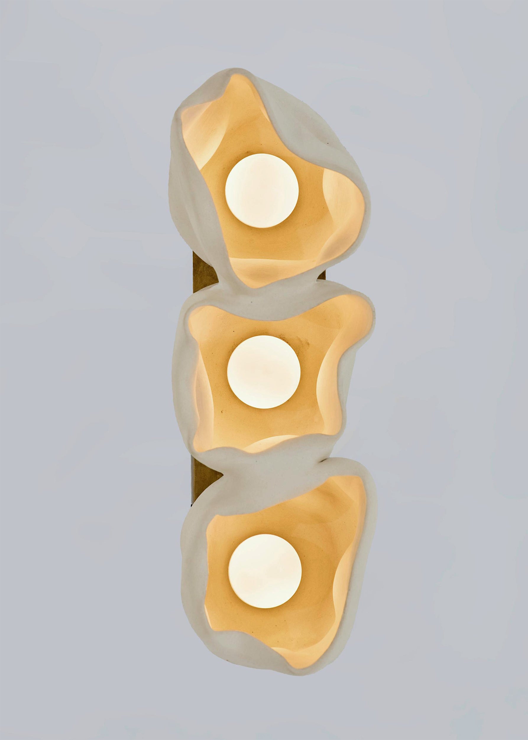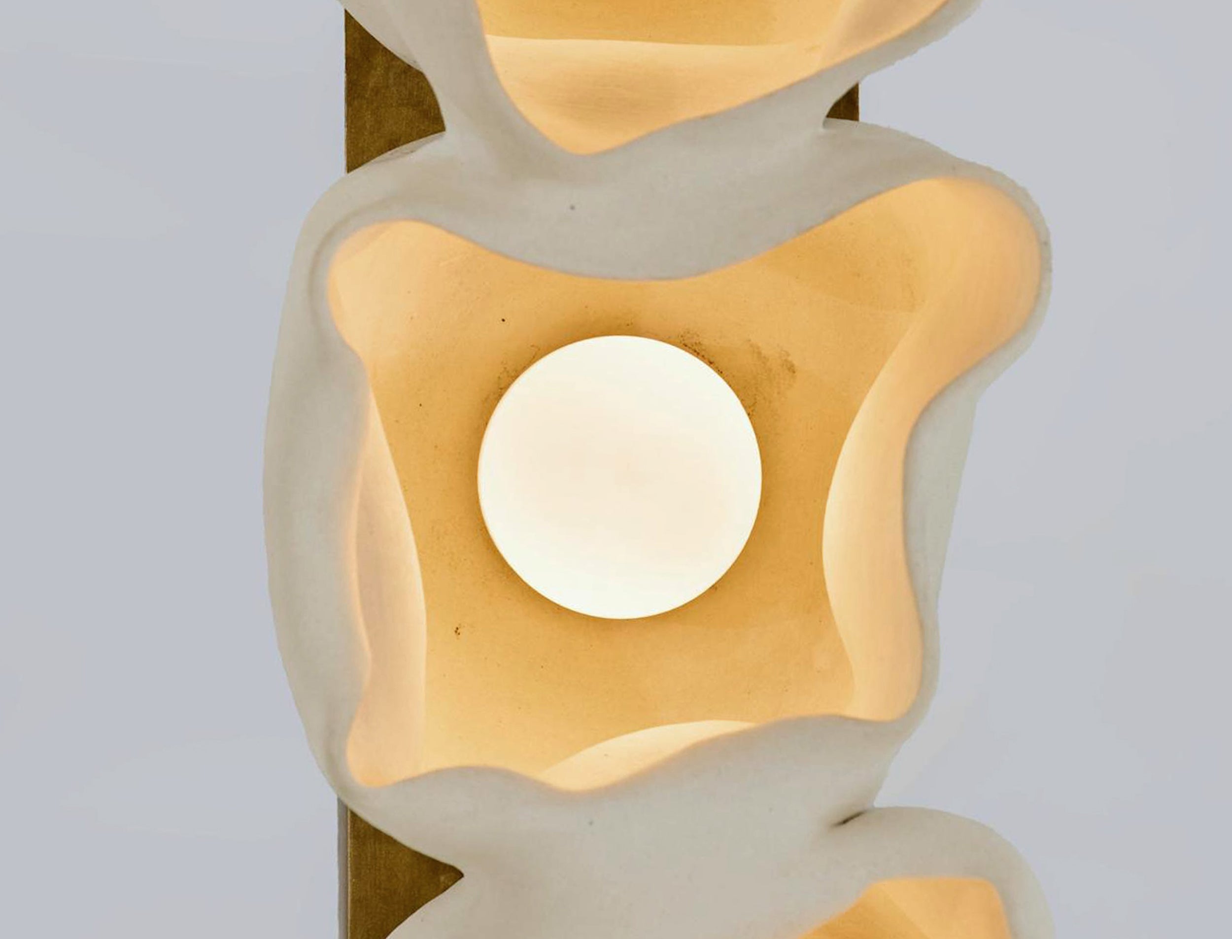 An evocative exploration of nature’s cycle of death and renewal, Vessels captures the transient beauty of natural decay while celebrating the enduring power of light as a source of life and inspiration. In this sculptural lighting series in handcrafted ceramic and brass, Nader Gammas challenges traditional notions of lighting design by embracing imperfection and individuality. Drawing inspiration from Gammas’ encounters with fallen trees in the Blue Hills Reserve of Massachusetts, the series translates the life that flourishes in decay—particularly fungi of the Sarcoscypha genus—into sculptural light objects