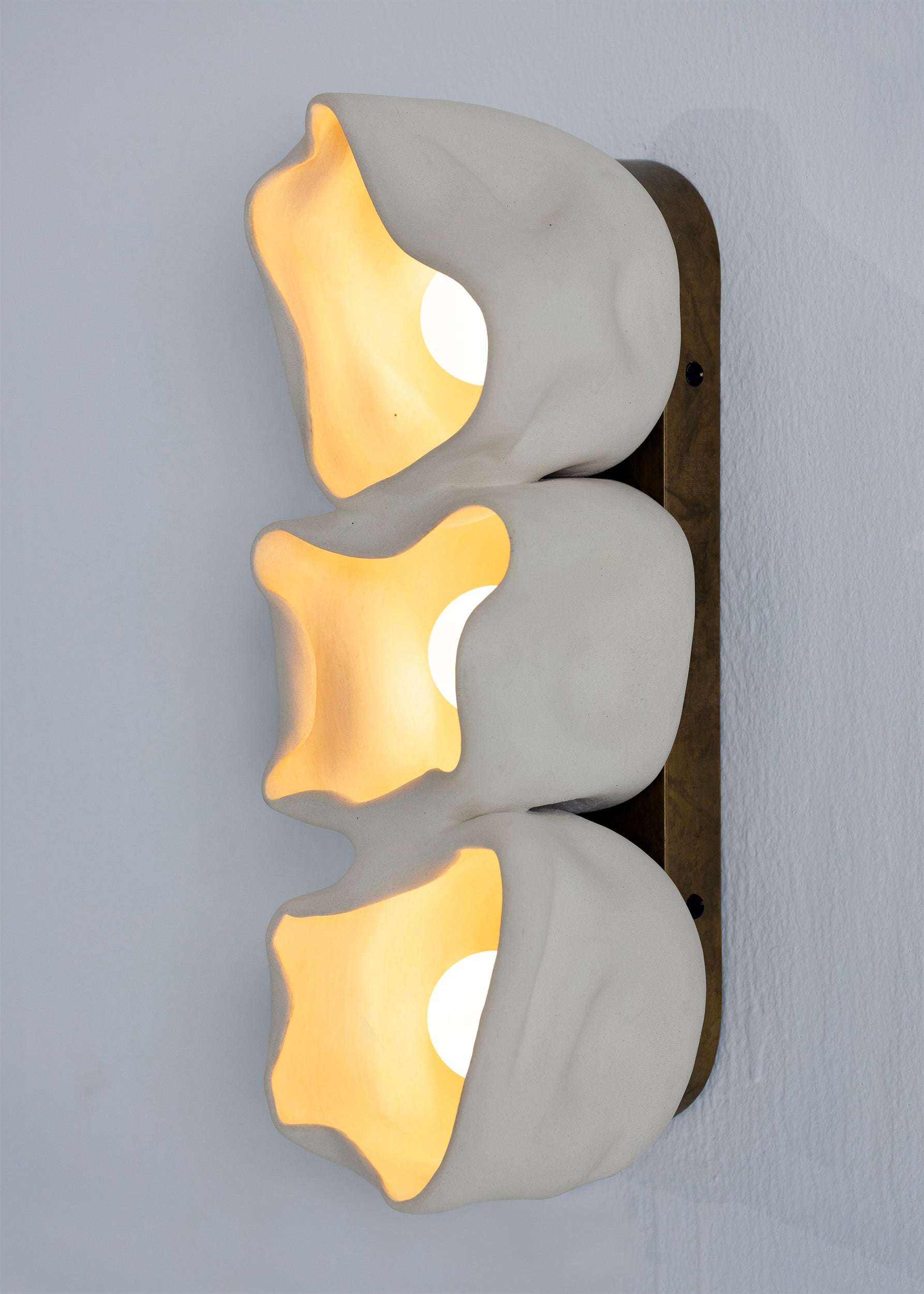 The apothecium, or “cup fungi,” serves as the central motif for the series. These forms, both delicate and robust, are reimagined as vessels for illumination, their contours inviting light to radiate outward in soft, glowing arcs. The interplay between natural ceramic surfaces and patinated brass evokes a tactile dialogue between earthiness and refinement. Each work juxtaposes organic irregularity with precise functionality, inviting contemplation on composition and decomposition, form and deformation, flourishing and decay