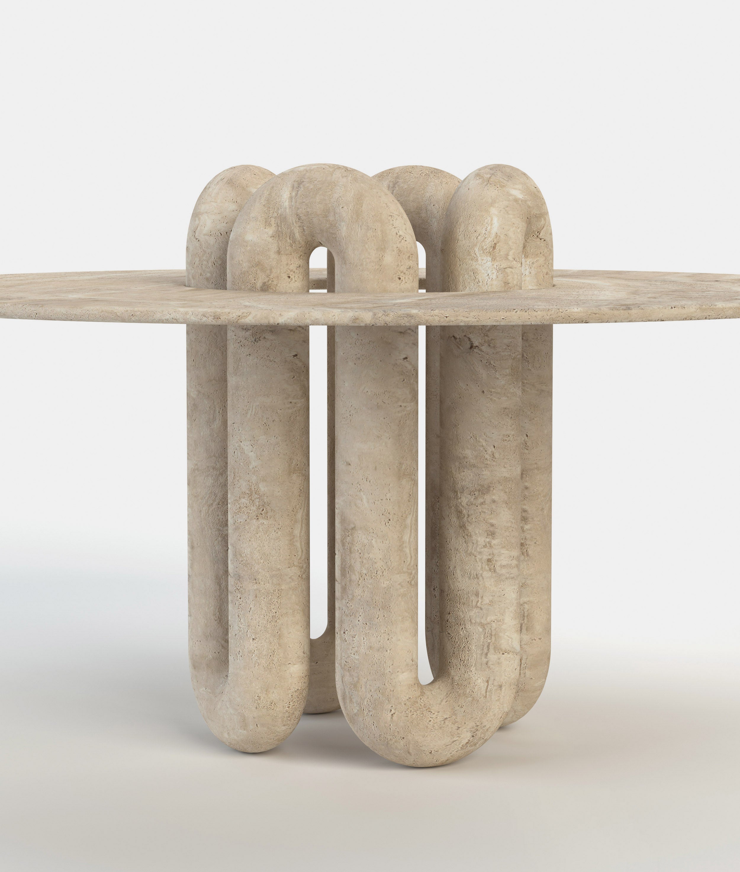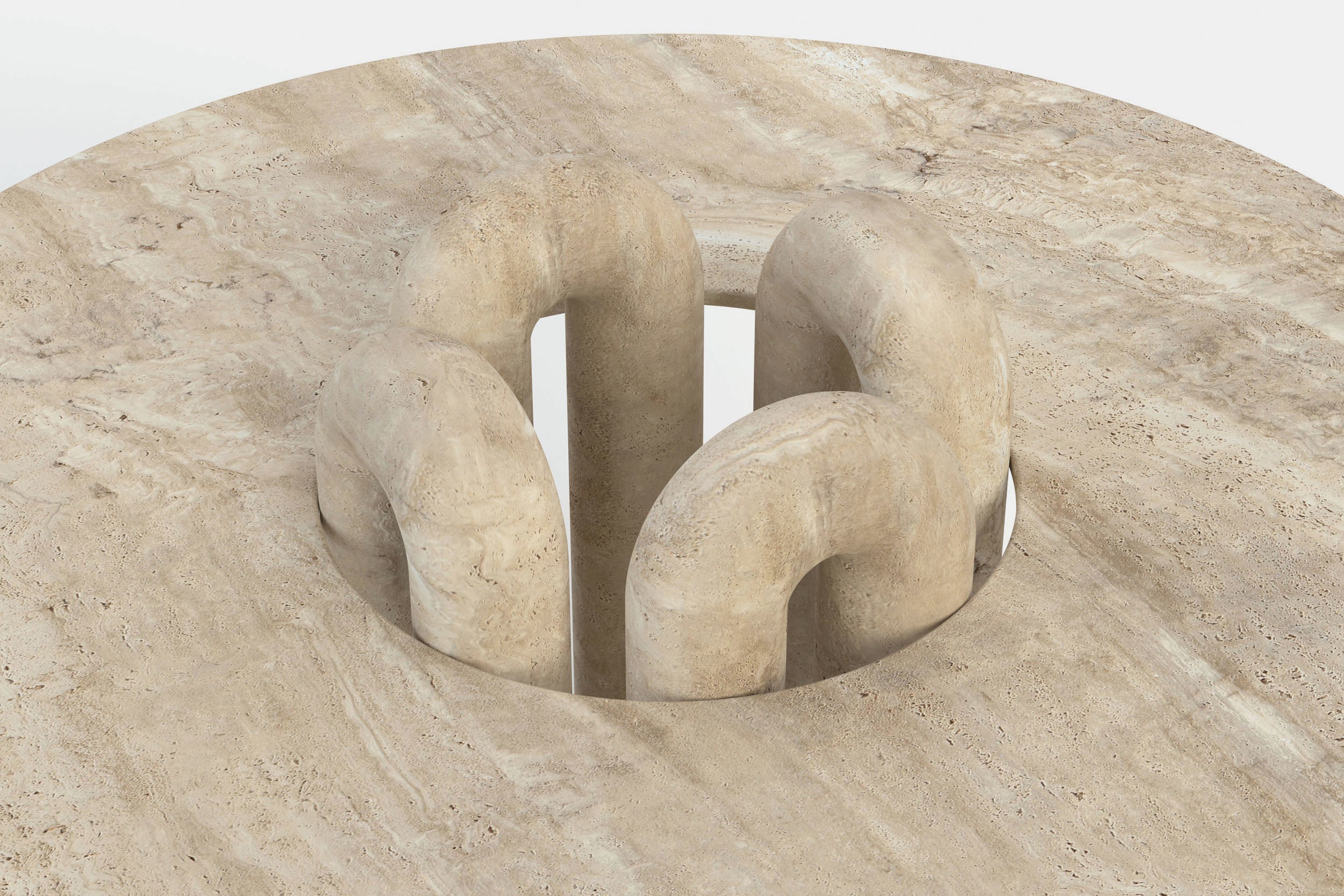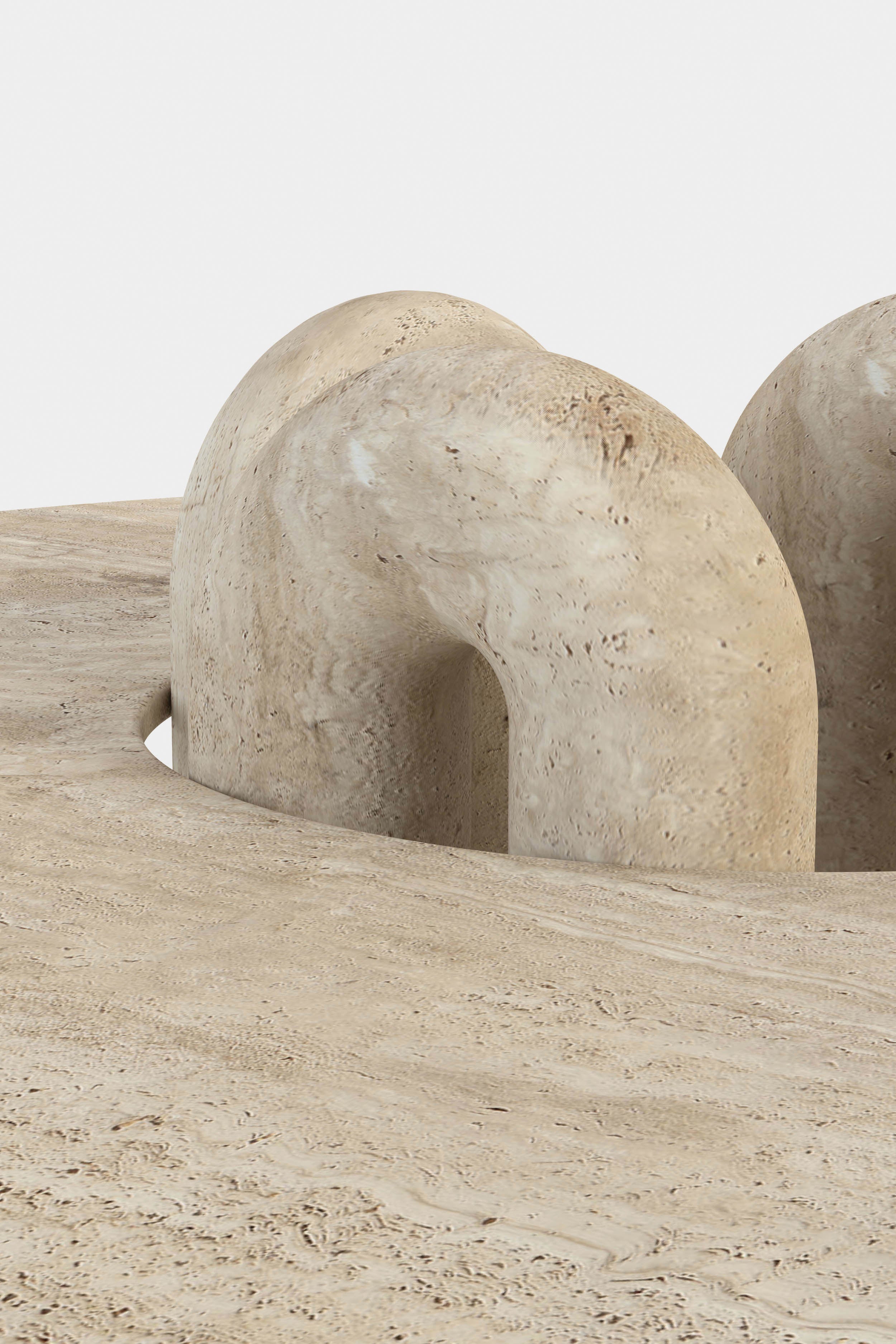 A bravura display of design ingenuity and excellence in stonemasonry, each universe table is crafted in turkey from travertine, the storied limestone synonymous with monumental design. The base and tabletop are each exquisitely carved and finished from a single piece of travertine that merge to create pieces that are absolutely timeless in their grace and majesty. Bold in vision and flawless in execution, the UNIVERSE COLLECTION is exclusive to studiotwentyseven