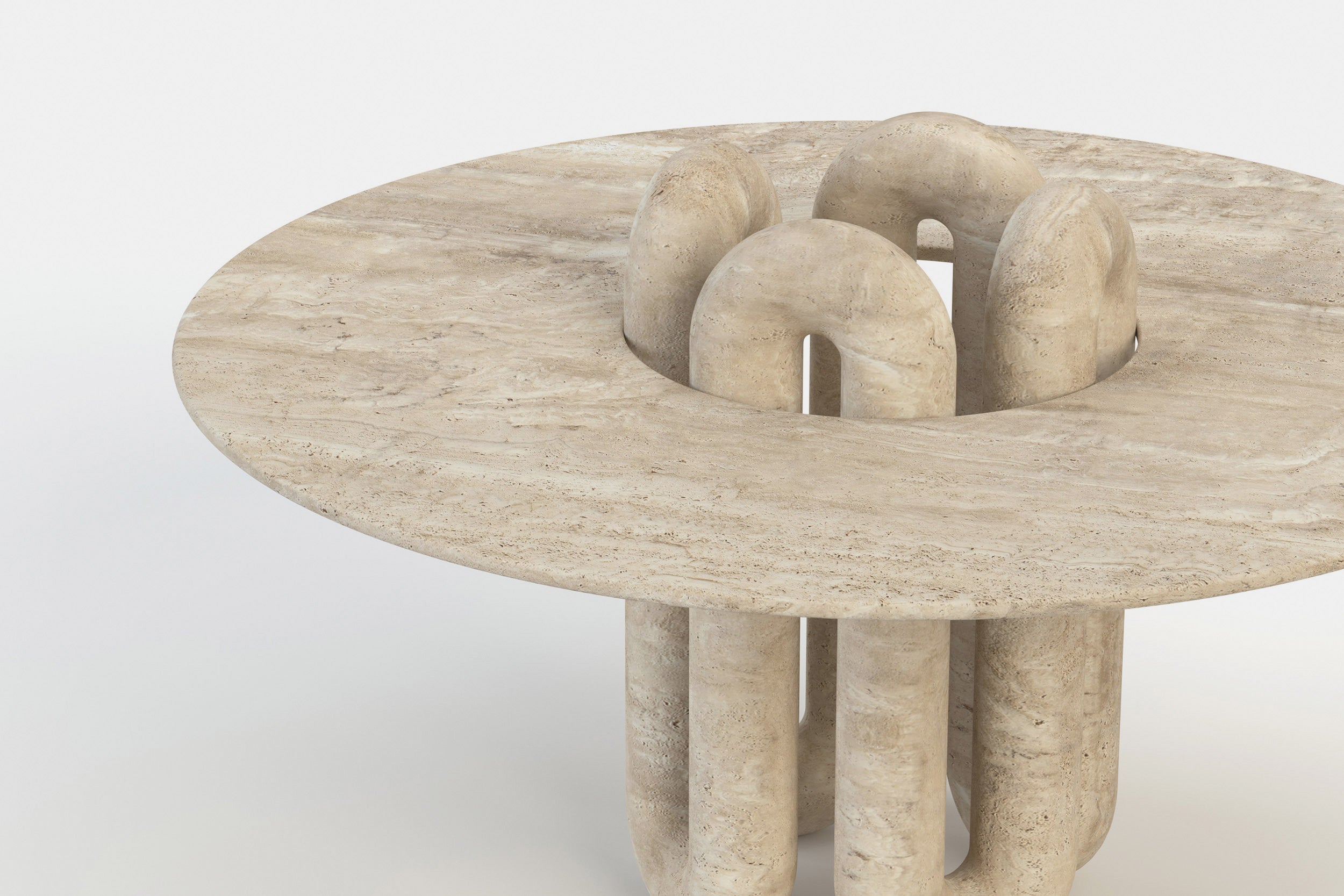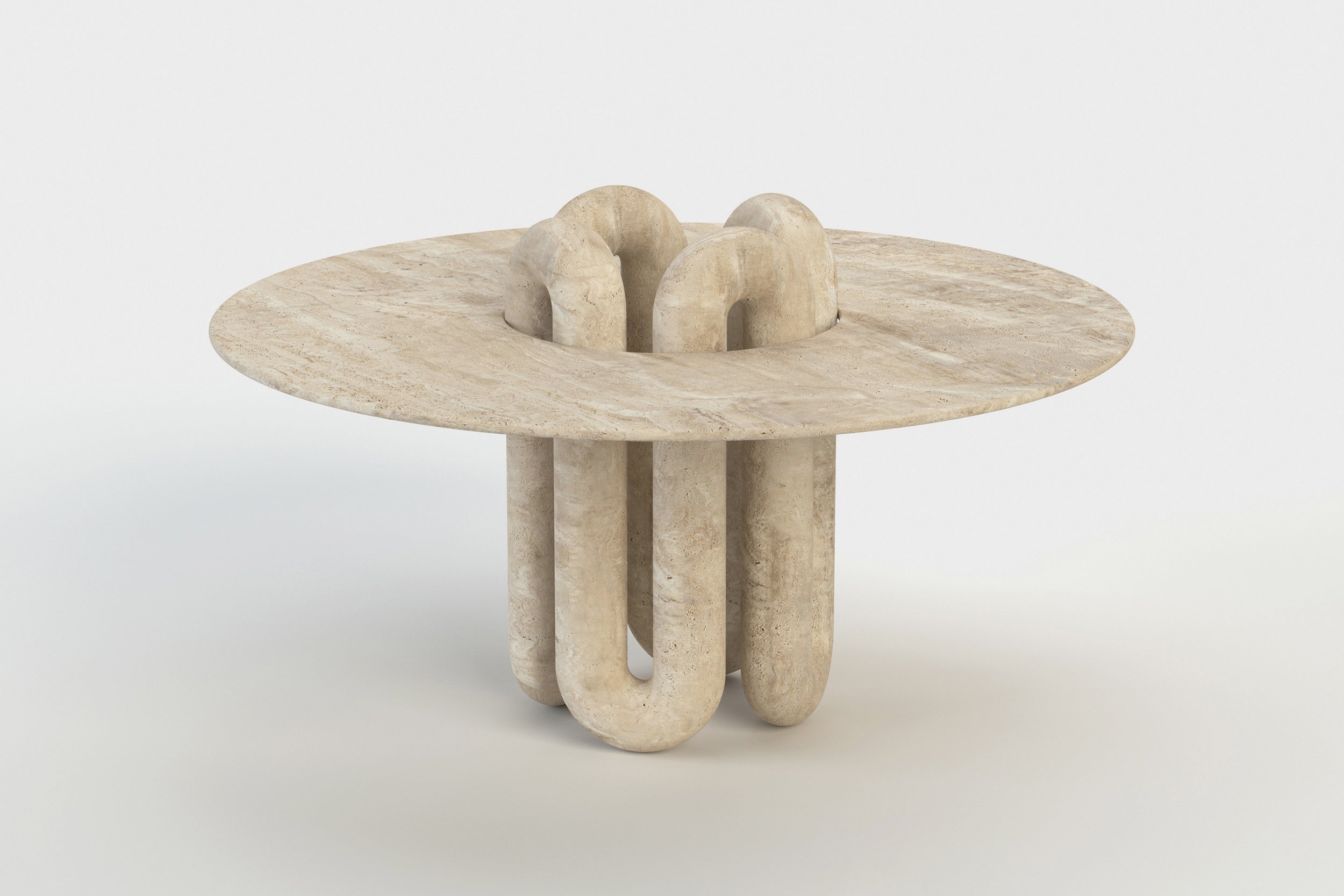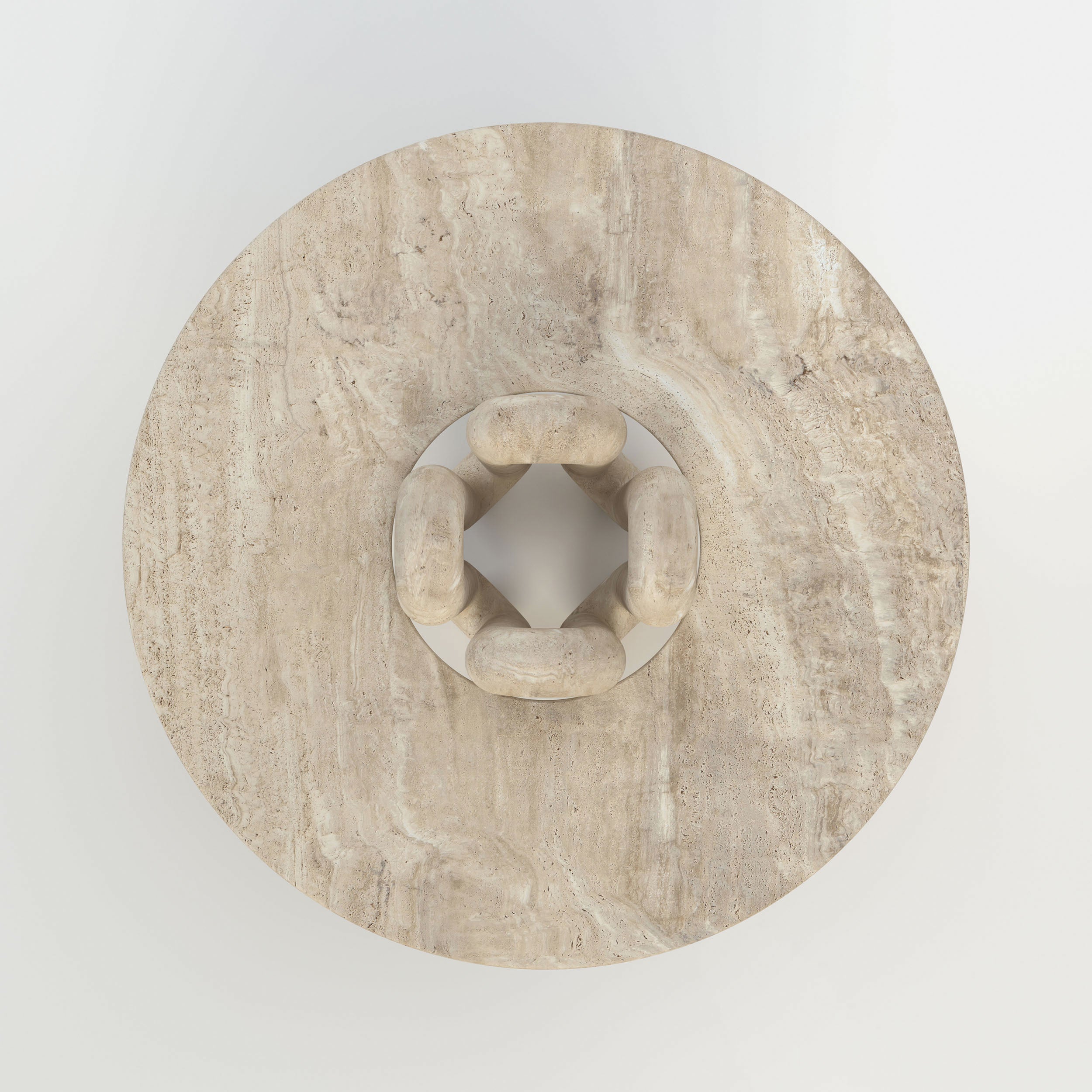 A bravura display of design ingenuity and excellence in stonemasonry, each universe table is crafted in turkey from travertine, the storied limestone synonymous with monumental design. The base and tabletop are each exquisitely carved and finished from a single piece of travertine that merge to create pieces that are absolutely timeless in their grace and majesty. Bold in vision and flawless in execution, the UNIVERSE COLLECTION is exclusive to studiotwentyseven