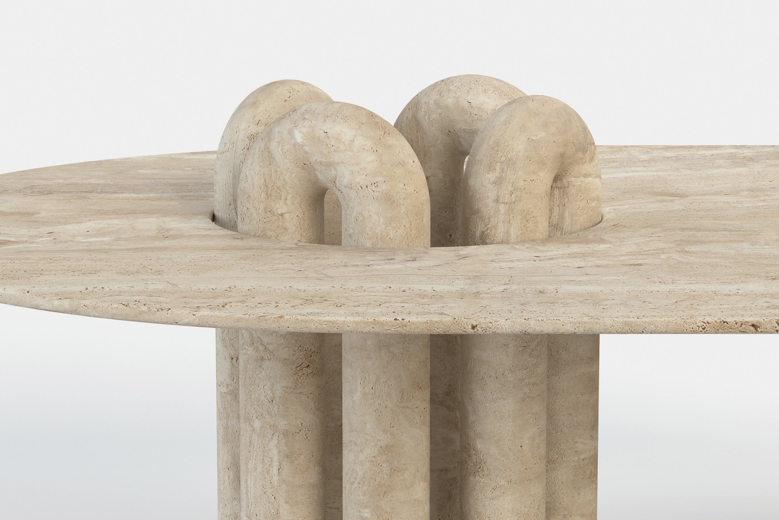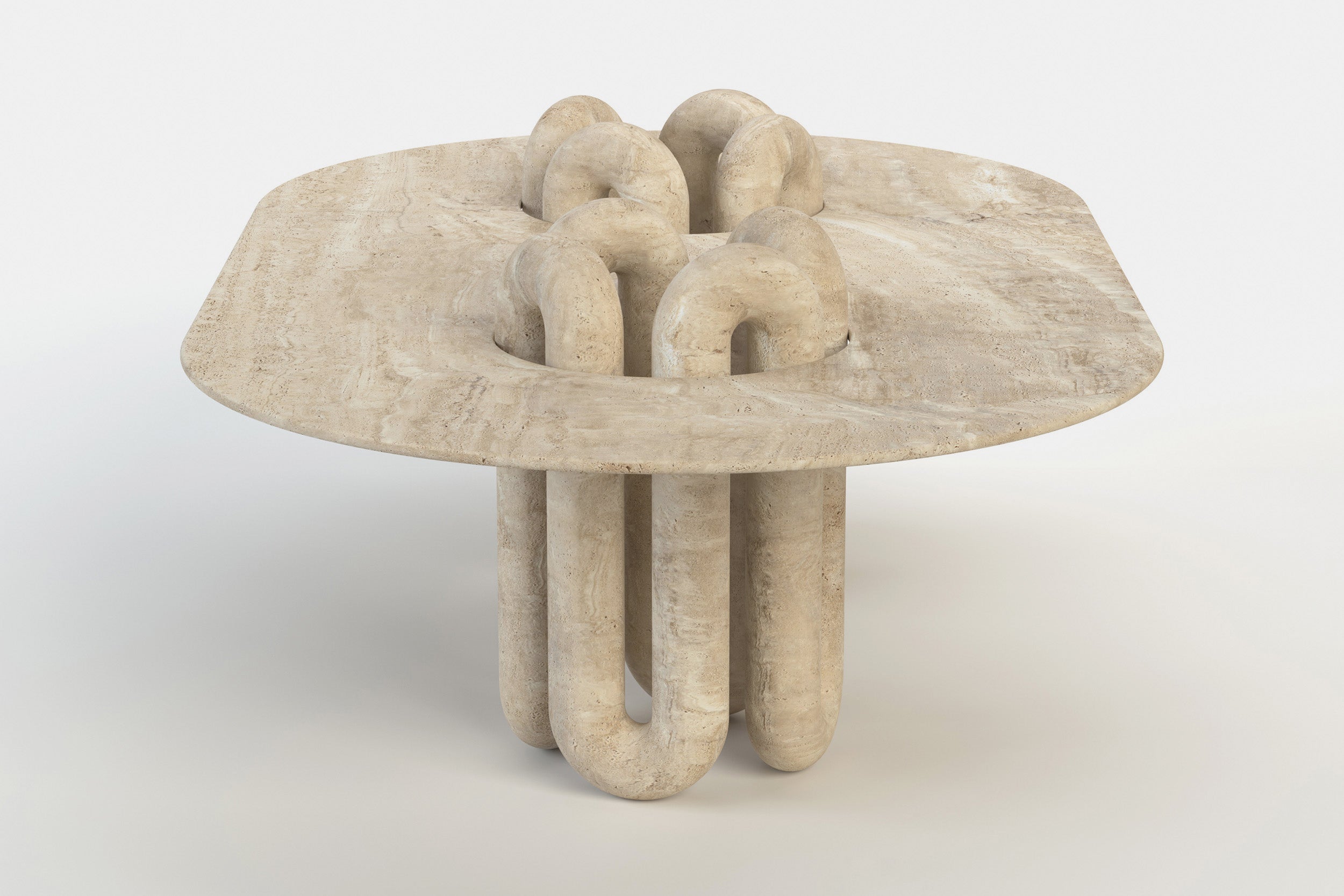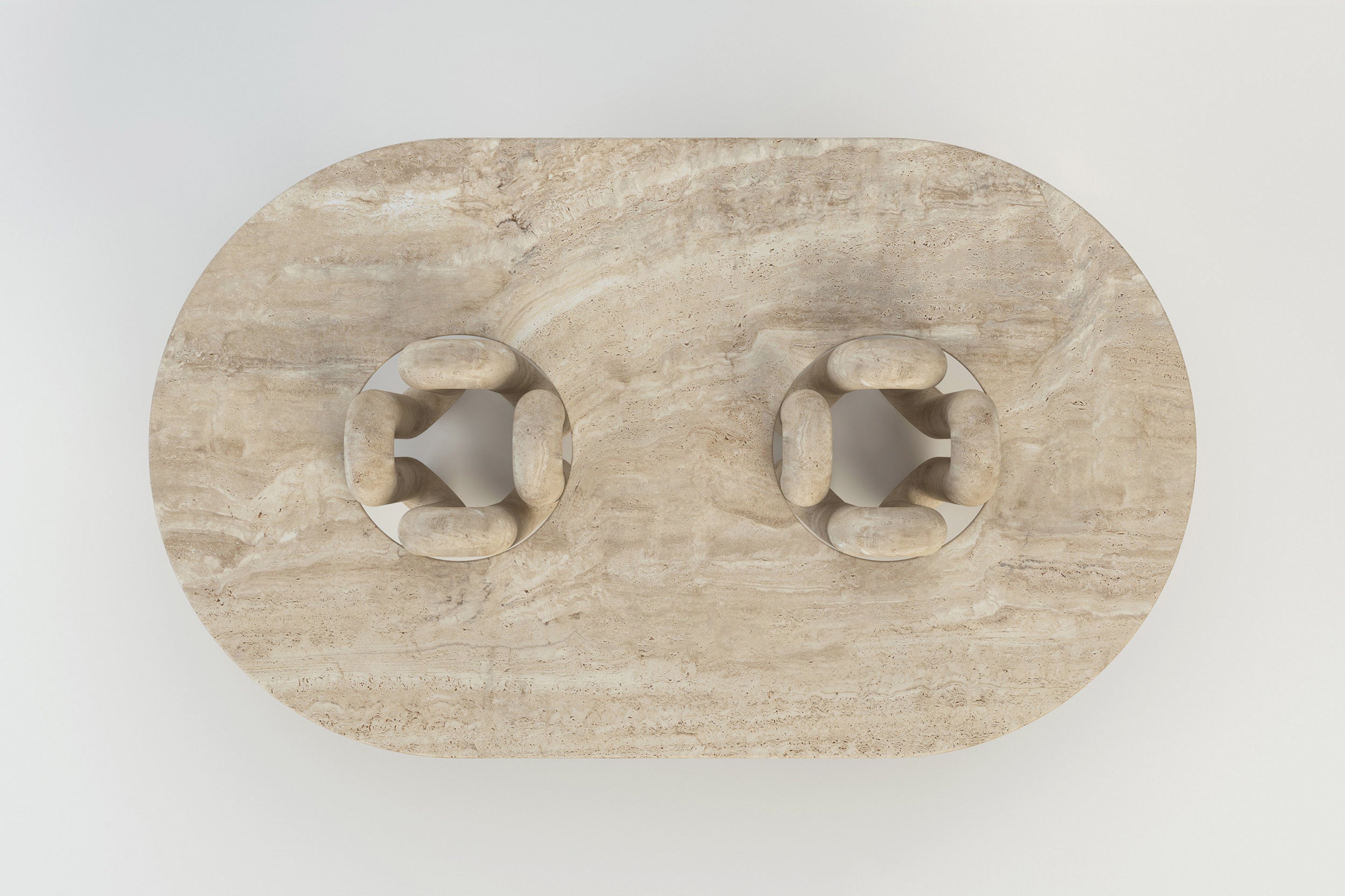 A bravura display of design ingenuity and excellence in stonemasonry, each universe table is crafted in turkey from travertine, the storied limestone synonymous with monumental design. The base and tabletop are each exquisitely carved and finished from a single piece of travertine that merge to create pieces that are absolutely timeless in their grace and majesty. Bold in vision and flawless in execution, the UNIVERSE COLLECTION is exclusive to studiotwentyseven