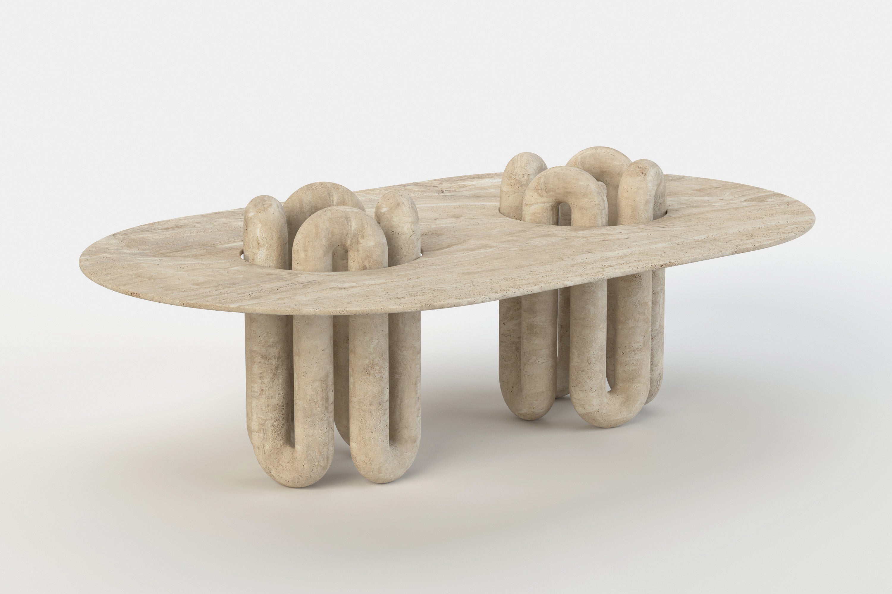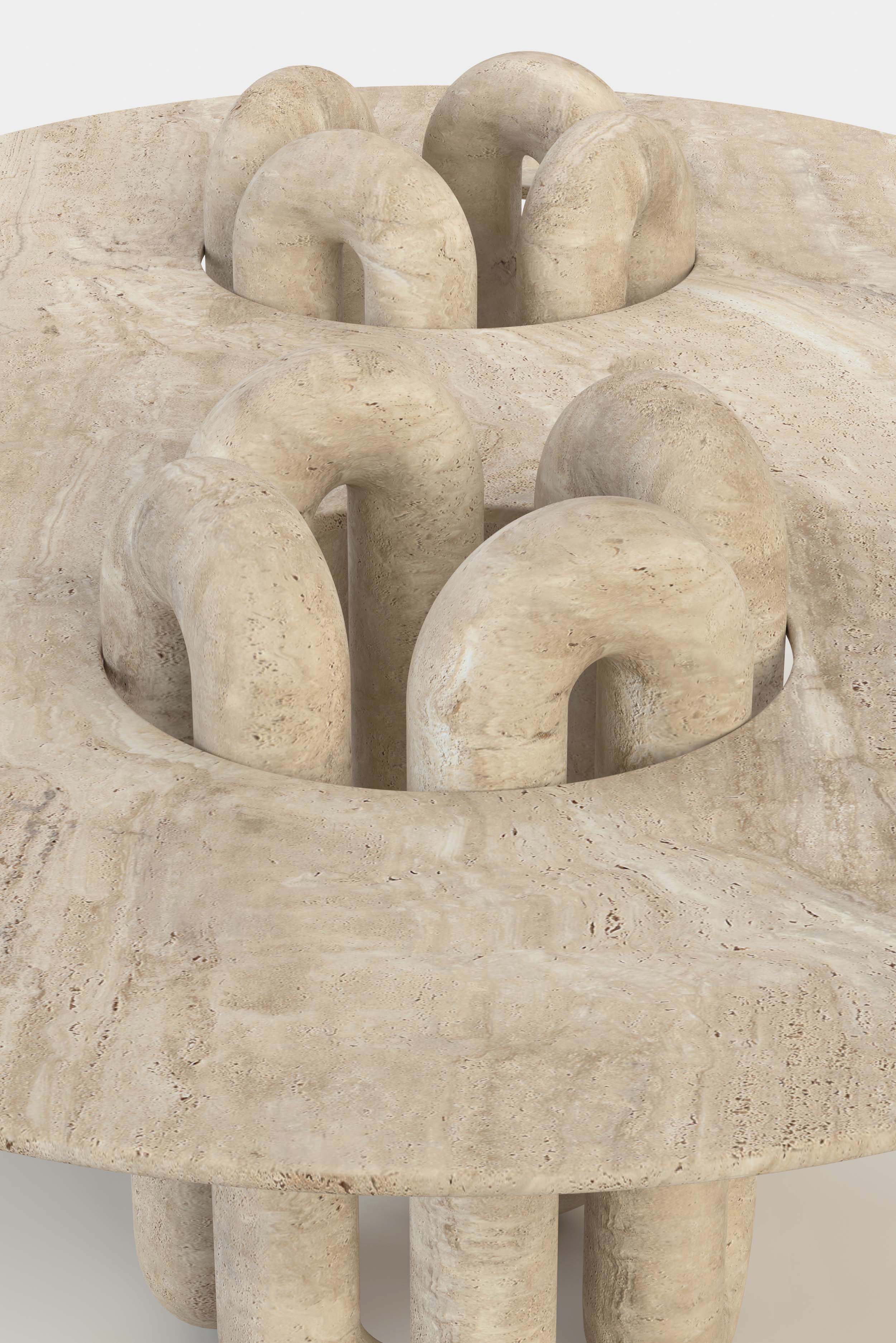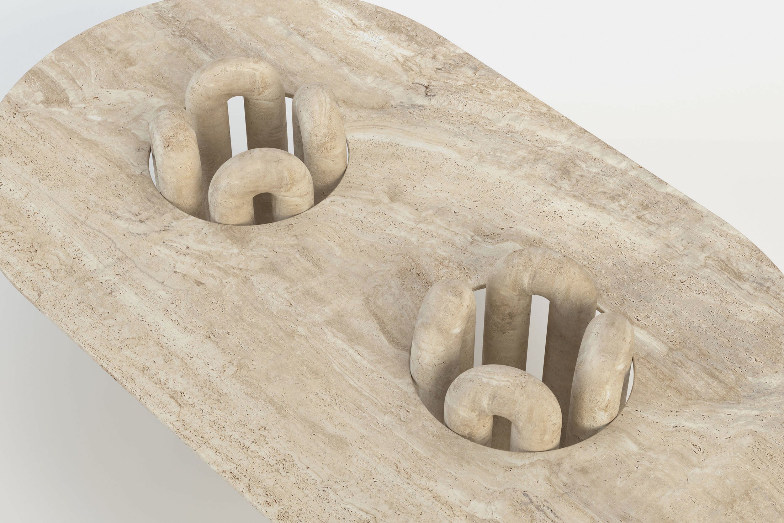 A bravura display of design ingenuity and excellence in stonemasonry, each universe table is crafted in turkey from travertine, the storied limestone synonymous with monumental design. The base and tabletop are each exquisitely carved and finished from a single piece of travertine that merge to create pieces that are absolutely timeless in their grace and majesty. Bold in vision and flawless in execution, the UNIVERSE COLLECTION is exclusive to studiotwentyseven