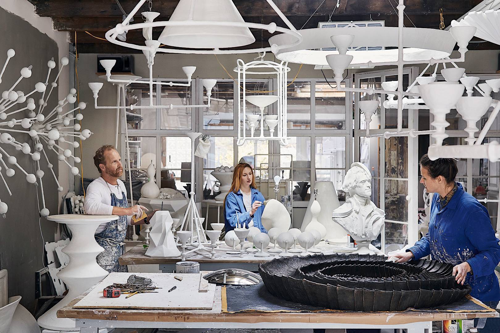 Crowned the master of plaster by Architectural Digest, celebrated plaster artisan Antonson has reintroduced the age-old medium to the interior design trade in his collection of furnishings, lighting, and accessories. Working out of his Brooklyn atelier, Antonson creates every piece by hand. He paints plaster onto his designs in layers with a brush, then meticulously sculpts and sands it repeatedly to achieve objects of surreal beauty. A classically trained sculptor and painter, the engaging designer taps into his broad knowledge of these disciplines to inform his work