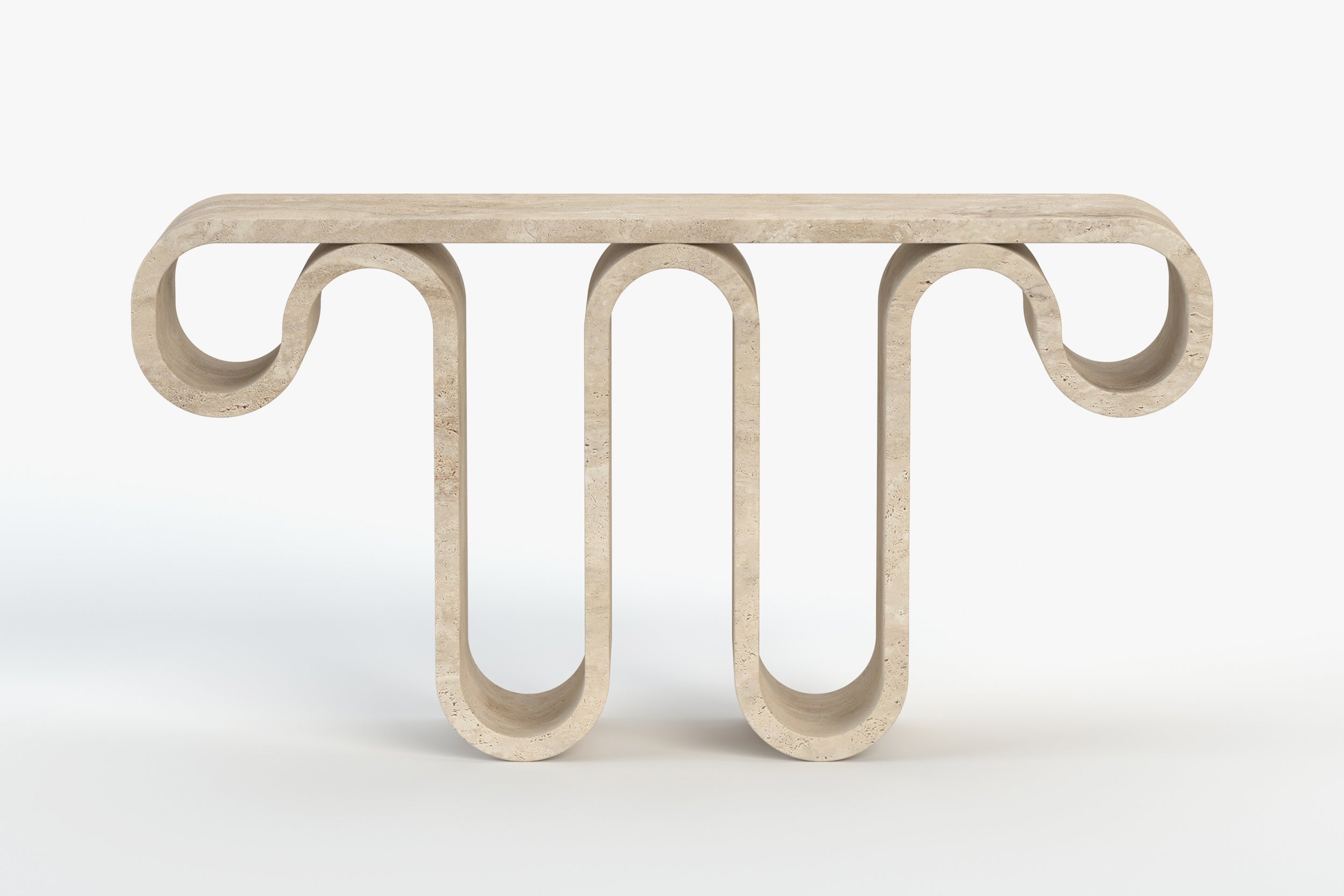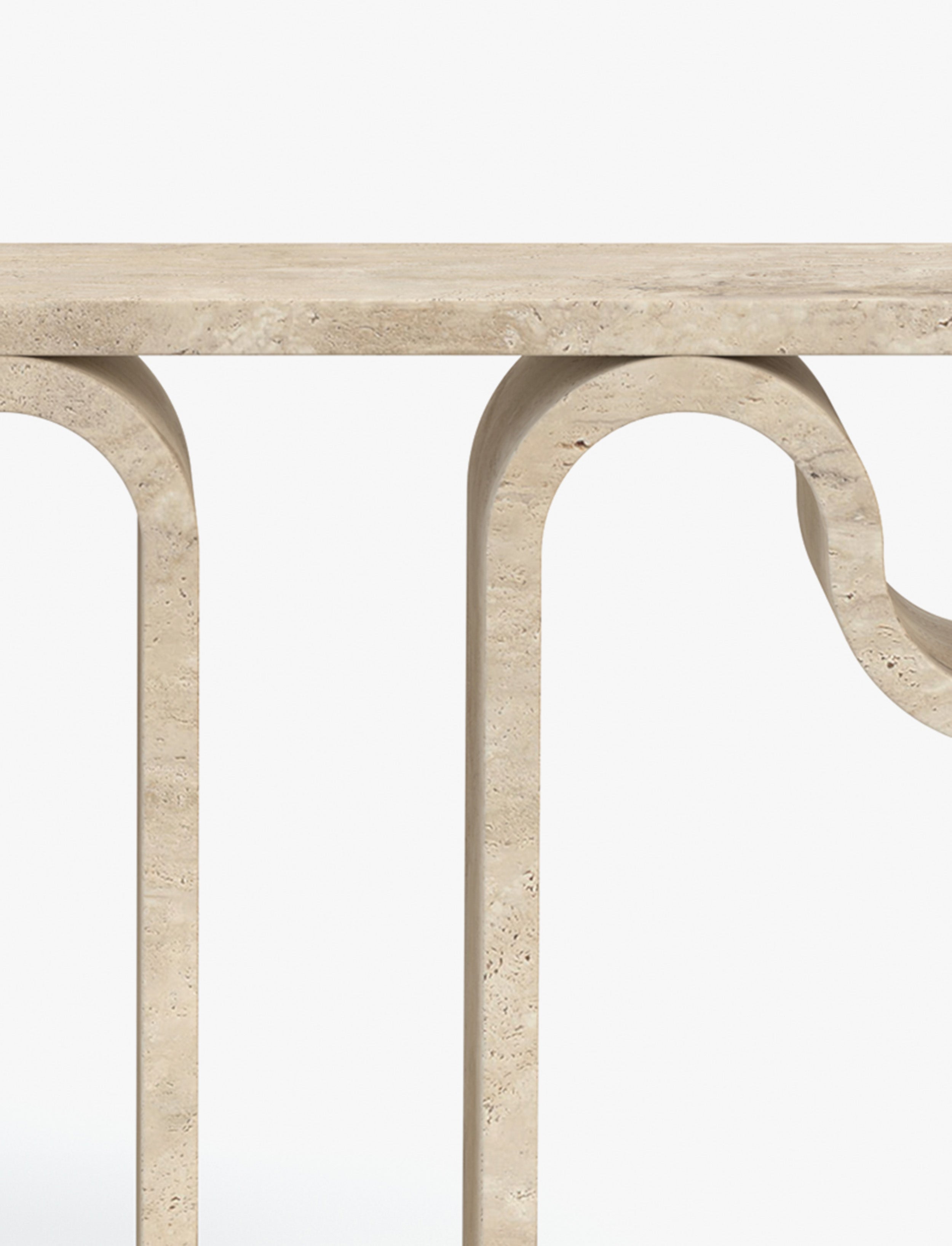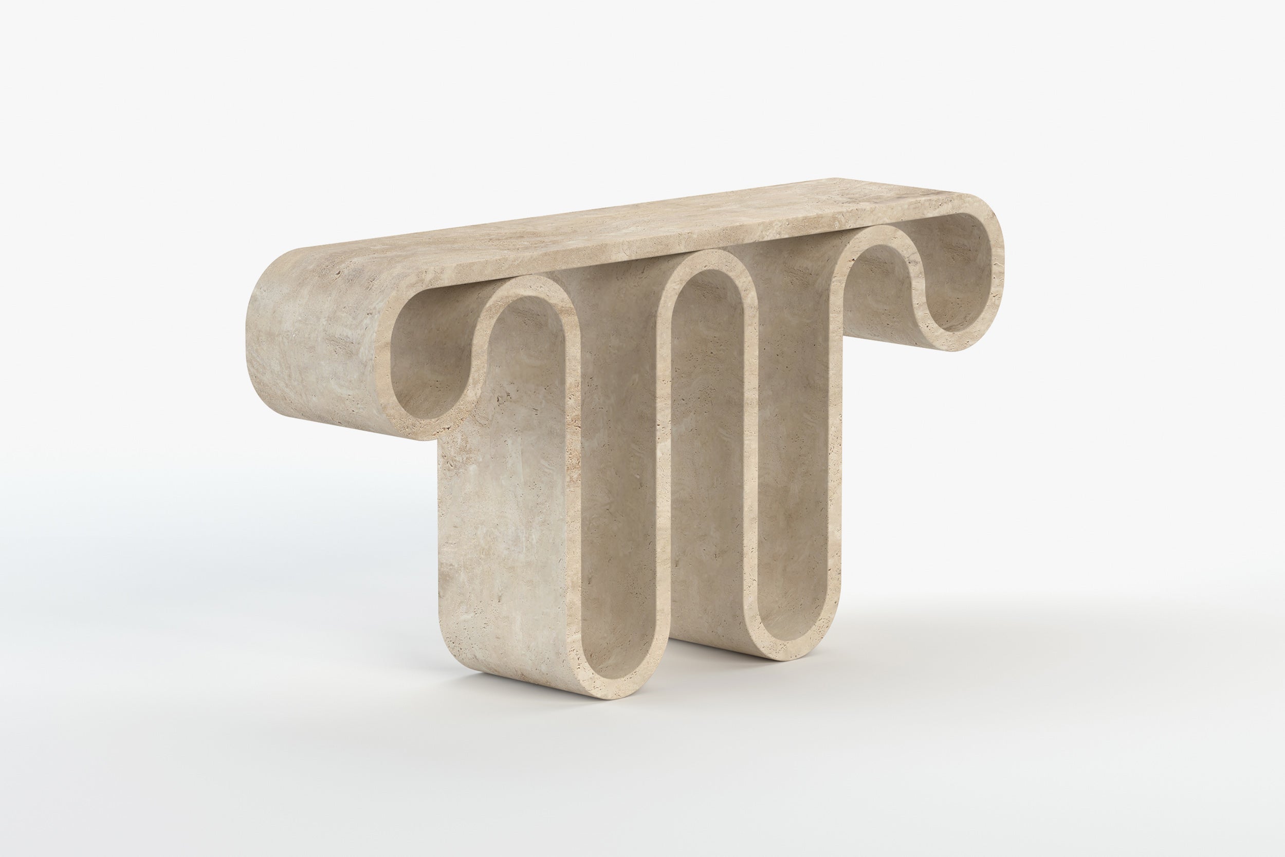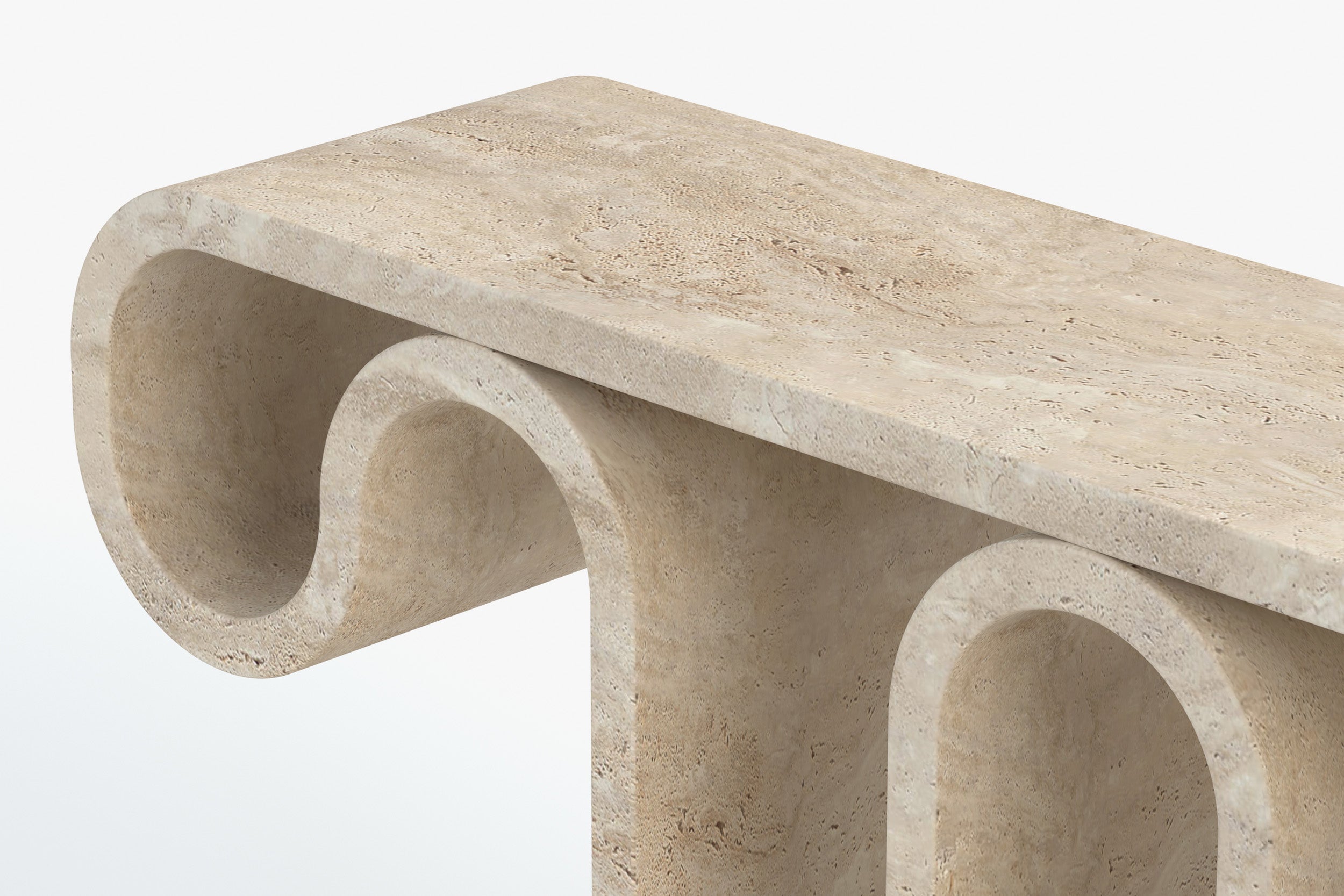 This journey highlights the remarkable materials yeniay has chosen for their elegance and endurance. The console and the bench are each available in three finishes: Lilac Marble, travertine, and stainless steel. Handcrafted in Turkey by exceptional artisans, the marble and travertine works are carved from a single piece of stone