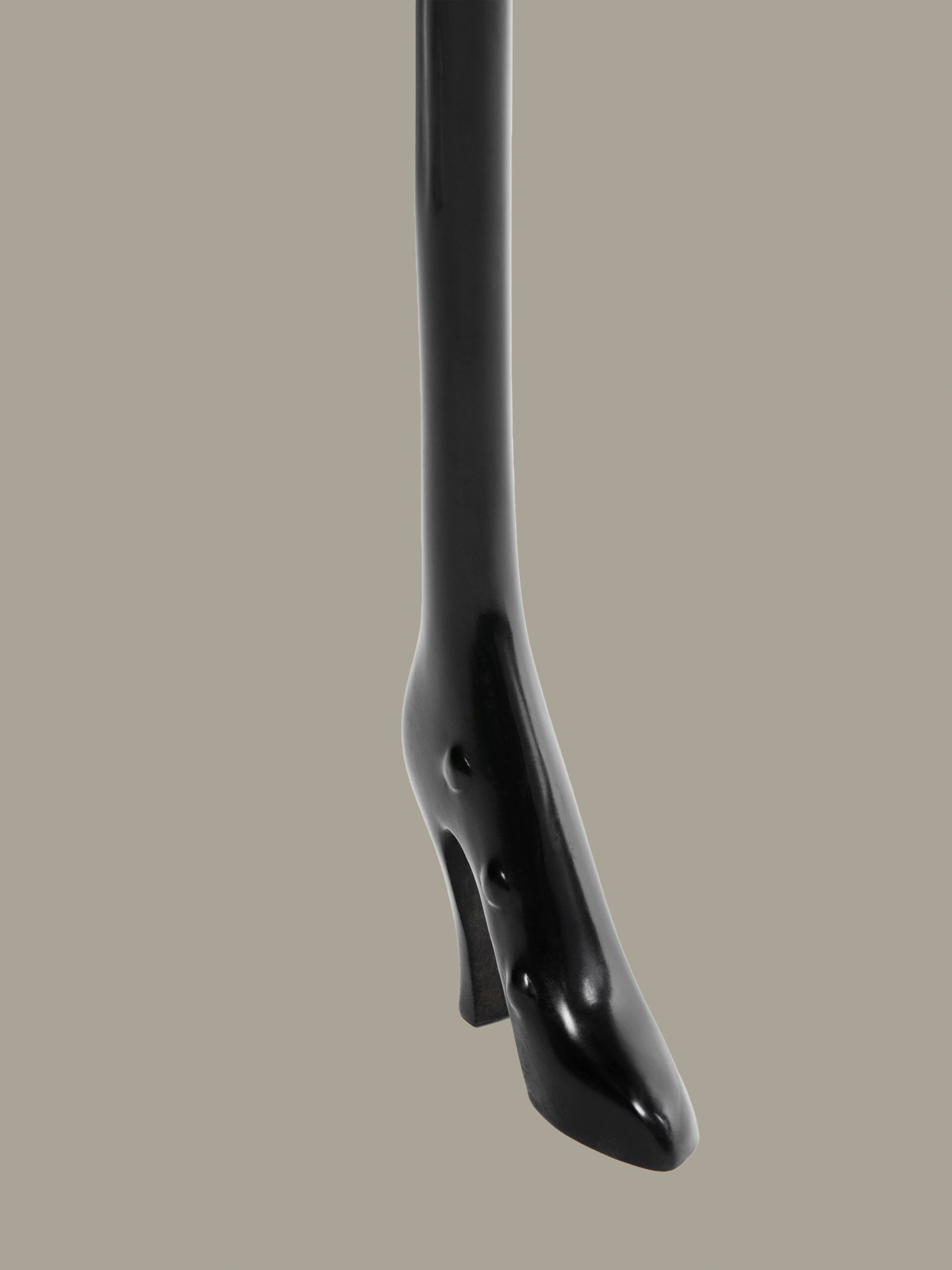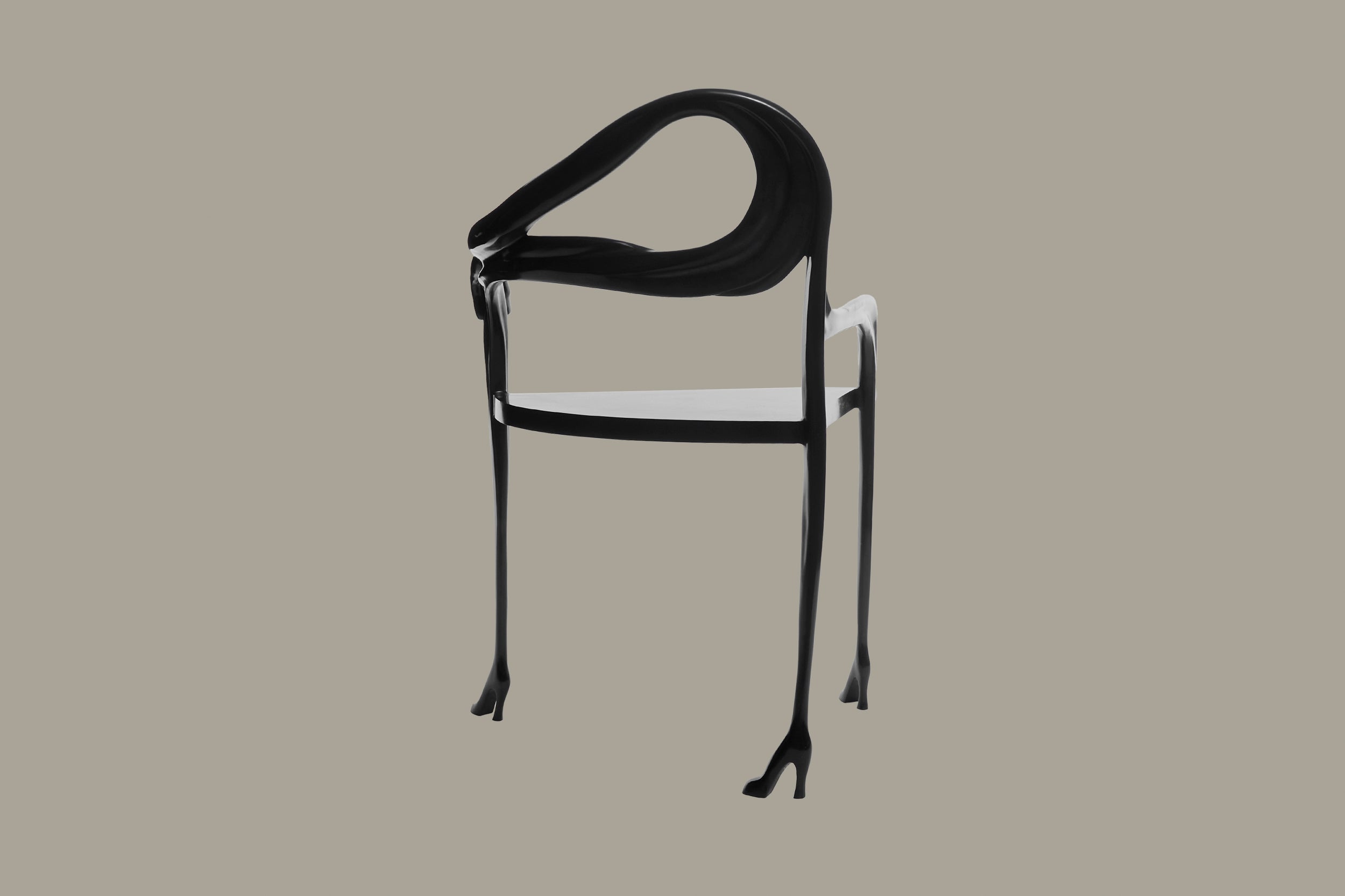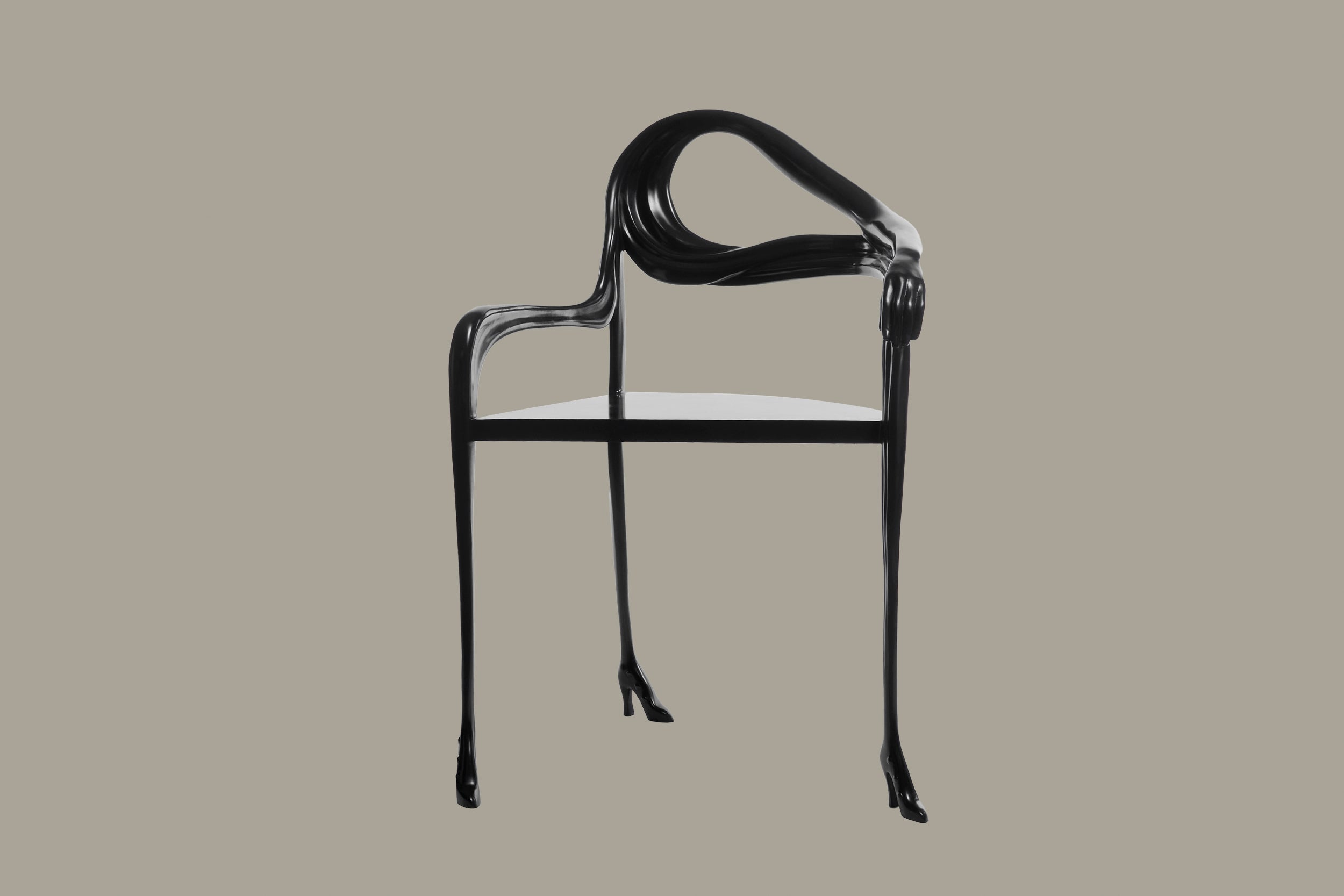 The design is directly inspired by Dalí’s painting Woman with a Head of Roses (1935), in which the female figure becomes a site of metamorphosis and symbolic tension. In LEDA, this imagery is brought into the three-dimensional world: a brass body shapes the seat, while an elongated arm curves around to form the backrest, terminating in a sculpted hand that clasps the armrest. The figure rests on three slender legs that taper downward into gleaming high heels, reinforcing the anthropomorphic presence of the piece