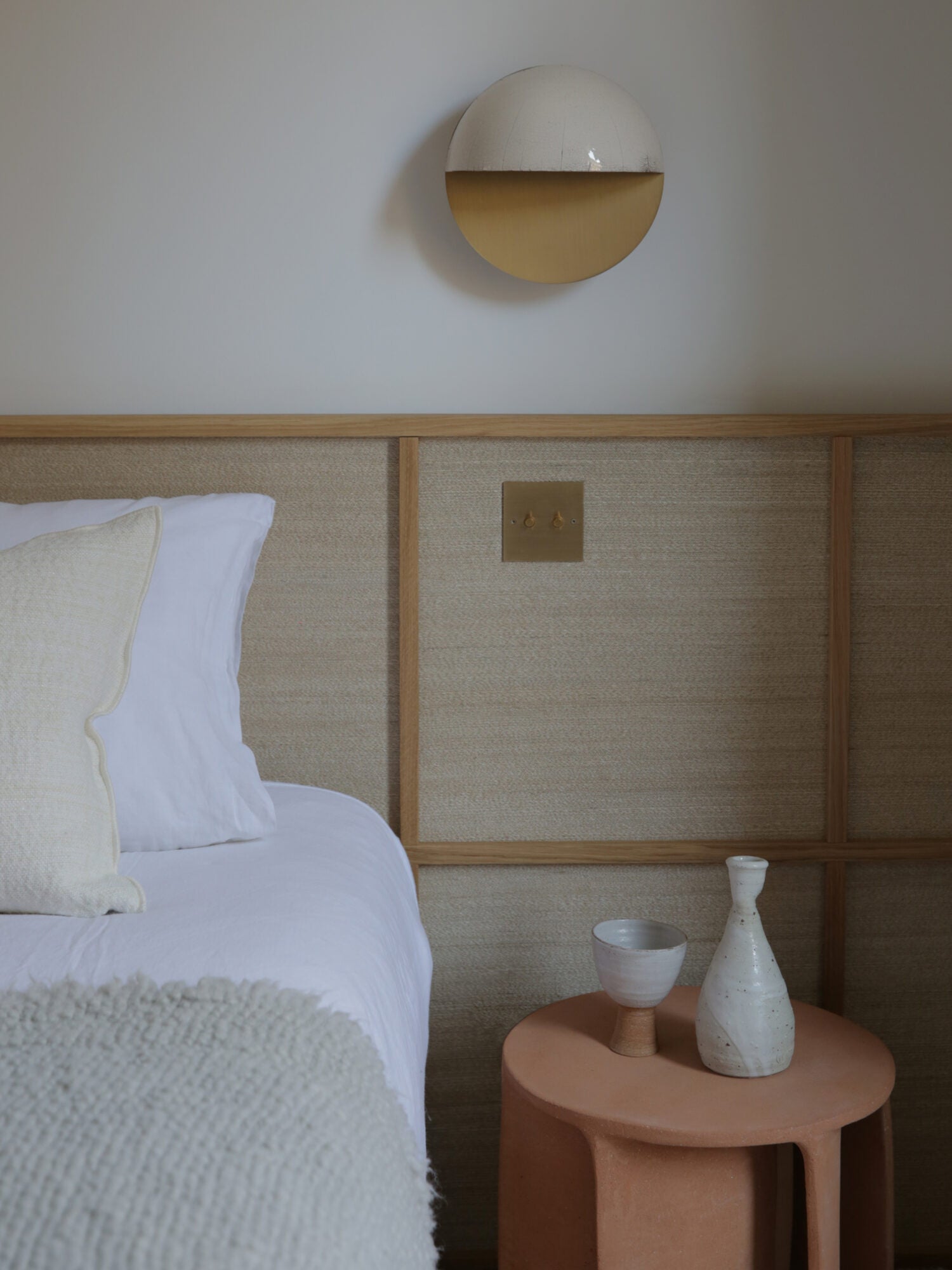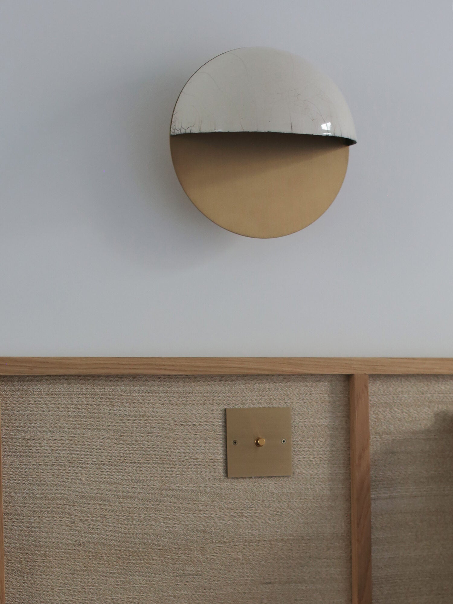 A contemporary wall sculpture, the Demi-Lune Sconce ingeniously shapes light and creates a dialogue between object, texture, and space. Aptly named, the ceramic’s gentle sheen against the brass’s earthy matte recalls the romantic splendor of a half-moon. It invites us to reflect on our place in the cosmos and on the very nature of darkness and light. With a simple elegance and enduring textural story, the Demi-Lune Sconce, like the moon itself, is a stunning accent to any space