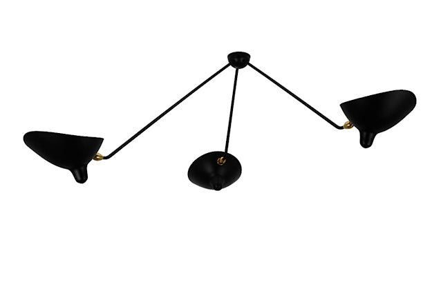 Serge Mouille's insect-like designs from the 1950's were created as a reaction to heavier, clunkier Italian designs of the time. Serge Mouille wanted to create a modern lighting fixture that had delicate lines and a stunning visual presence. The Three-Arm Spider Wall Sconce is one of Serge's most versatile lamps. With arms that reach 16", 34" and 43", light can be projected to many different parts of the room. Further, each shade has independent rotation to allow for further flexibility. Switches for each arm are located on the base of the lamp. Arms can be rotated to a variety of positions