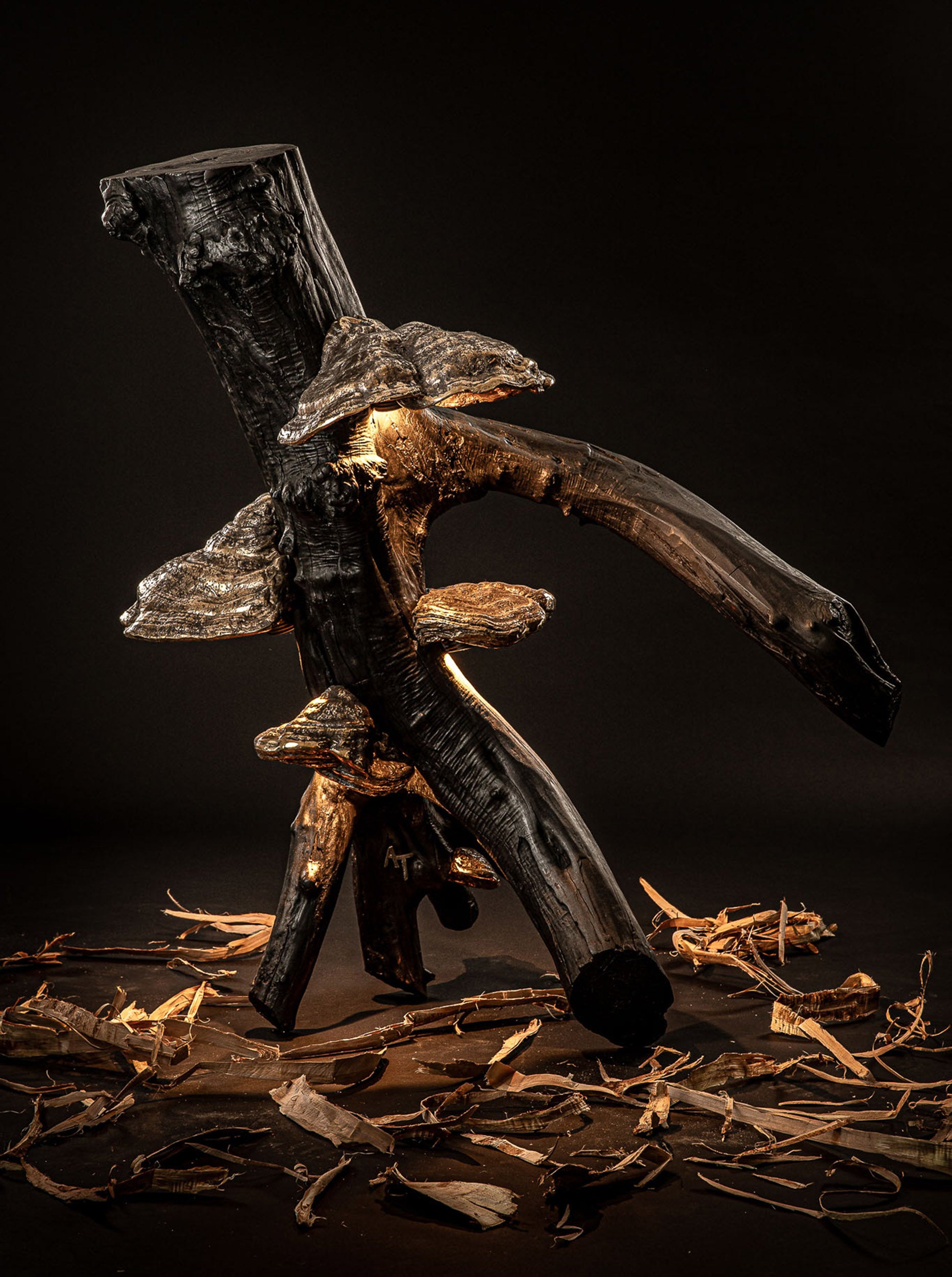 The miracle of light transforms that fragility into strength. The fungi, often seen as a sign of a tree’s demise, are elevated to symbols of resilience and continuity. The luminous quality of these works reveals a powerful visual and philosophical contrast: that light can only emerge from the darkness